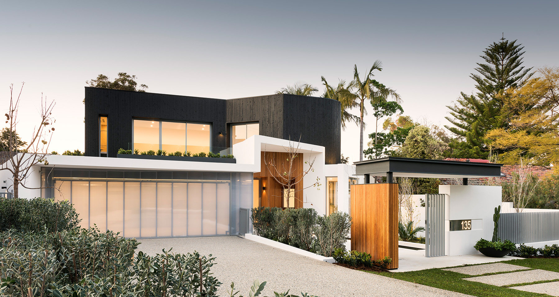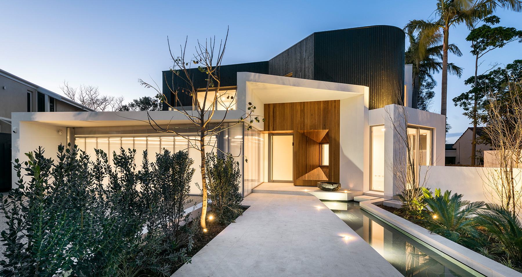 “The sensual form and warm textures of the upper level contrast beautifully with the white rendered, angular canopy framing the front door and creating a dramatic entry statement.