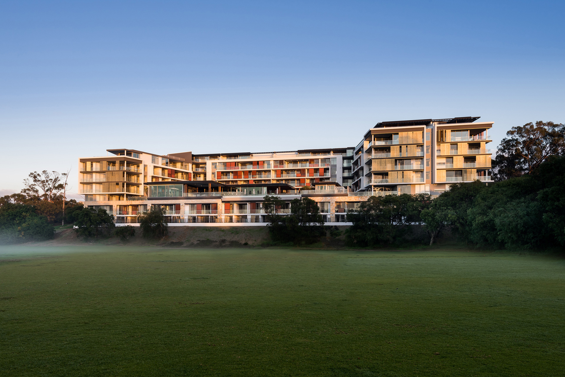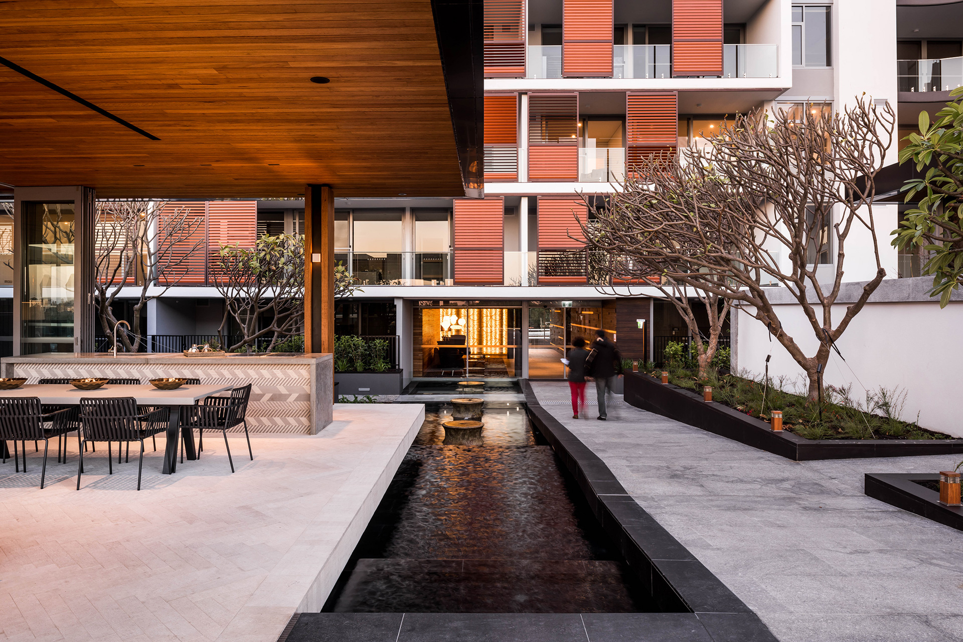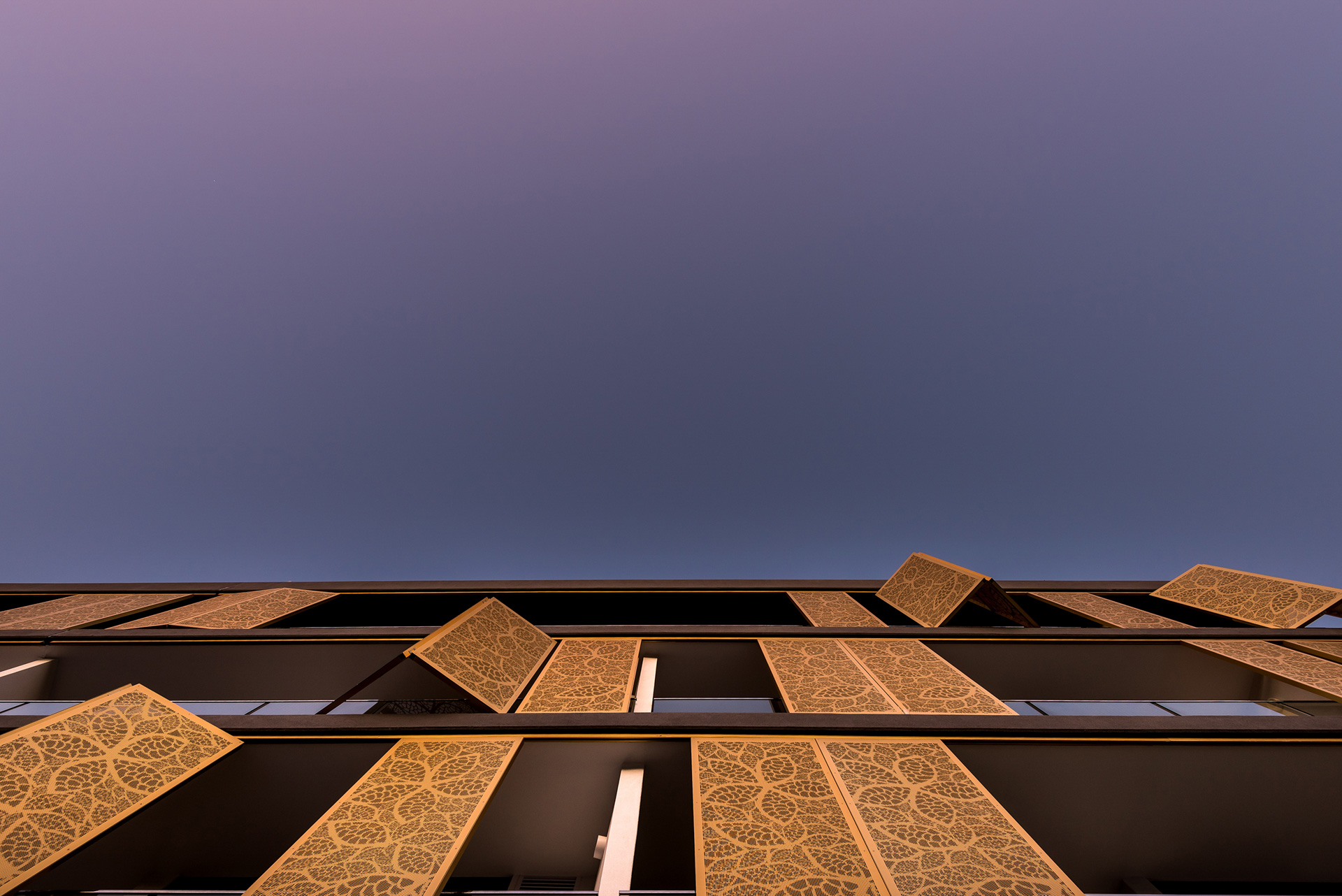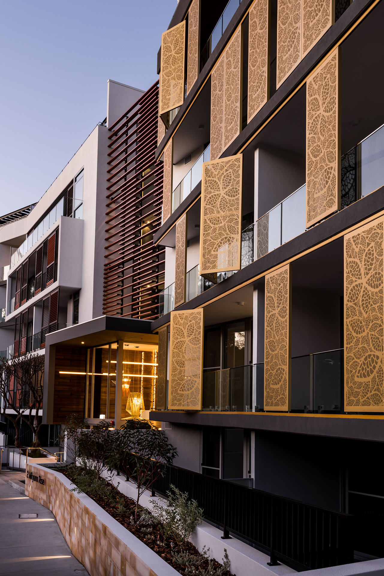 The highly-articulated building form created from a diverse range of materials, including golden anodized aluminium screens, is a stunning addition to the streetscape. The built form’s ‘U-shape’ takes advantage of the views and ensures they are accessible from all levels.