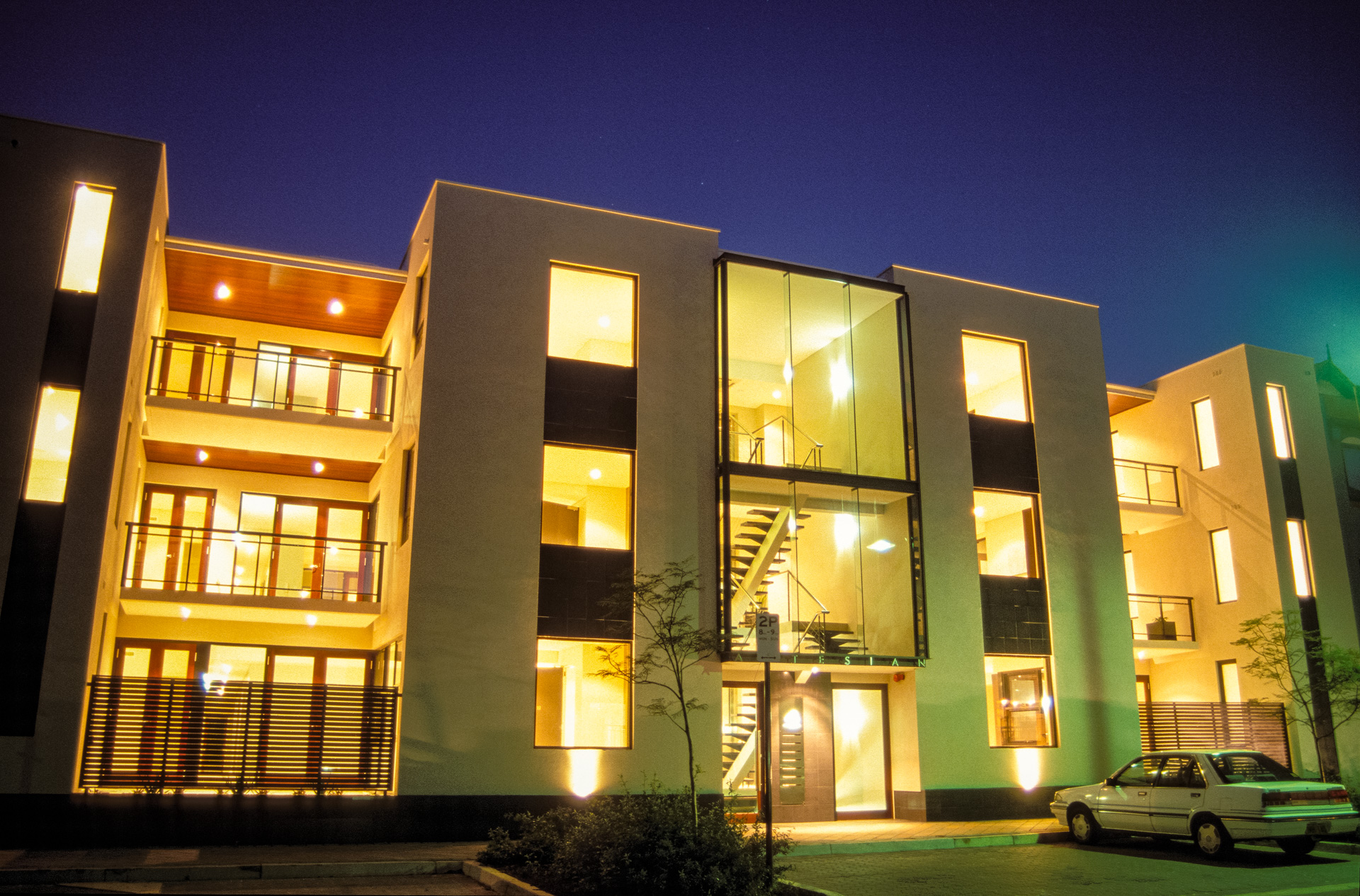With night-fall, the expanses of glazing on the ground floor and the four commercial tenancies glow, likening the building to a lantern.