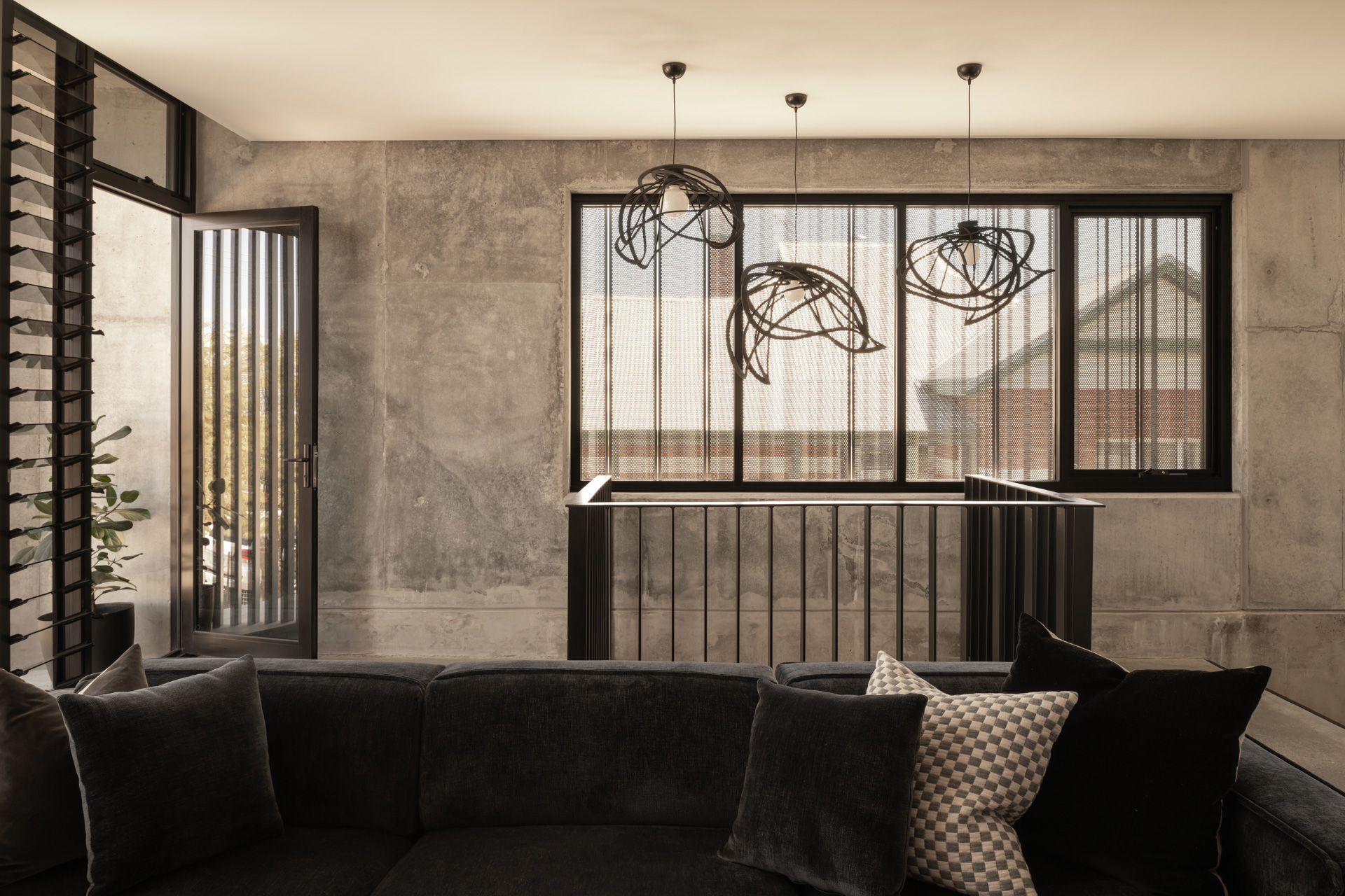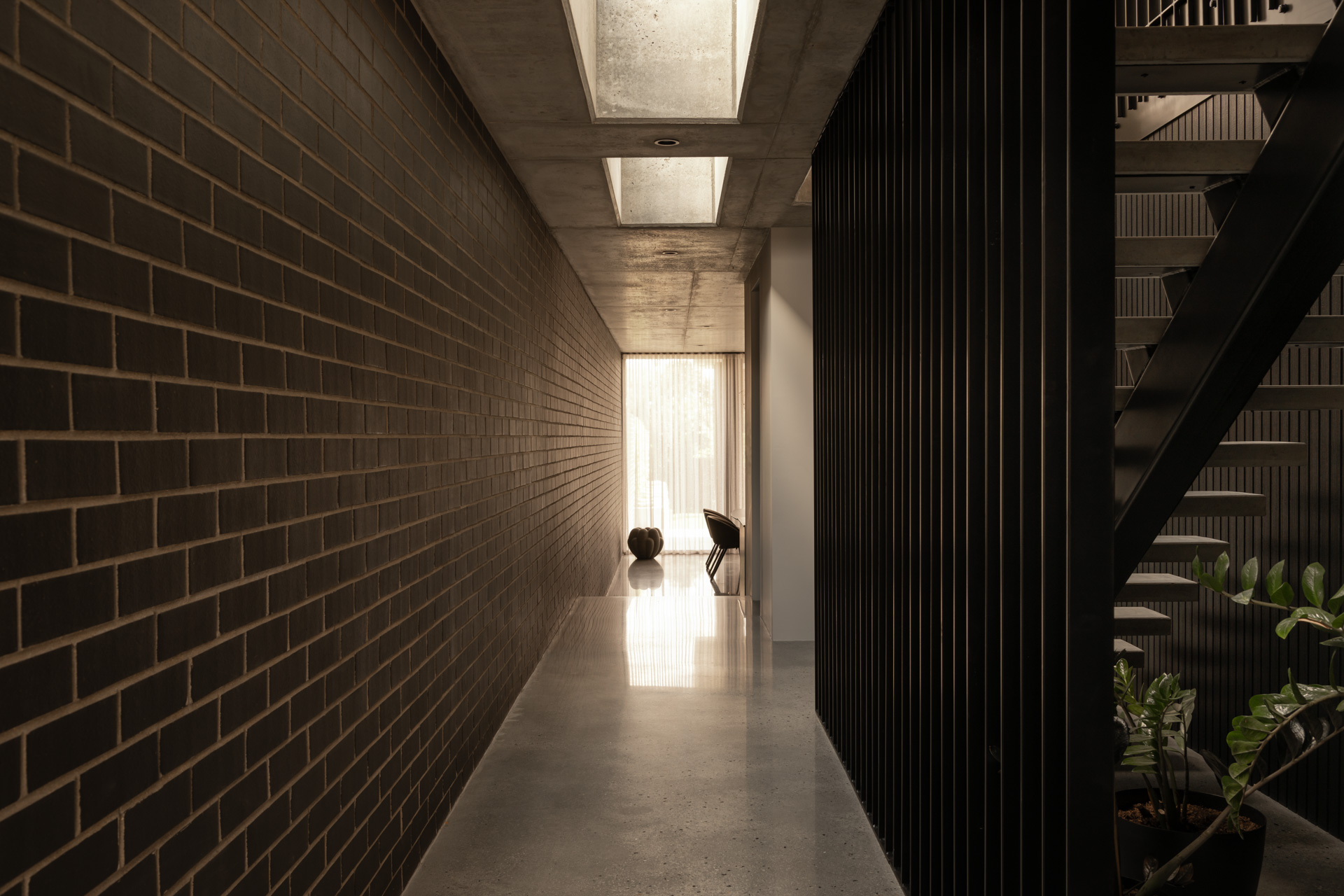 The upper storey uses feature metal screenings for both privacy and detail, with a setback on the western edge that permits for outdoor potted trees, again reinforcing that connection to nature established at the entrance.