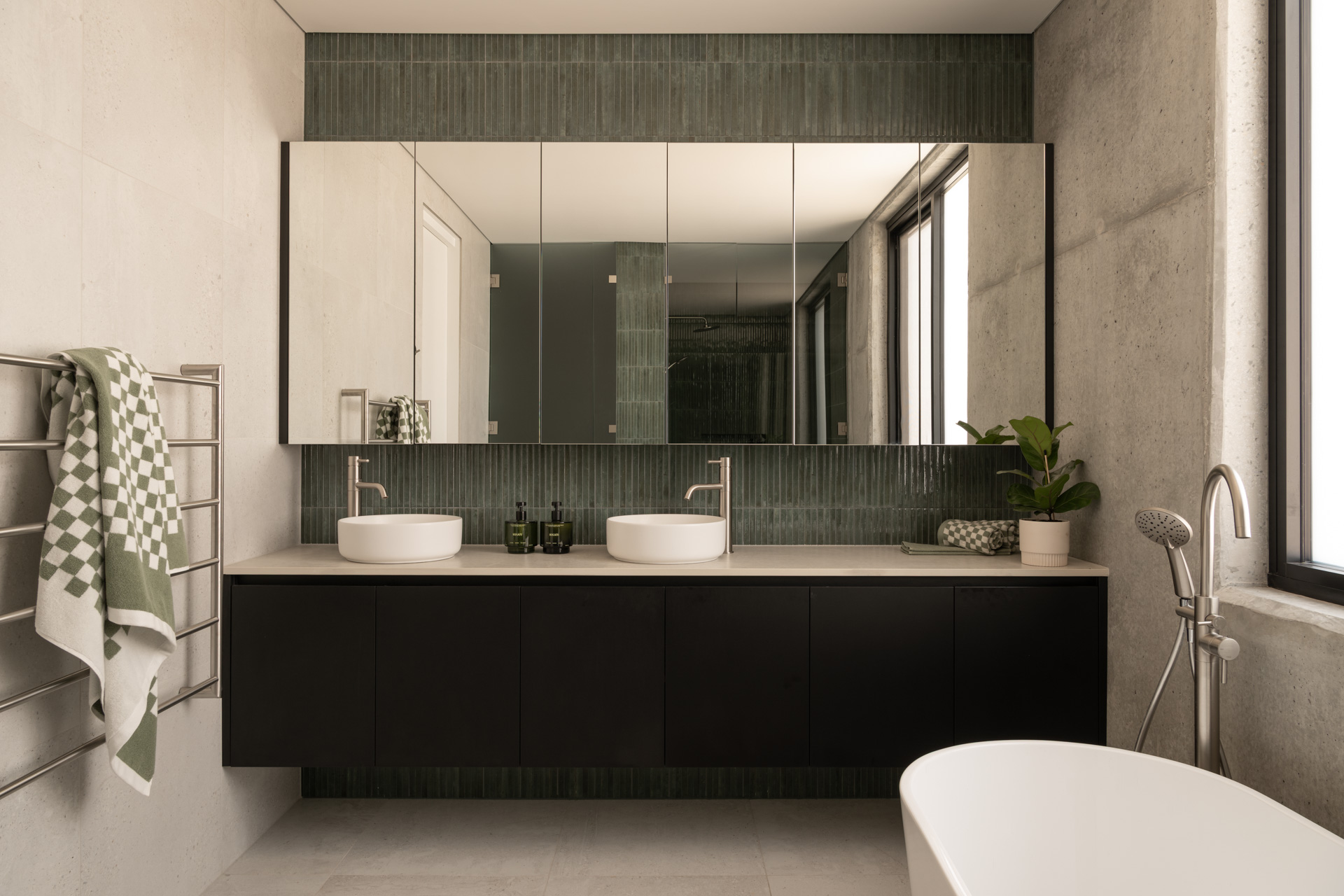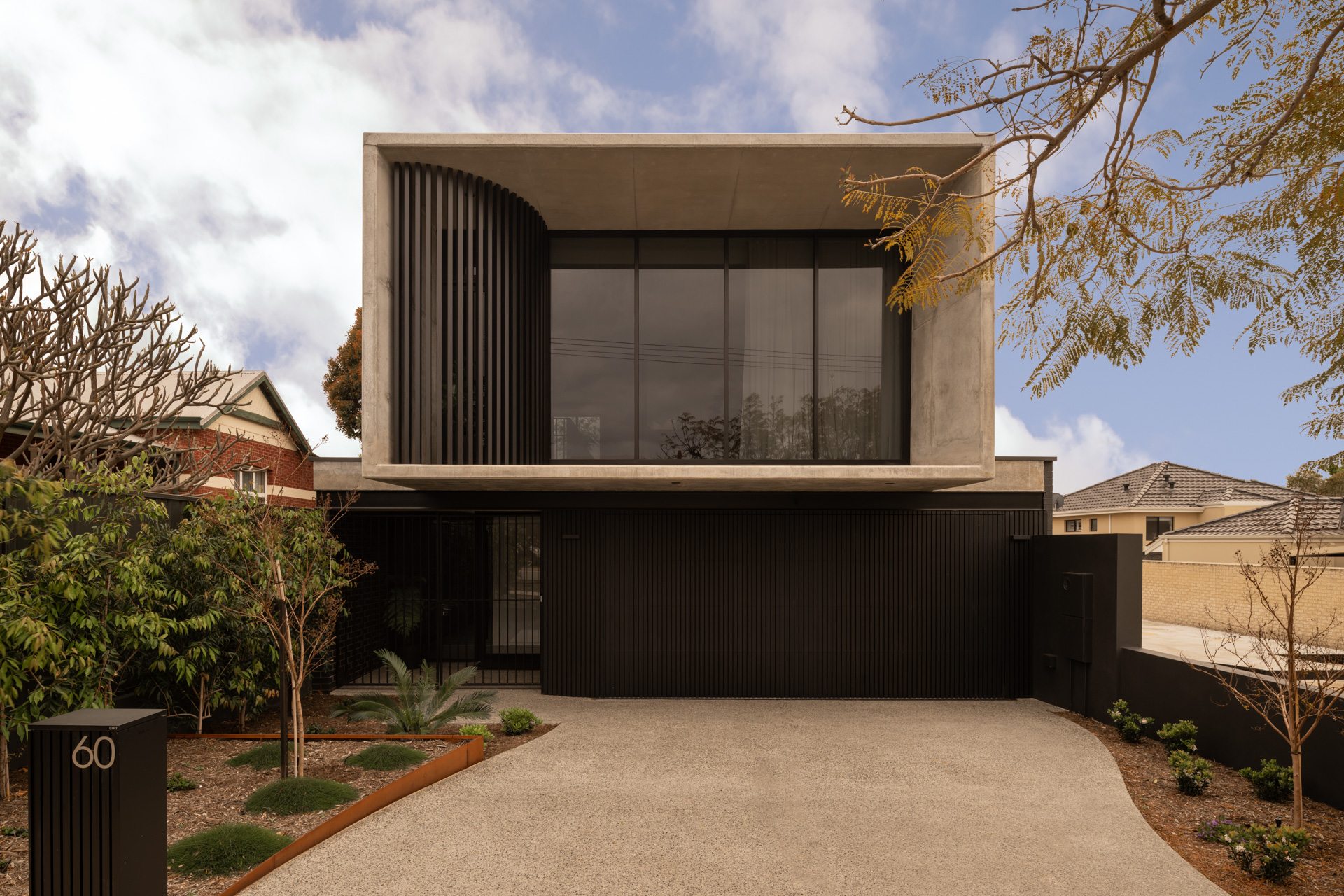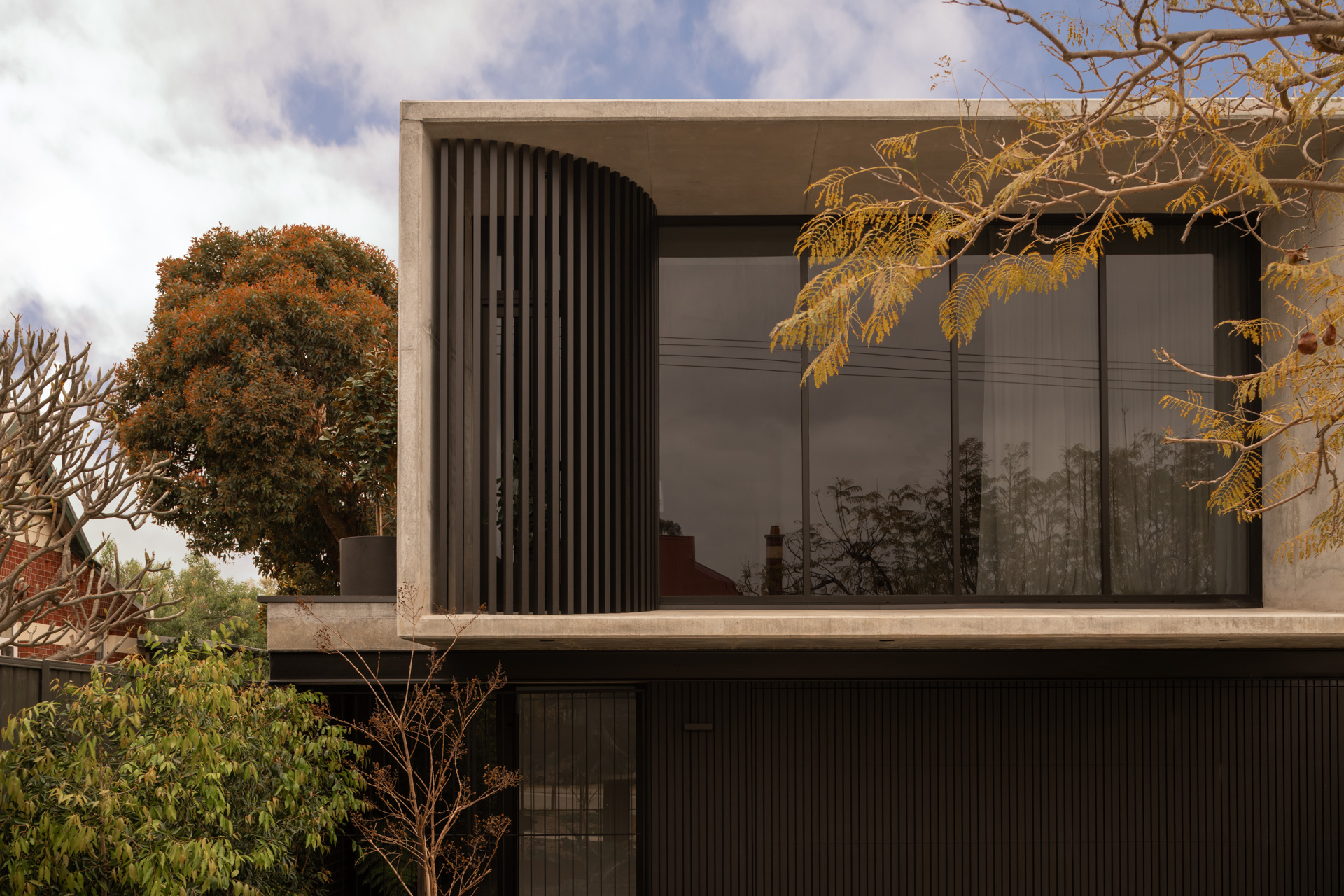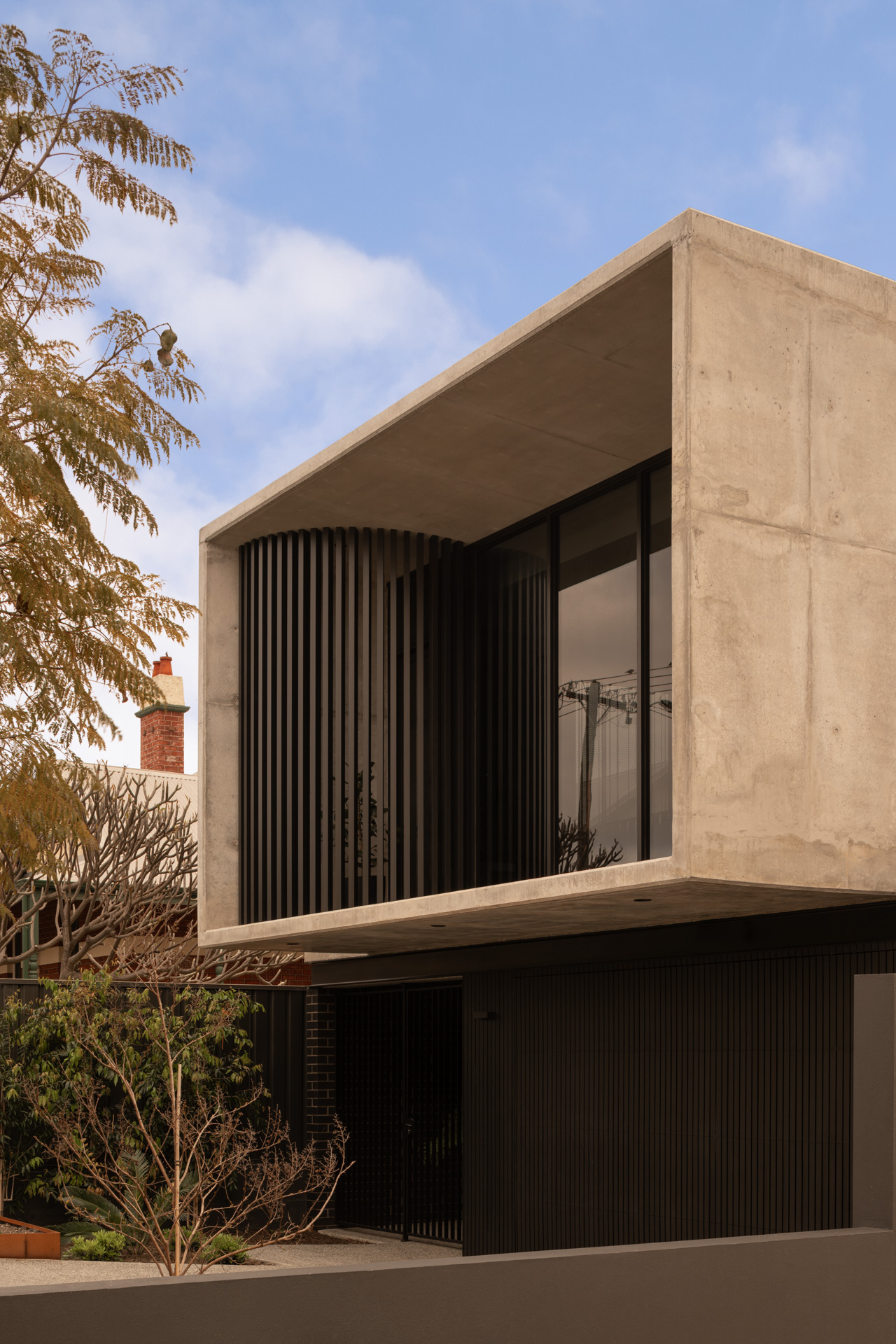 Bold without being intrusive, the geometrically striking upper storey is softened with a curved batten façade that harbours a balcony plant, offering both privacy and a connection to nature for the upstairs living area.