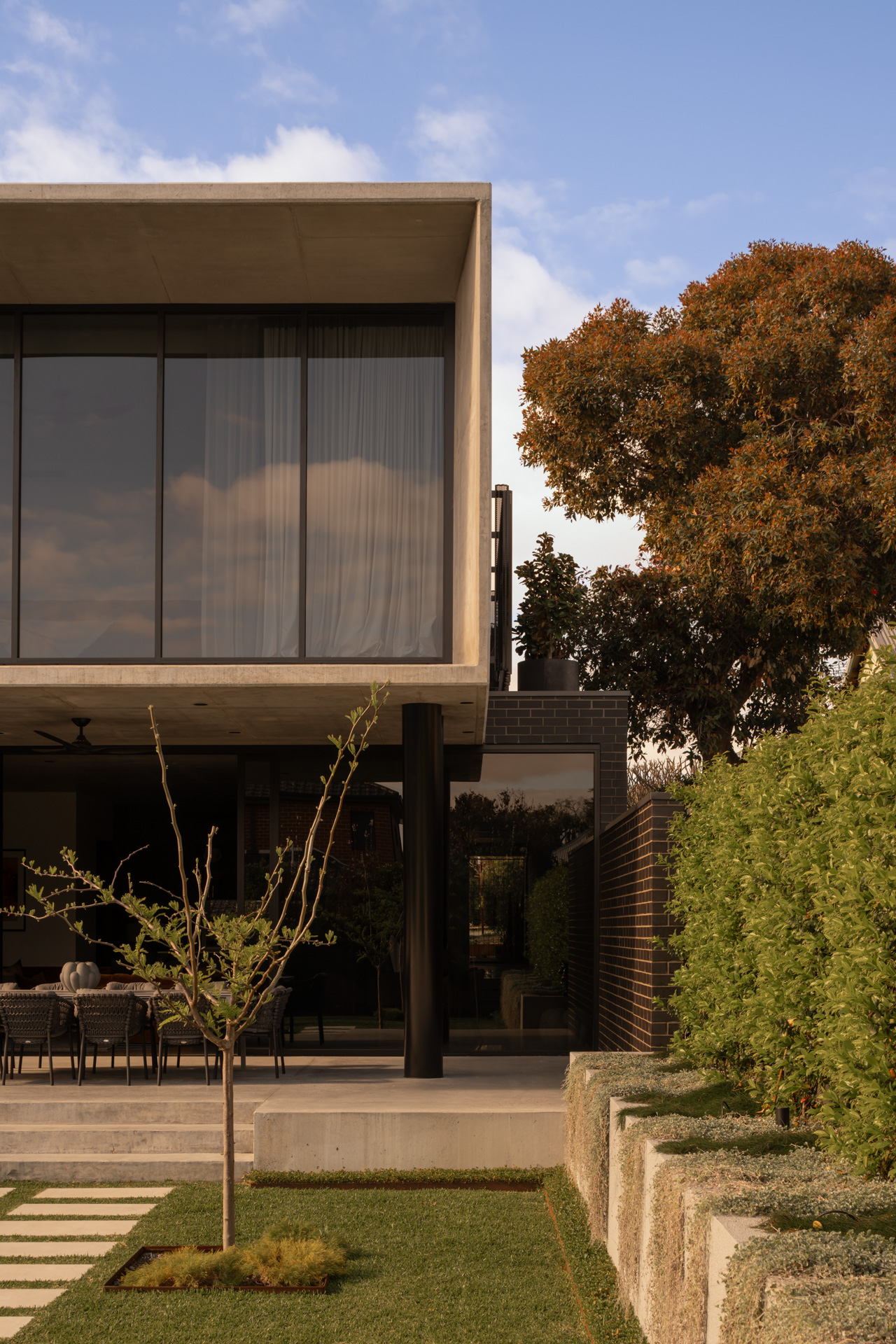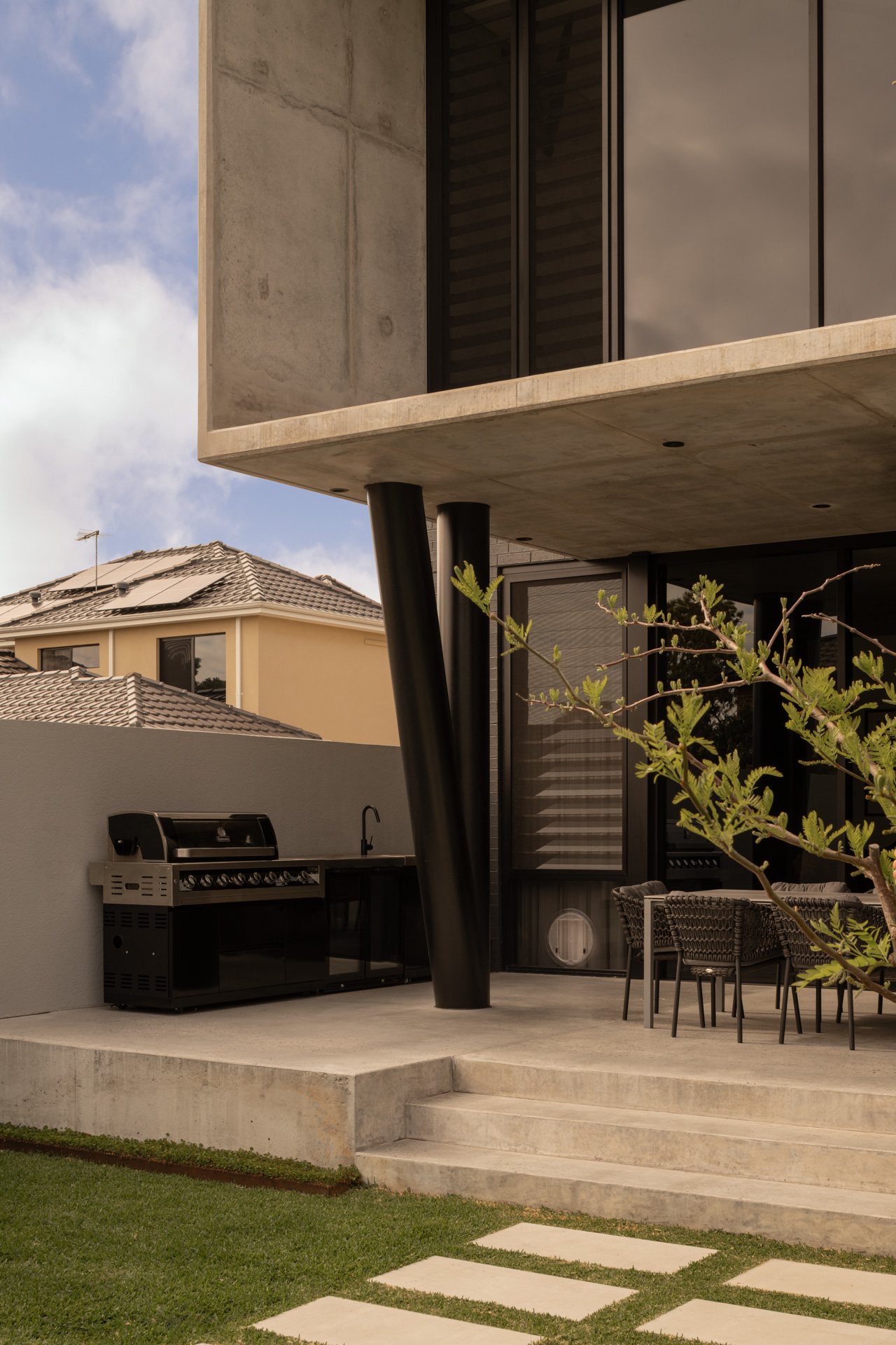 The cantilevered features of the upper storey provide an entry area that is stylish, secure and private, with a gated area that ties in with the strong verticals featured in the letterbox, external cladding and interior design features.
