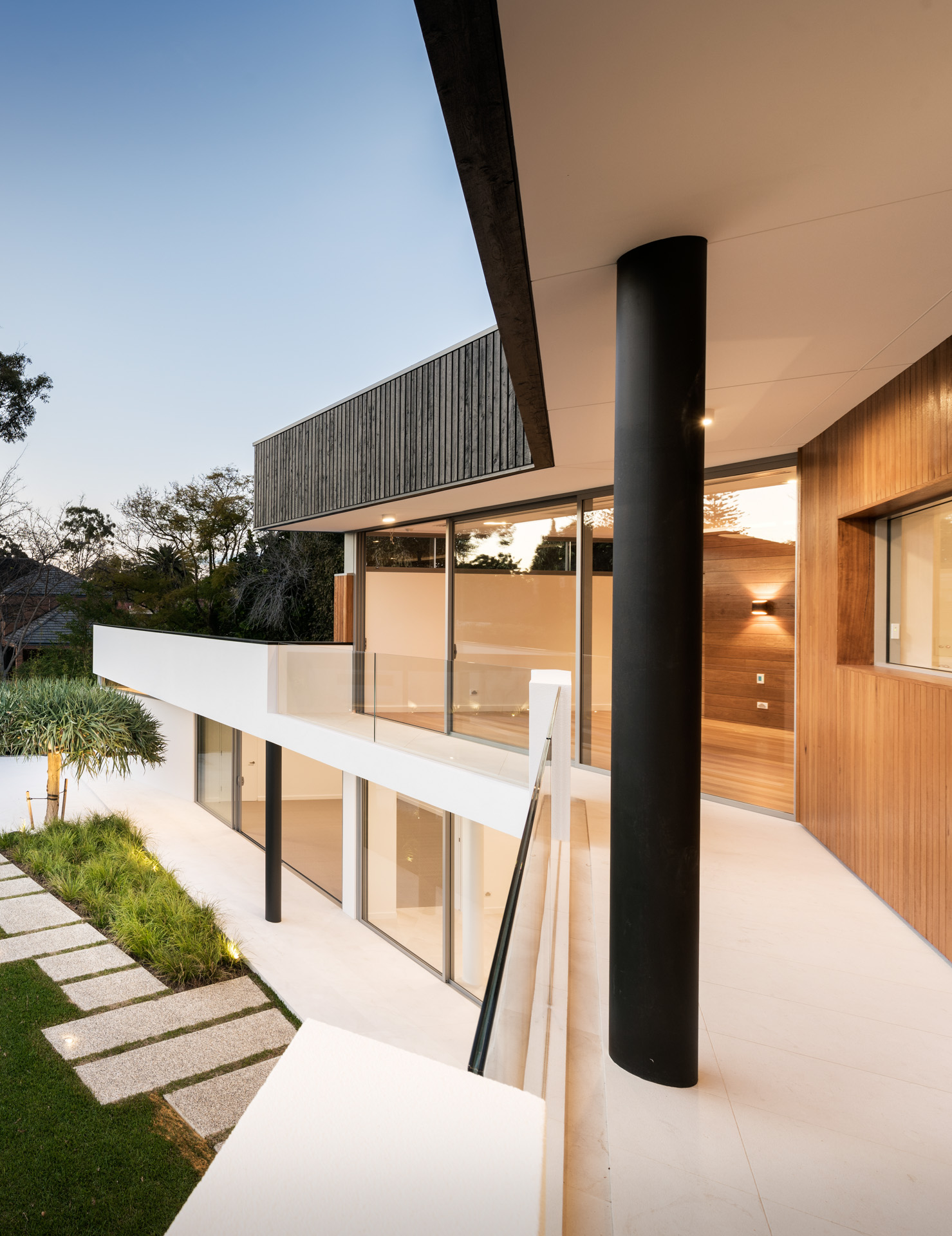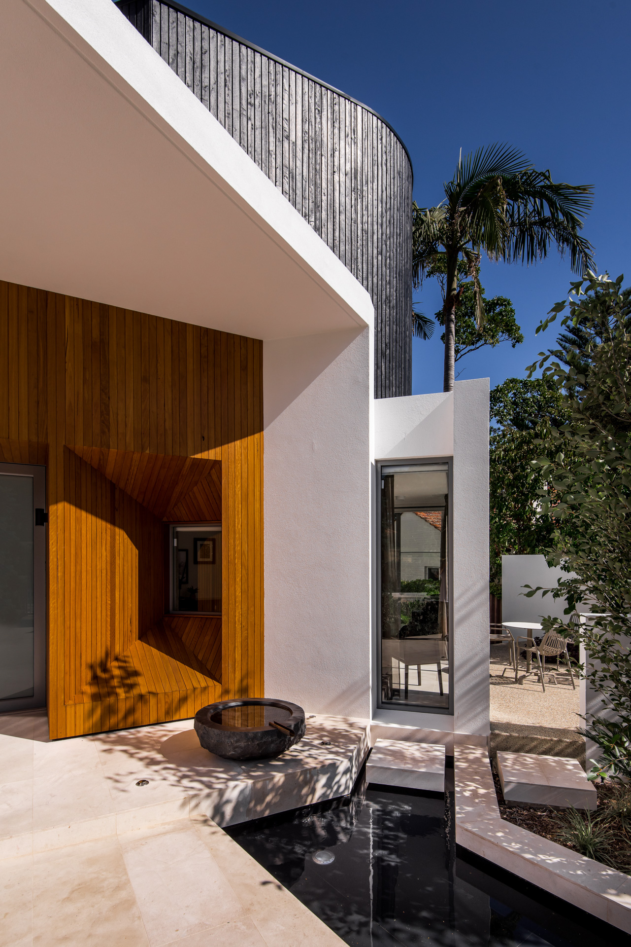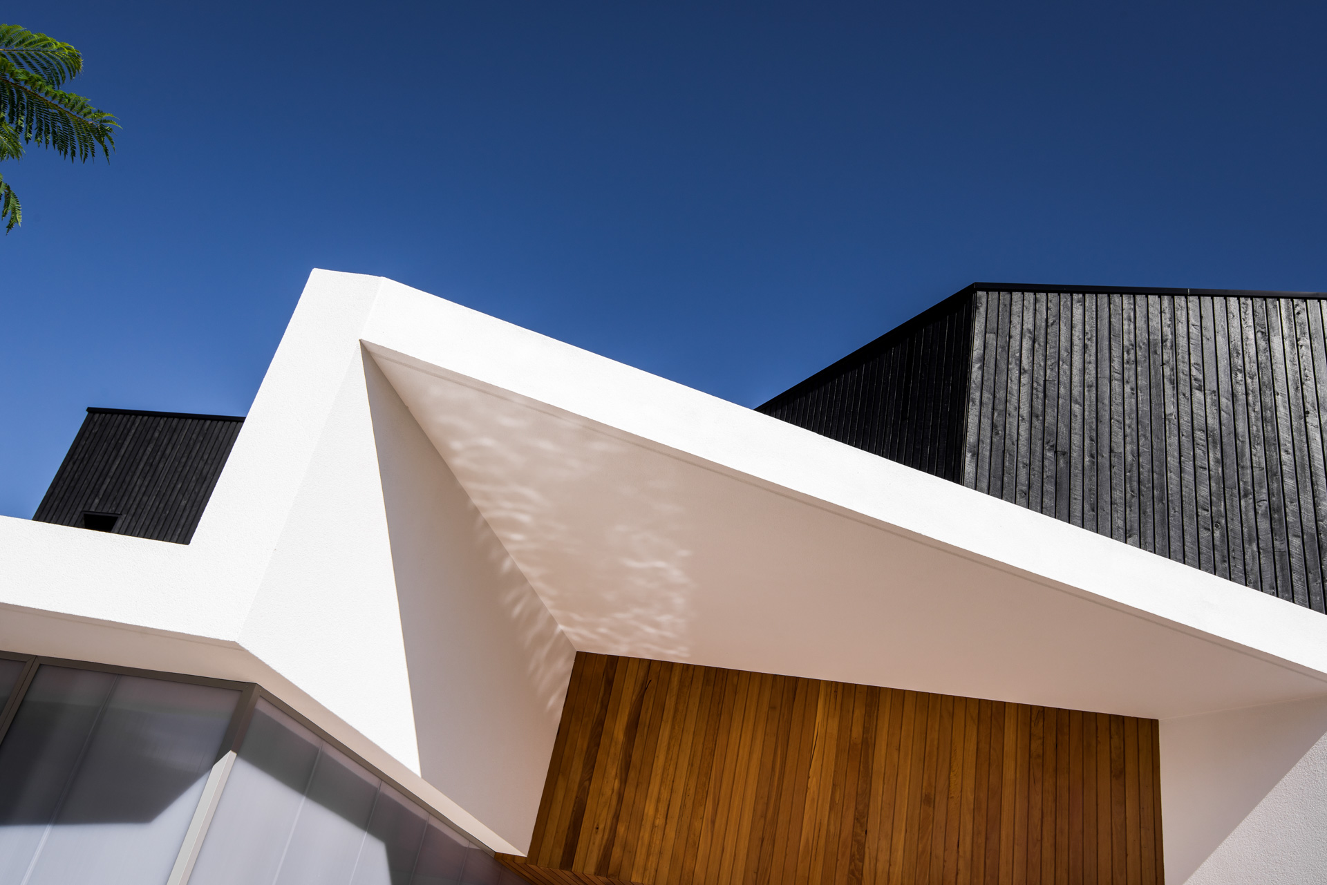 As per the clients request, many elements of the existing house were maintained. Upon arrival, you notice the house’s original curve is clad gracefully with Blackbutt. The sensual form and warm textures of the upper level contrasts beautifully with the white rendered, angular canopy, creating a dramatic entry-statement. The front elevation embraces the streetscape with a large folding canopy and prominent entryway.