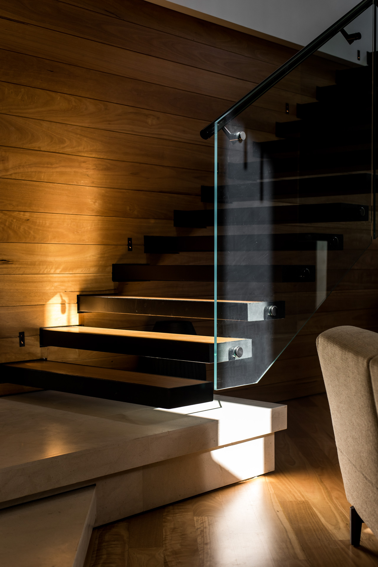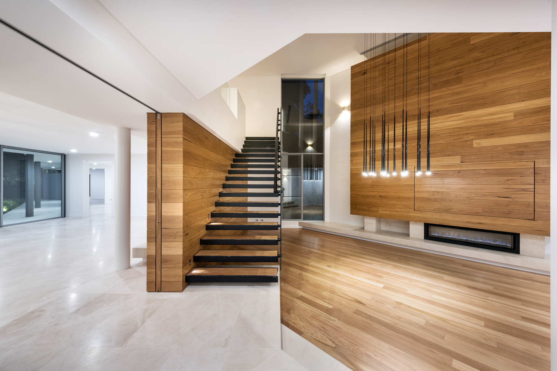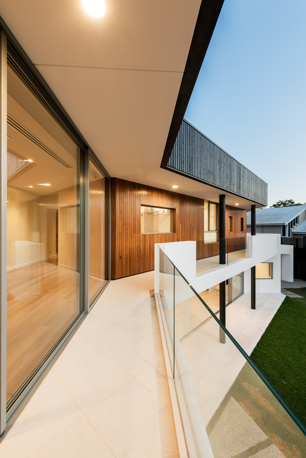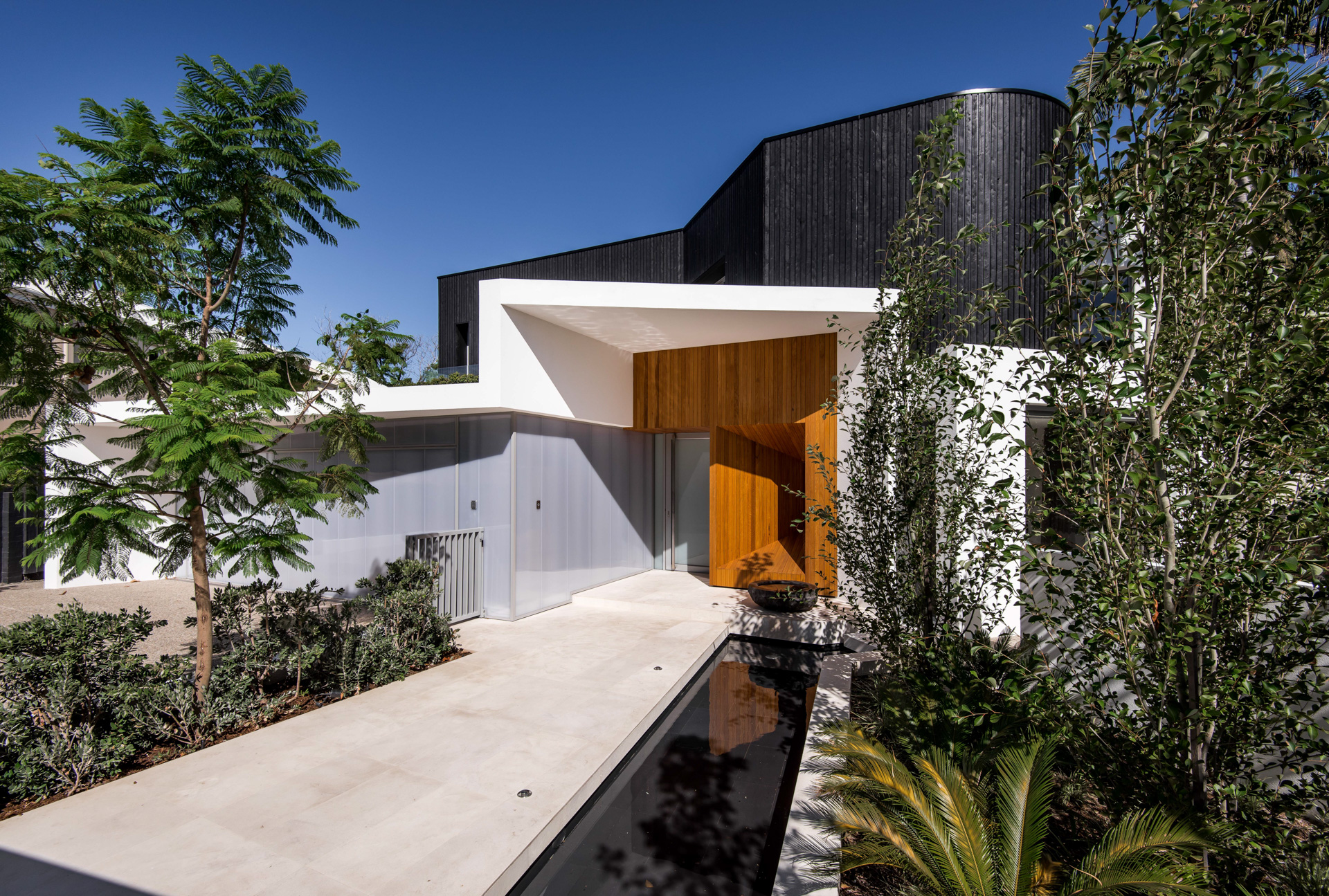 As per the clients request, many elements of the existing house were maintained. Upon arrival, you notice the house’s original curve is clad gracefully with Blackbutt. The sensual form and warm textures of the upper level contrasts beautifully with the white rendered, angular canopy, creating a dramatic entry-statement. The front elevation embraces the streetscape with a large folding canopy and prominent entryway.