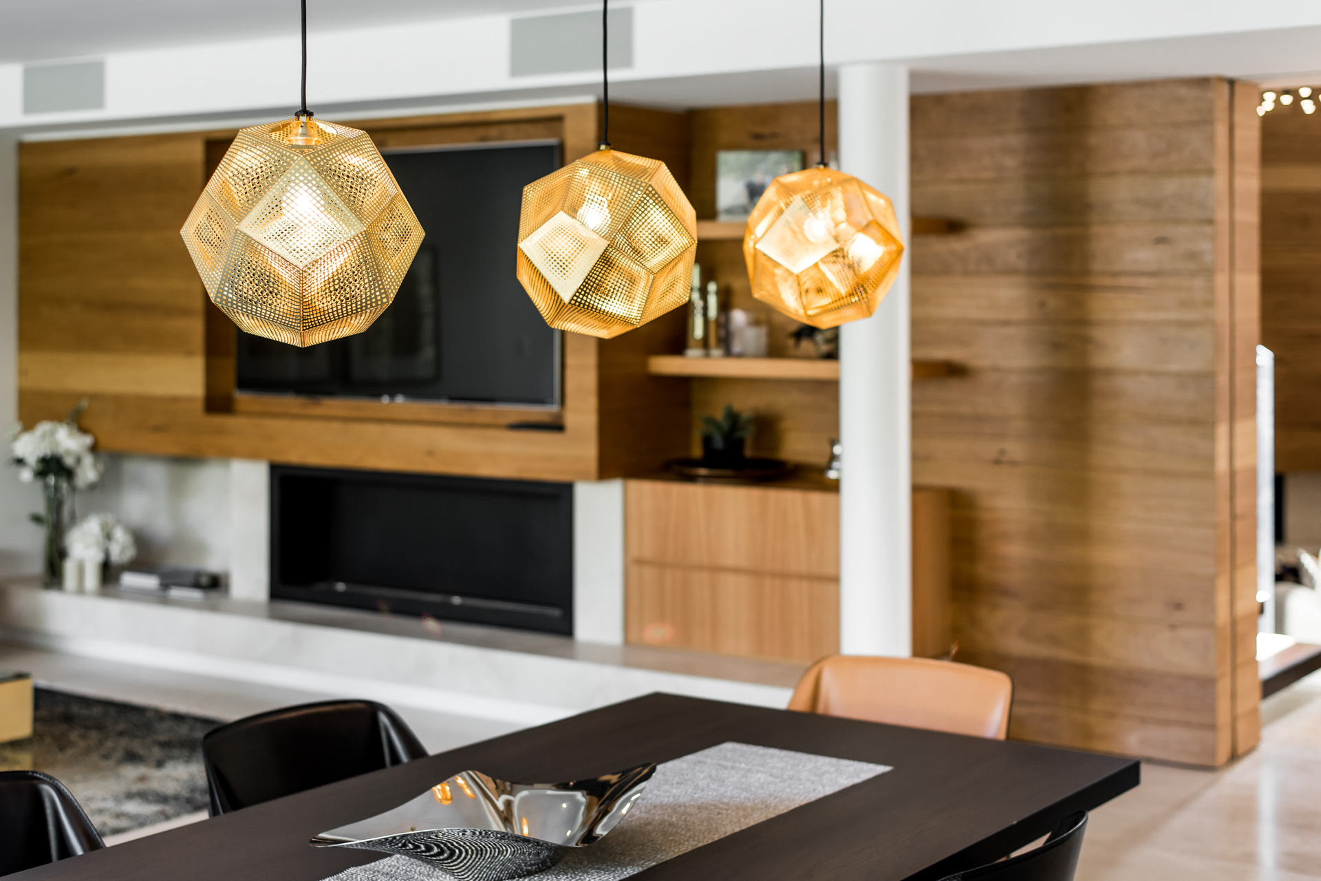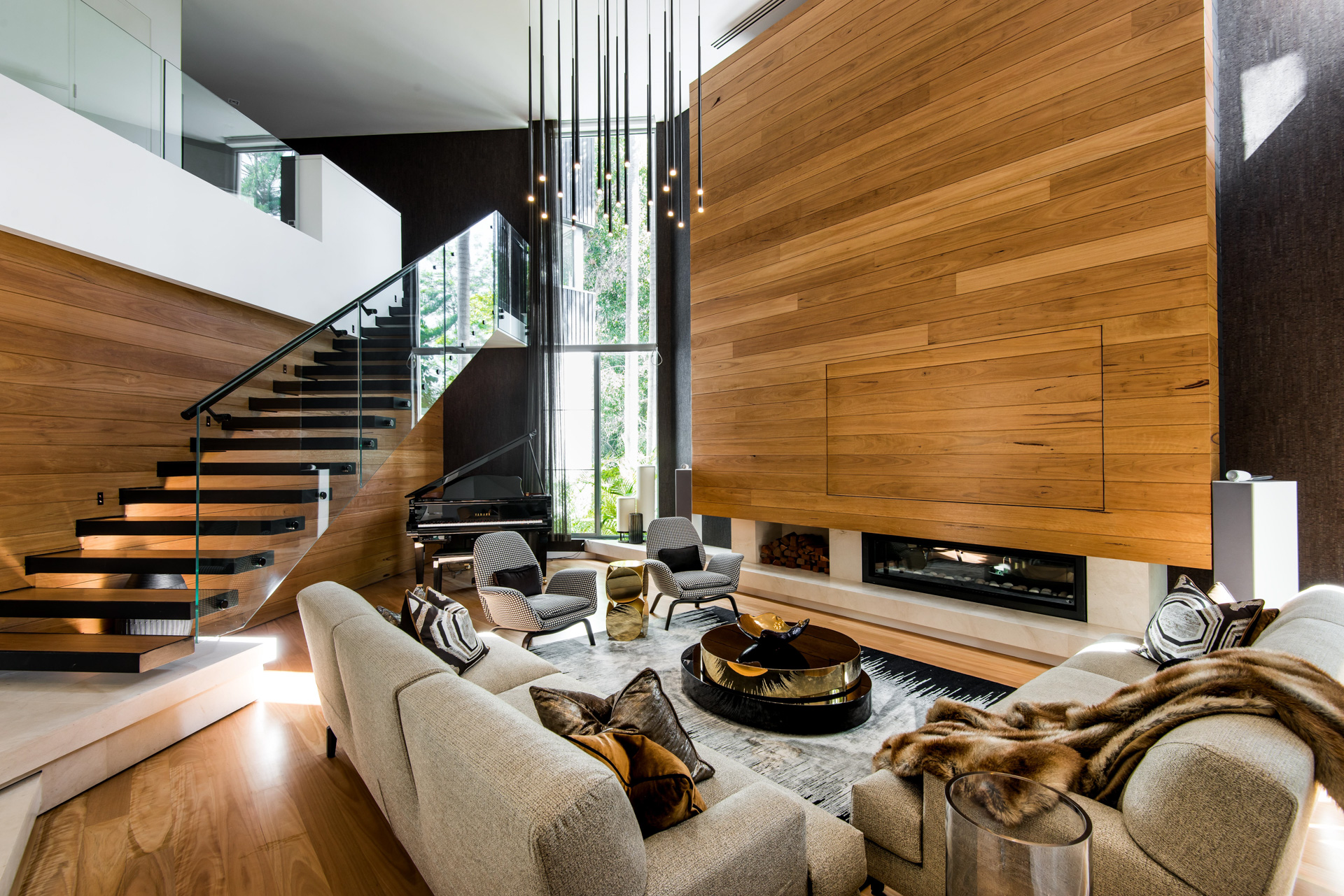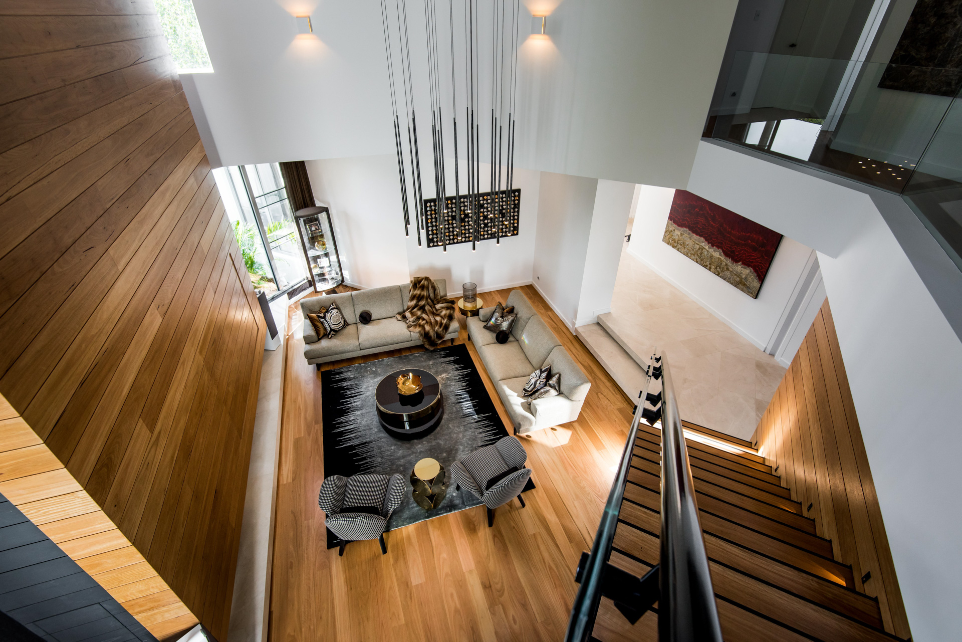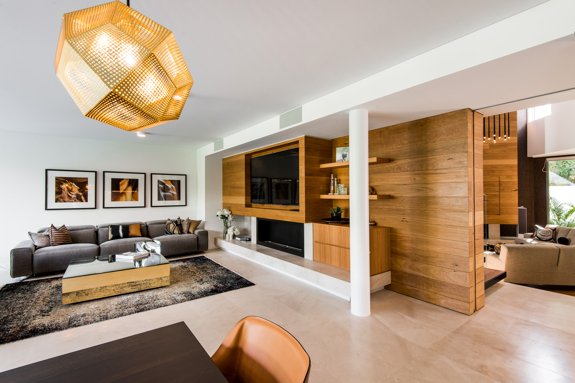 The living area boasts a double-height space, creating an airy and luxurious atmosphere. The architects sought to create an efficient, modern family-home which was fundamental to the clients’ brief. The placement of the living and dining areas allows them views over the backyard and a generous pool and cabana areas.
