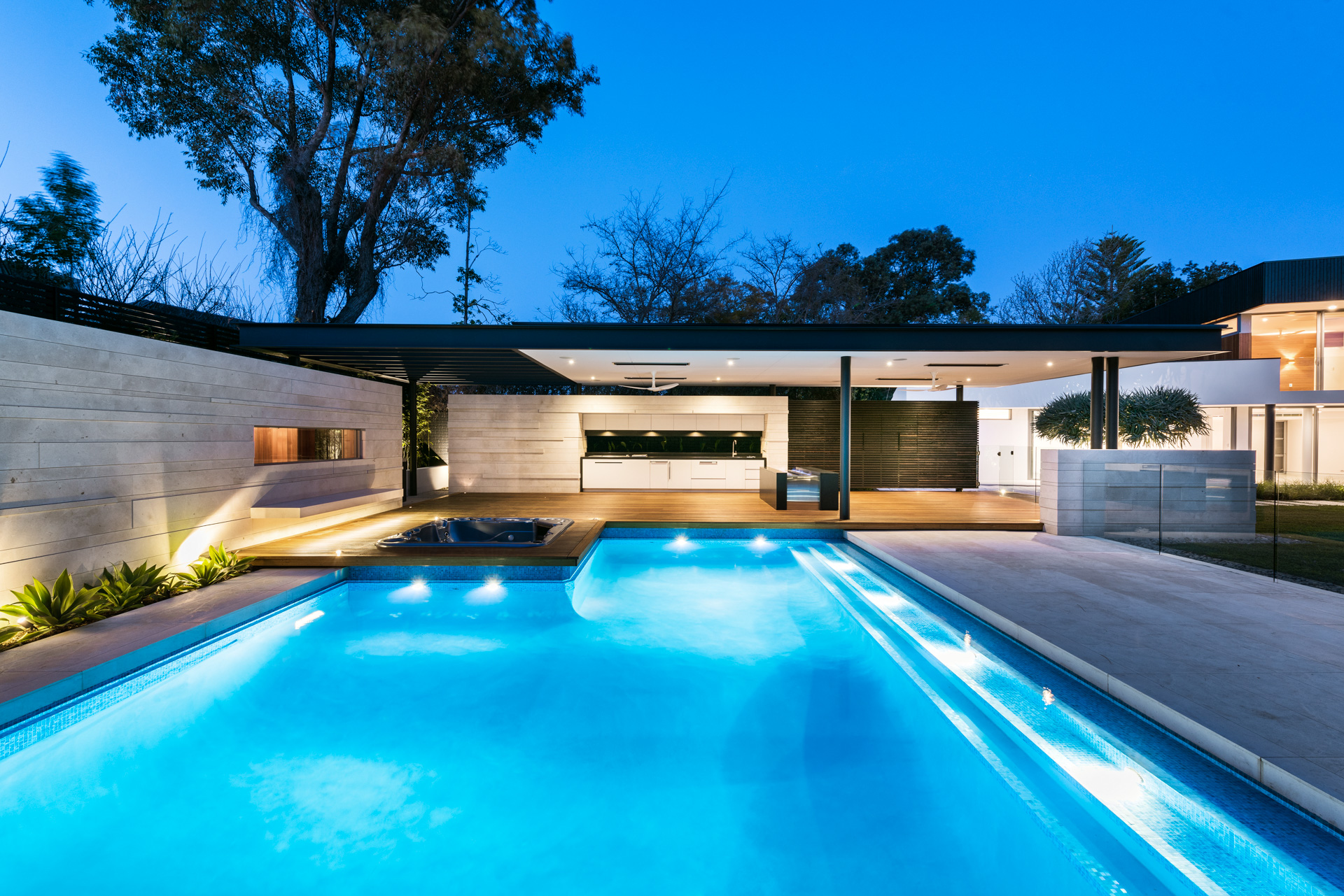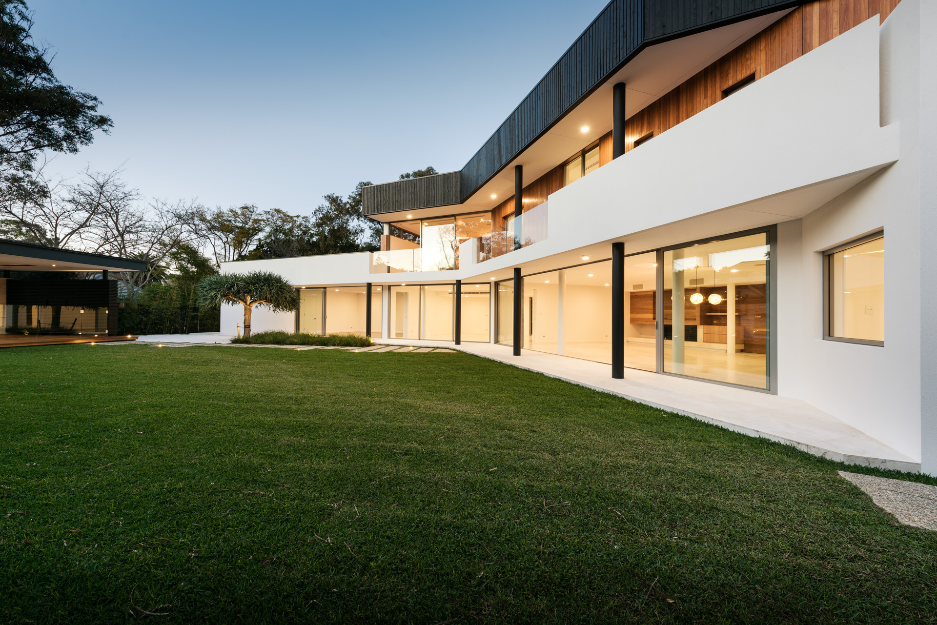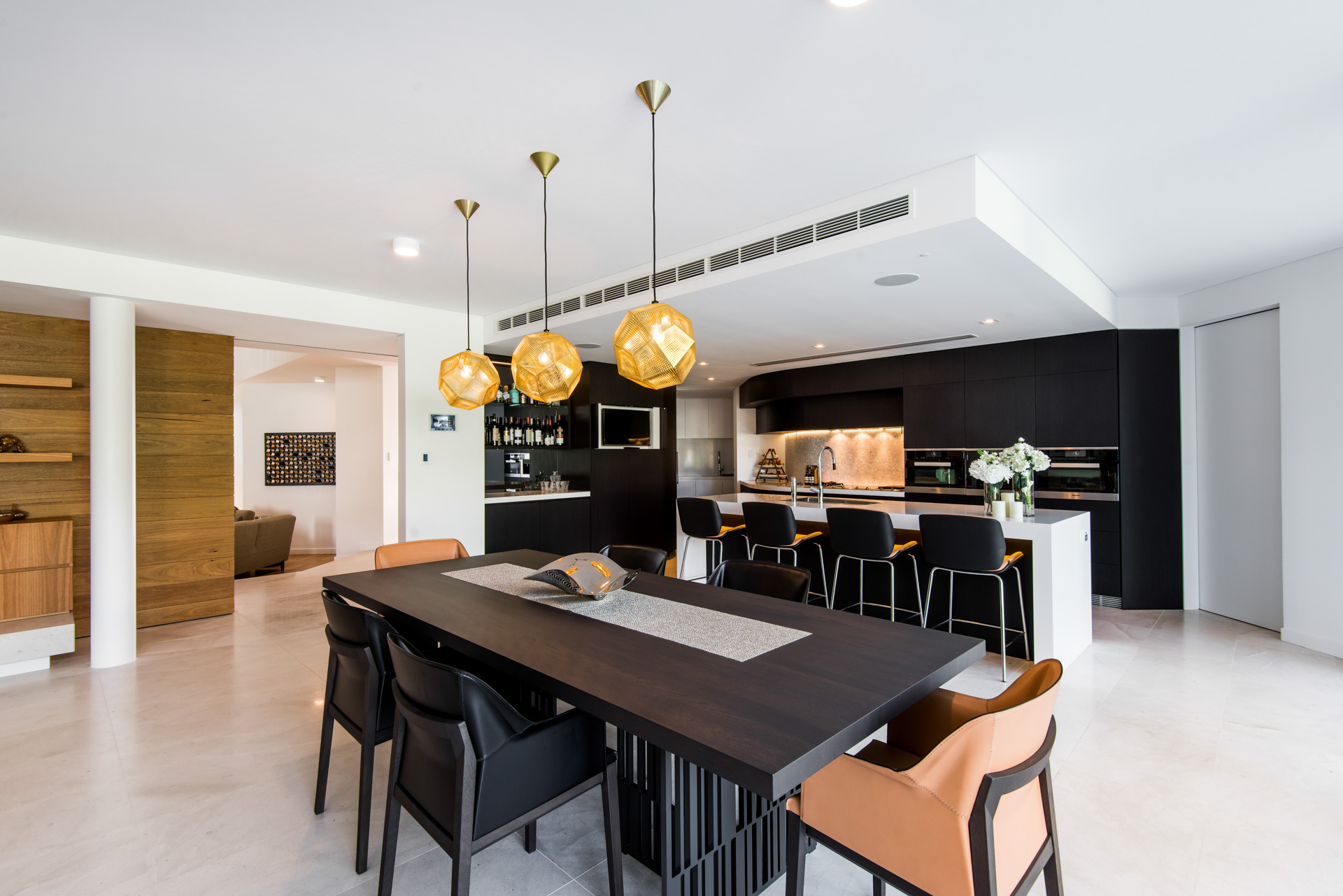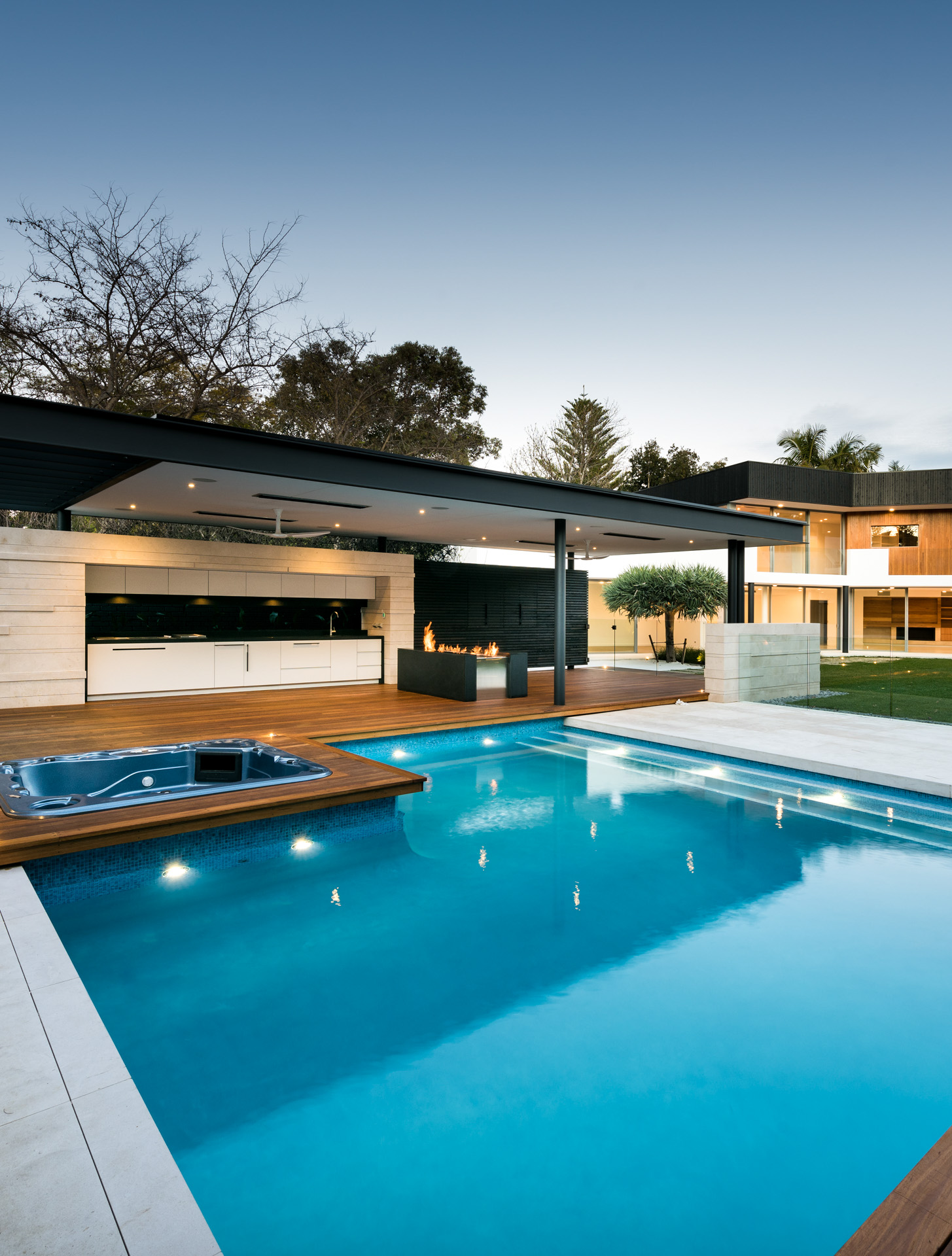 The living area boasts a double-height space, creating an airy and luxurious atmosphere. The architects sought to create an efficient, modern family-home which was fundamental to the clients’ brief. The placement of the living and dining areas allows them views over the backyard and a generous pool and cabana areas.