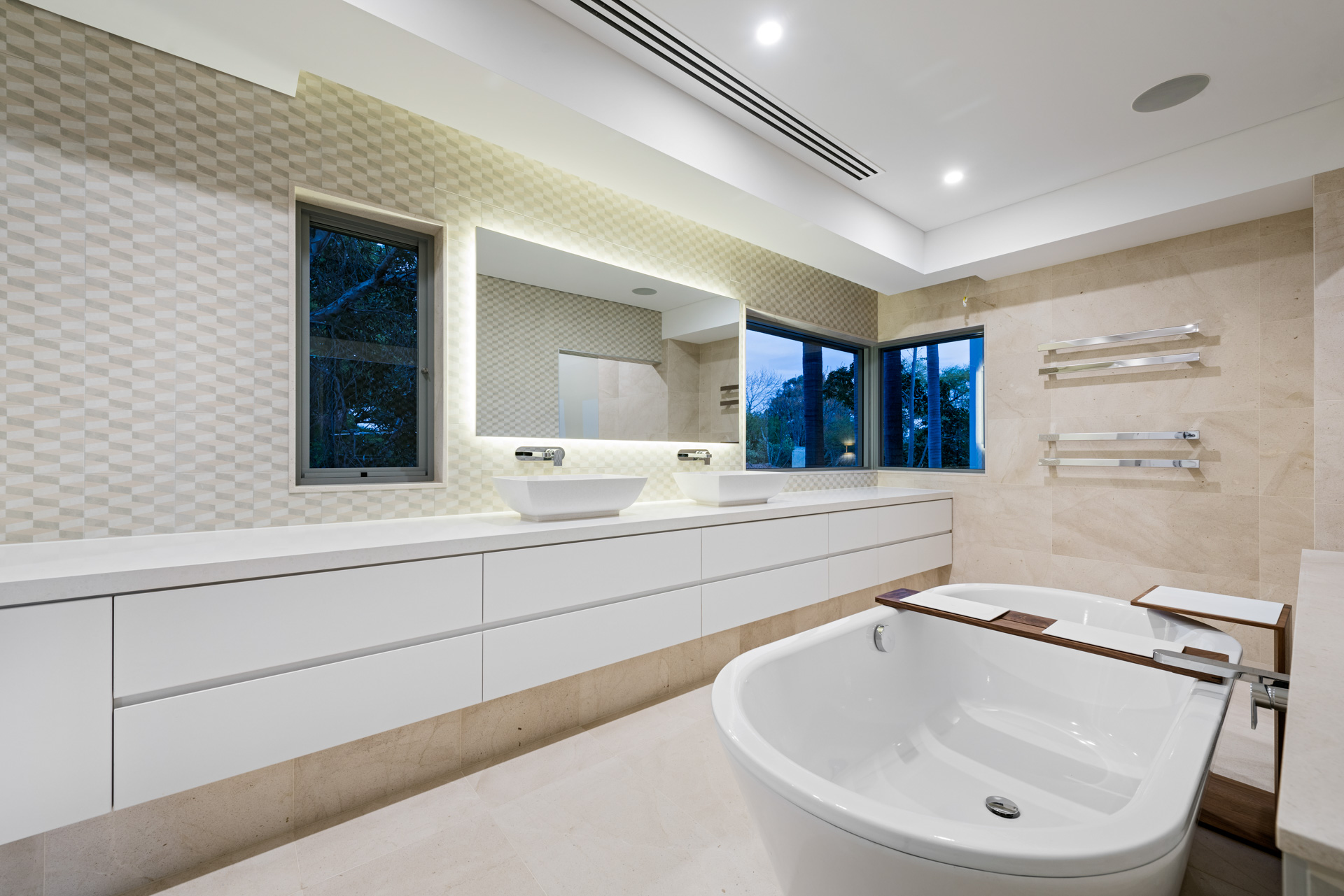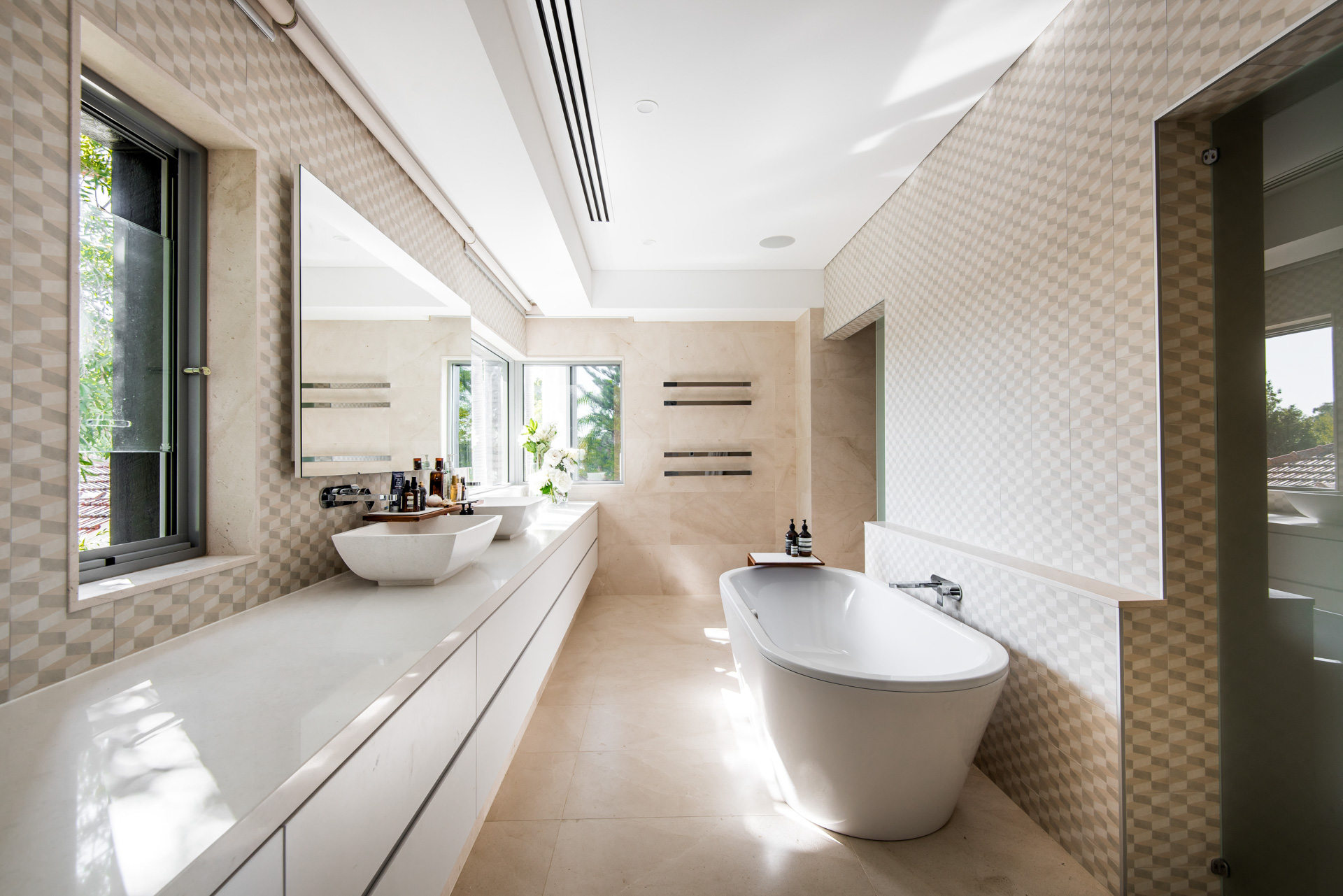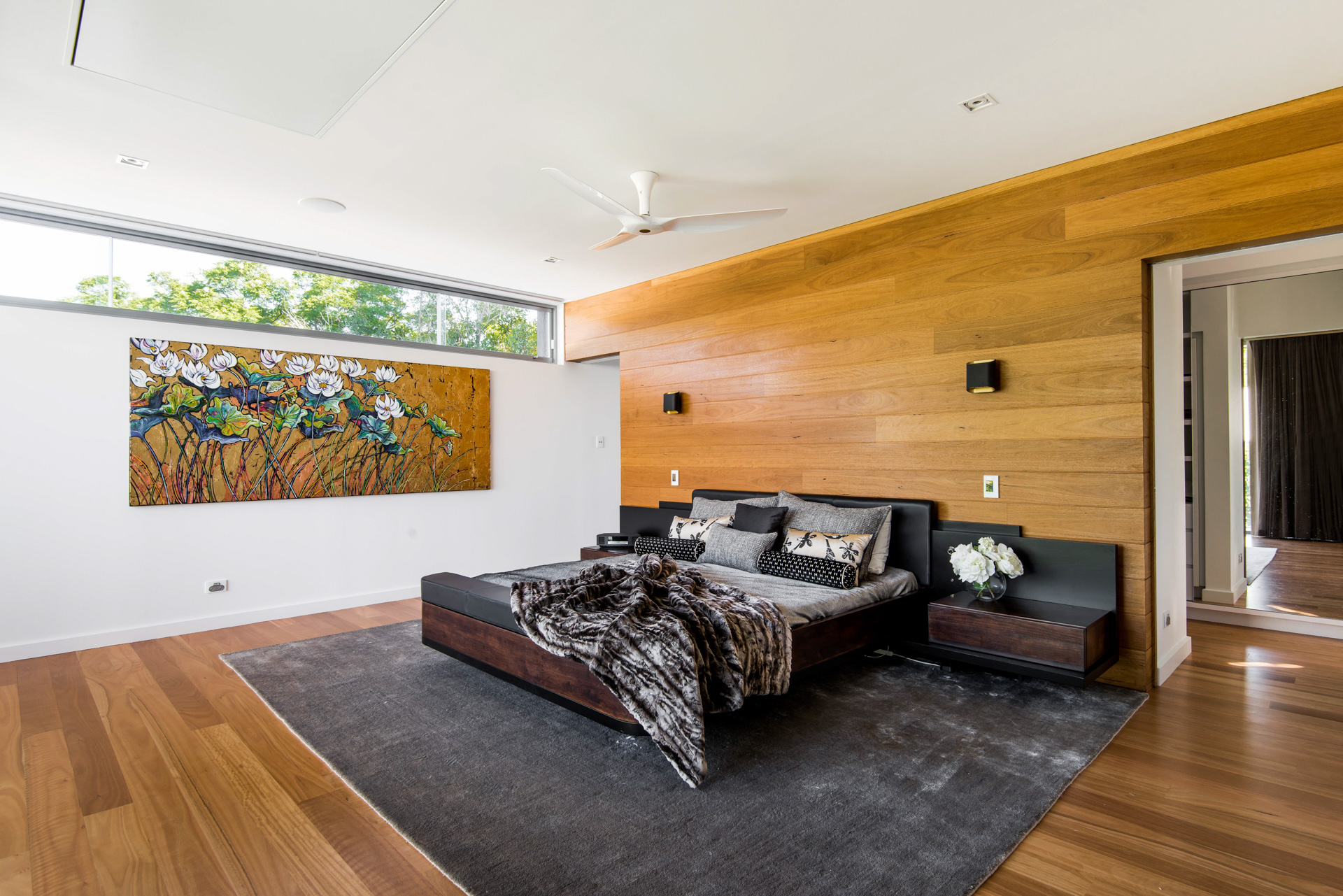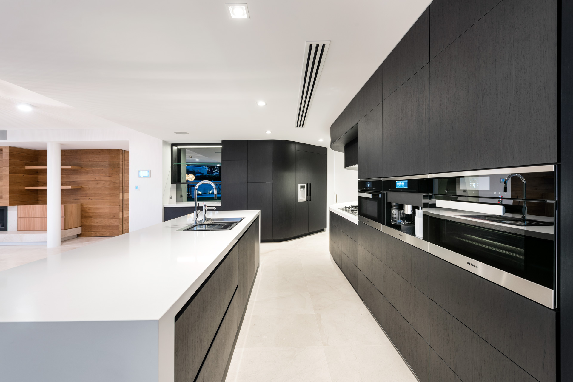 The living area boasts a double-height space, creating an airy and luxurious atmosphere. The architects sought to create an efficient, modern family-home which was fundamental to the clients’ brief. The placement of the living and dining areas allows them views over the backyard and a generous pool and cabana areas.
