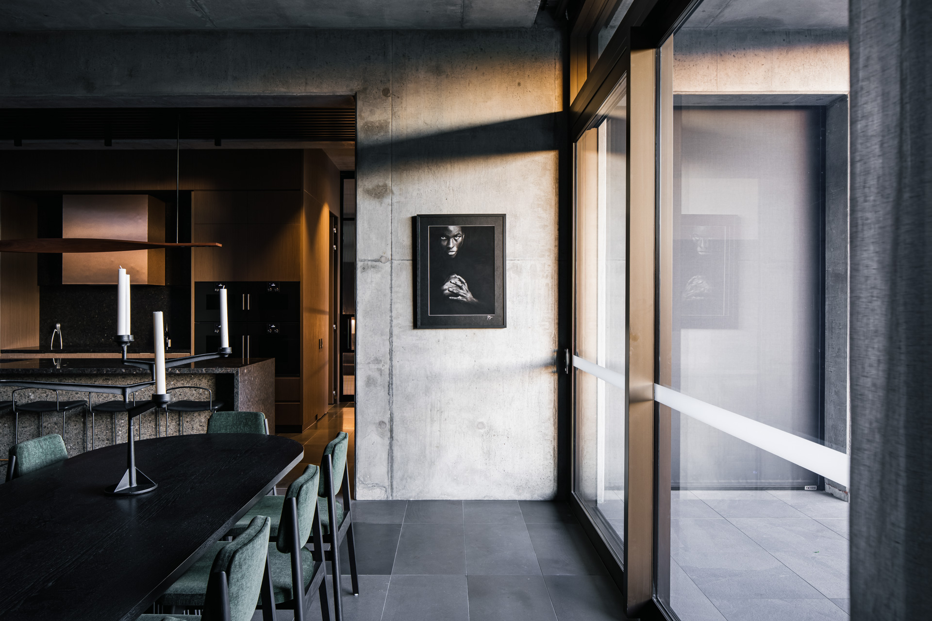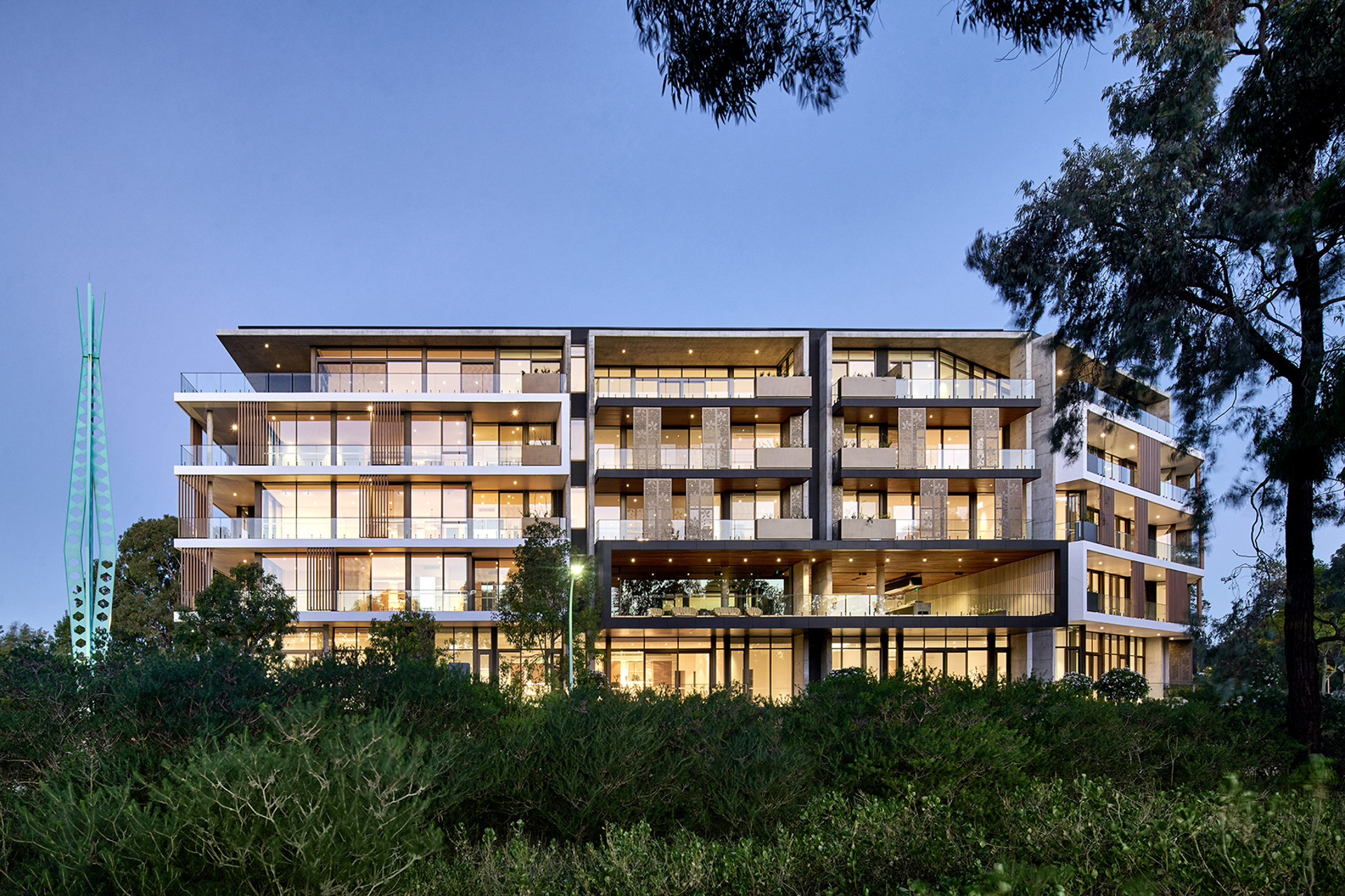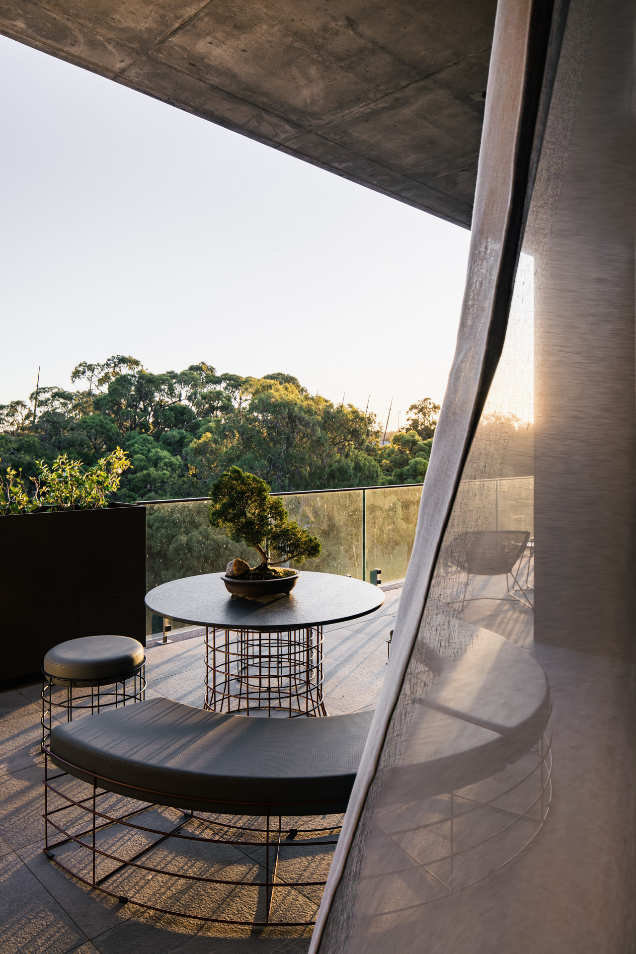 The Eden complex sits on the edge of Perry Lakes and Perth’s second largest botanical reserve, Bold Park. The building design is inspired by the direction for a mid-century response inspired by the Commonwealth Games era. Externally, off form concrete, rendered masonry and natural timber are significant features. The pattern of the inverted u-shaped off form concrete framing elements on the outside of the building was very much reflected in the apartment’s interior with the pattern and materiality reflected faithfully through the full depth of the space.This became the generator of the rest of the interior.
