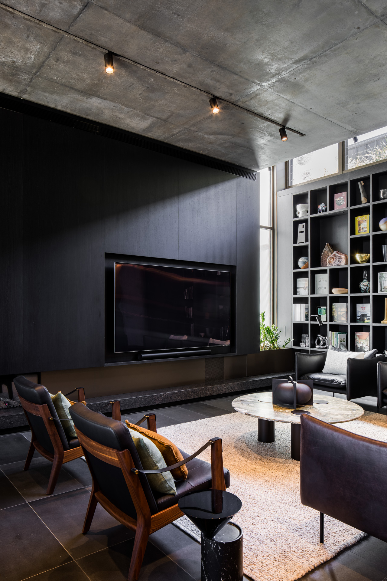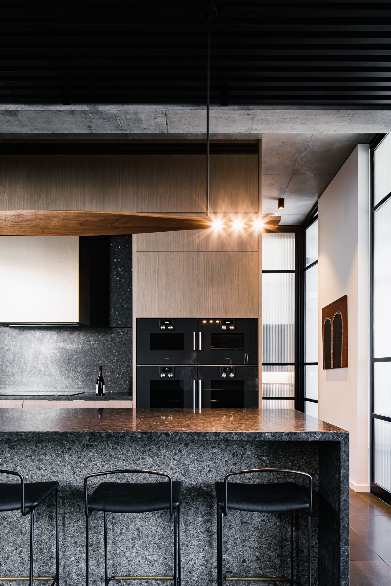 A restrained though softer palette of walnut and black veneers has been deliberately composed into a linear pattern of blades and boxes, to contrast with each other as natural materials do in the bush against the hardness of stone. The 3.5-meter ceiling folds into a highlight, accessing northern light which in winter enlivens the dark veneer living wall. Internal planters and rooftop planting, accentuate the connection with nature. Other lightwells emphasize the day with morning sun warming the laundry and the afternoon sun lighting planting within the living space.