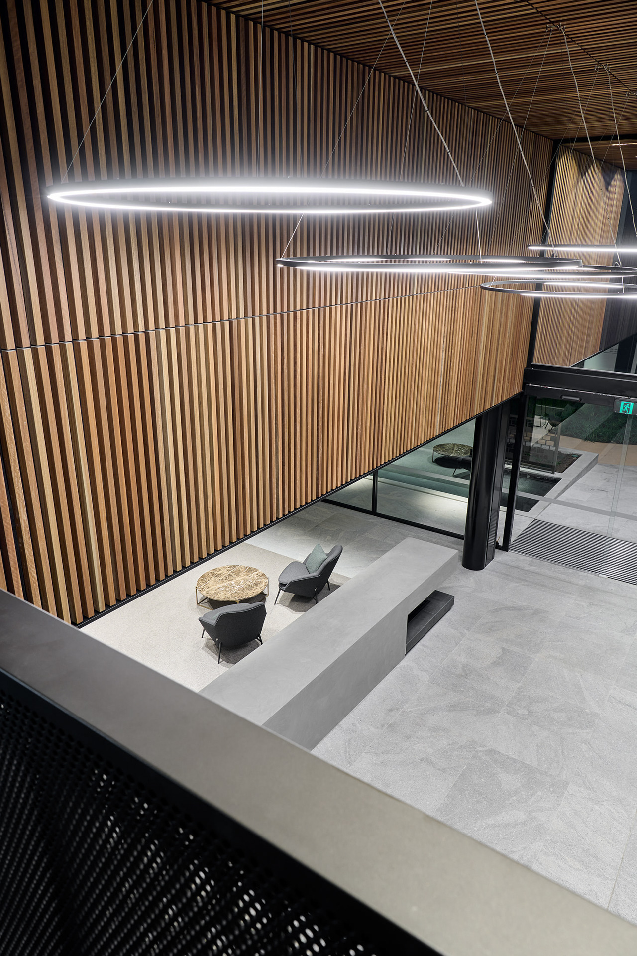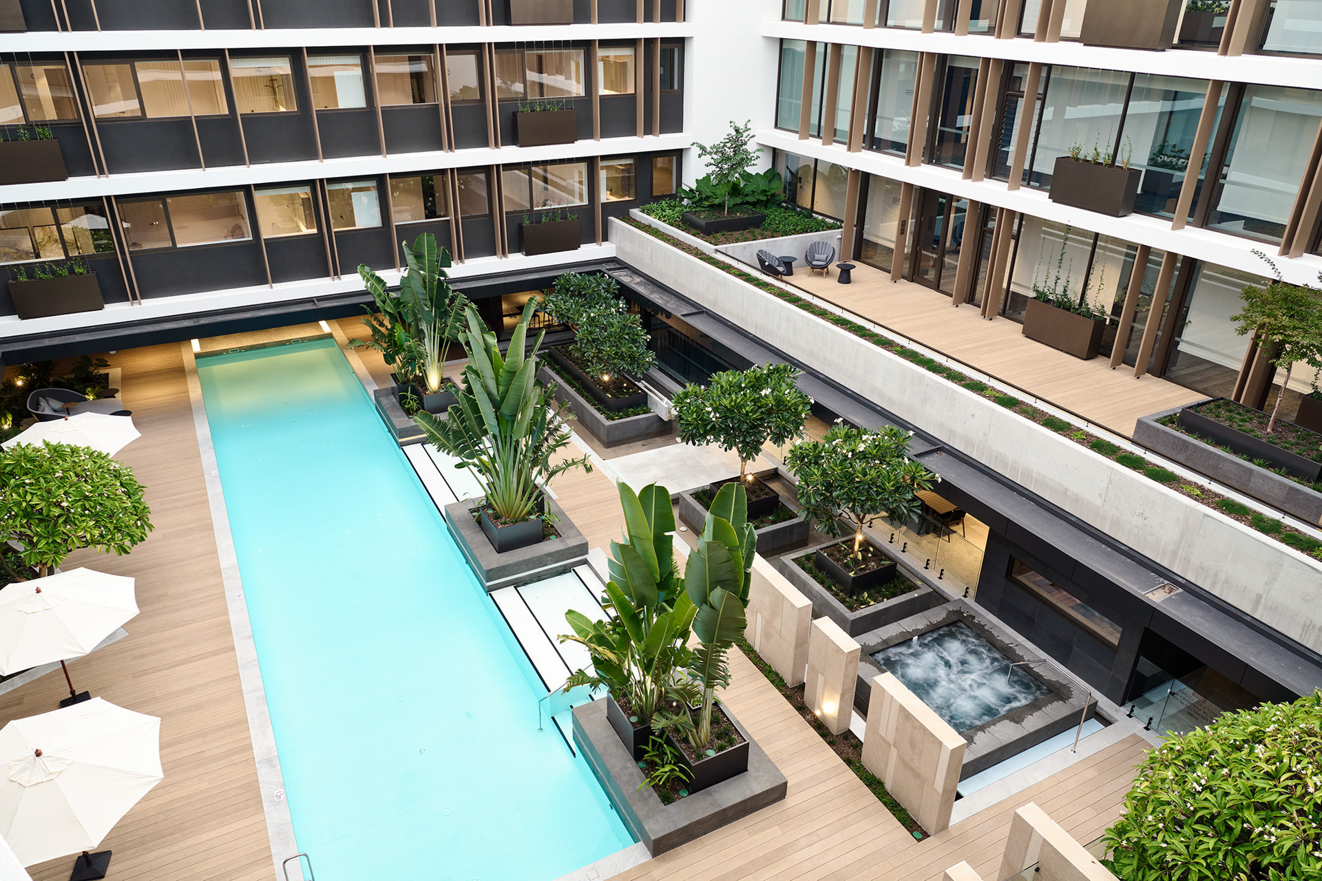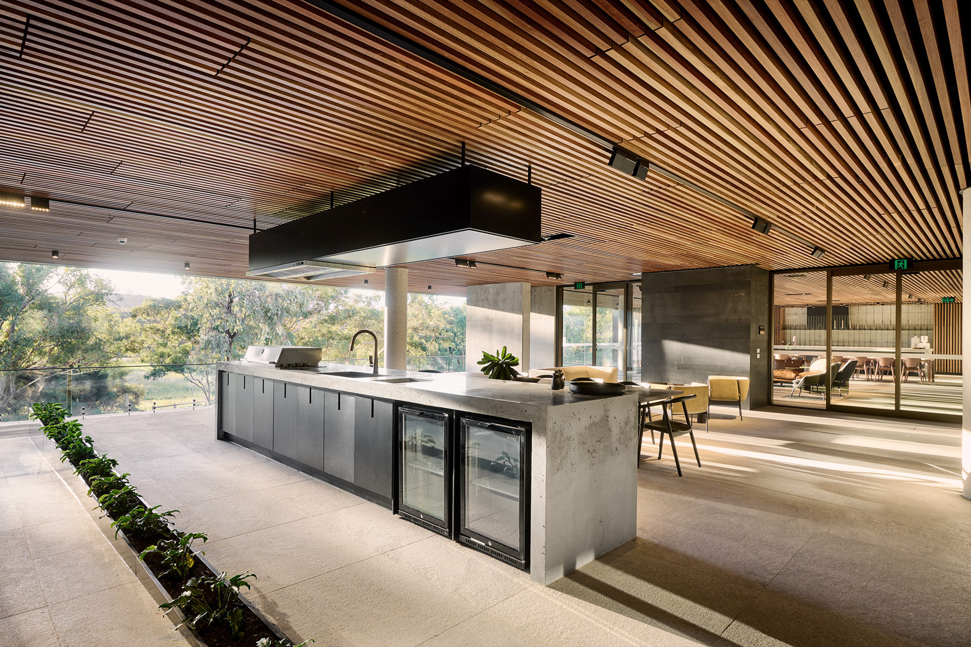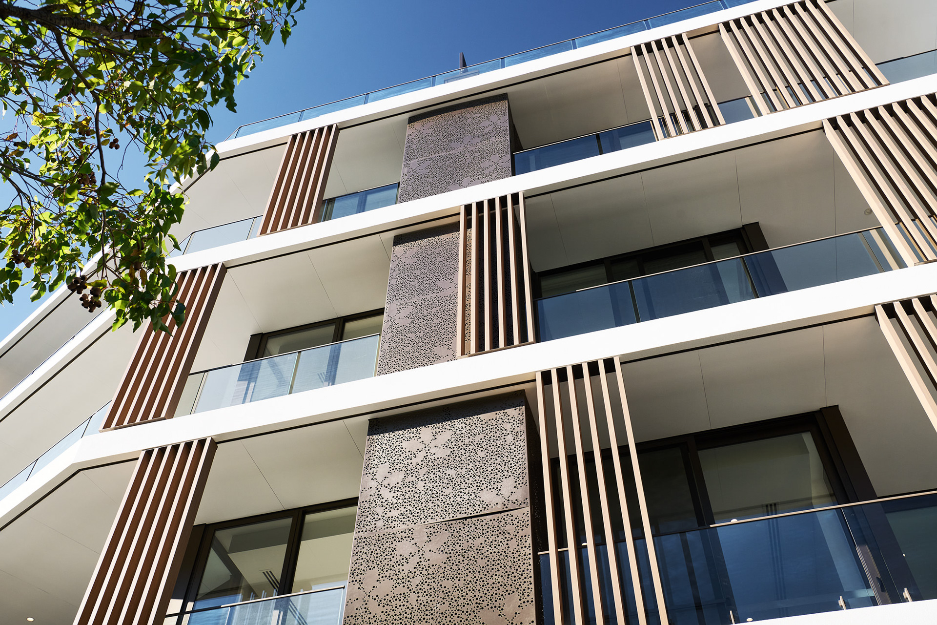 Bold lines, deep balconies and layered textures are coupled with a material palette that is thoughtfully restrained and natural, in keeping with the precinct, while white render contrasts raw concrete tones and softer natural timbers.