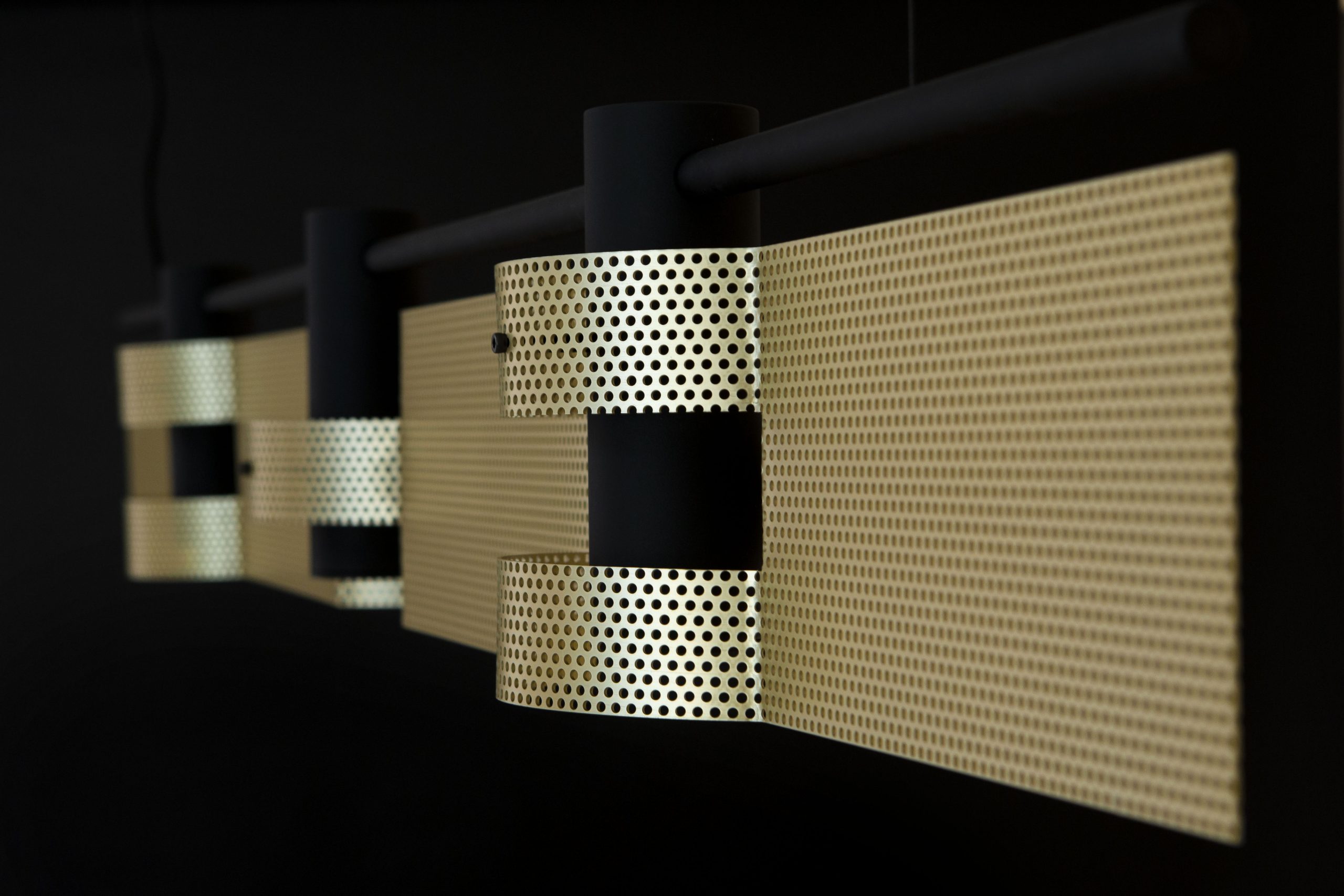 The lighting structure is simple in design, three black light canisters threaded onto a singular connecting rod. The single sheet of pressed metal is delicately attached to the canisters, creating an interesting juxtaposition between the structure and form. The pressed forms and perforations create varying material layers, as one moves around the pendant, the shape, transparency and light patterns change.