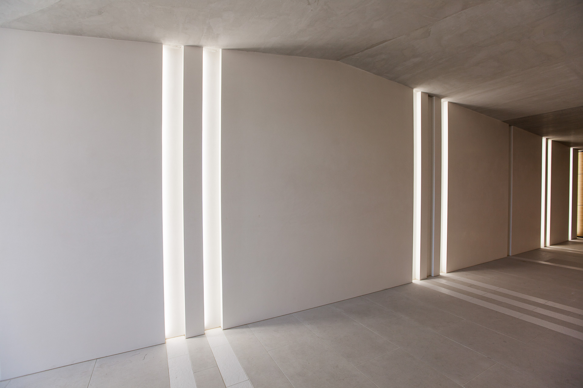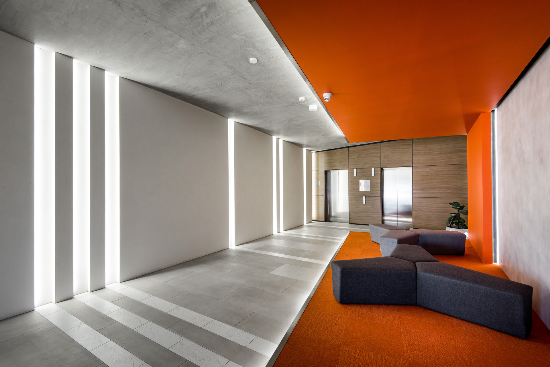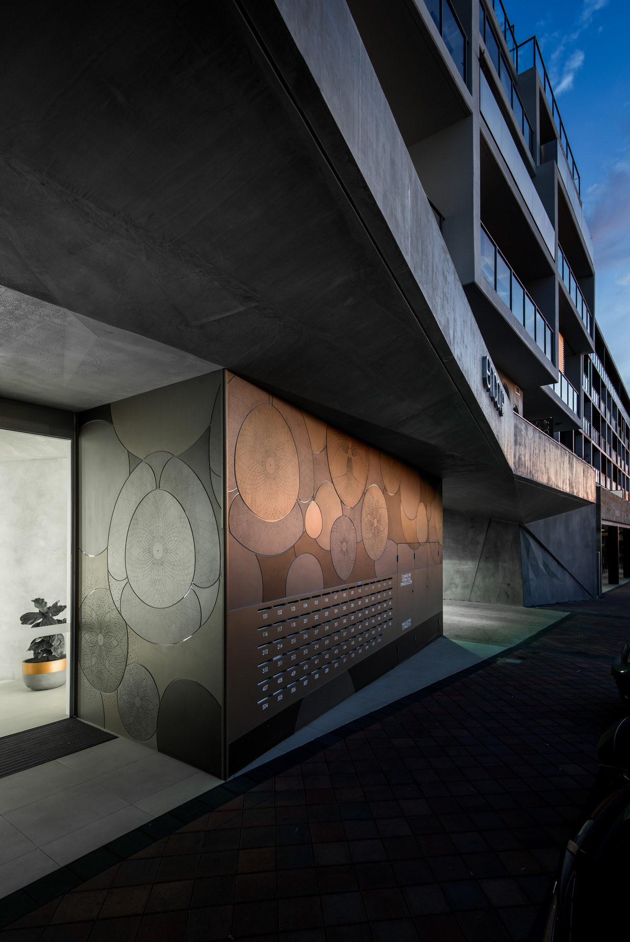 The difficulties of planning apartments on a deep square lot were overcome through the use of carefully placed light-wells and a highly-efficient, H-shaped circulation core. Deep balconies push forward and back, avoiding the repetition inherent in multi-story buildings. Further articulation is created with a series of planter boxes and alternated timber panelling. At street level, the architect collaborated with a local artist to develop both the sculptural concrete canopy and perforated metal façade panel. The raw, embossed canopy carries through into the lobby area, connecting public and private spaces.