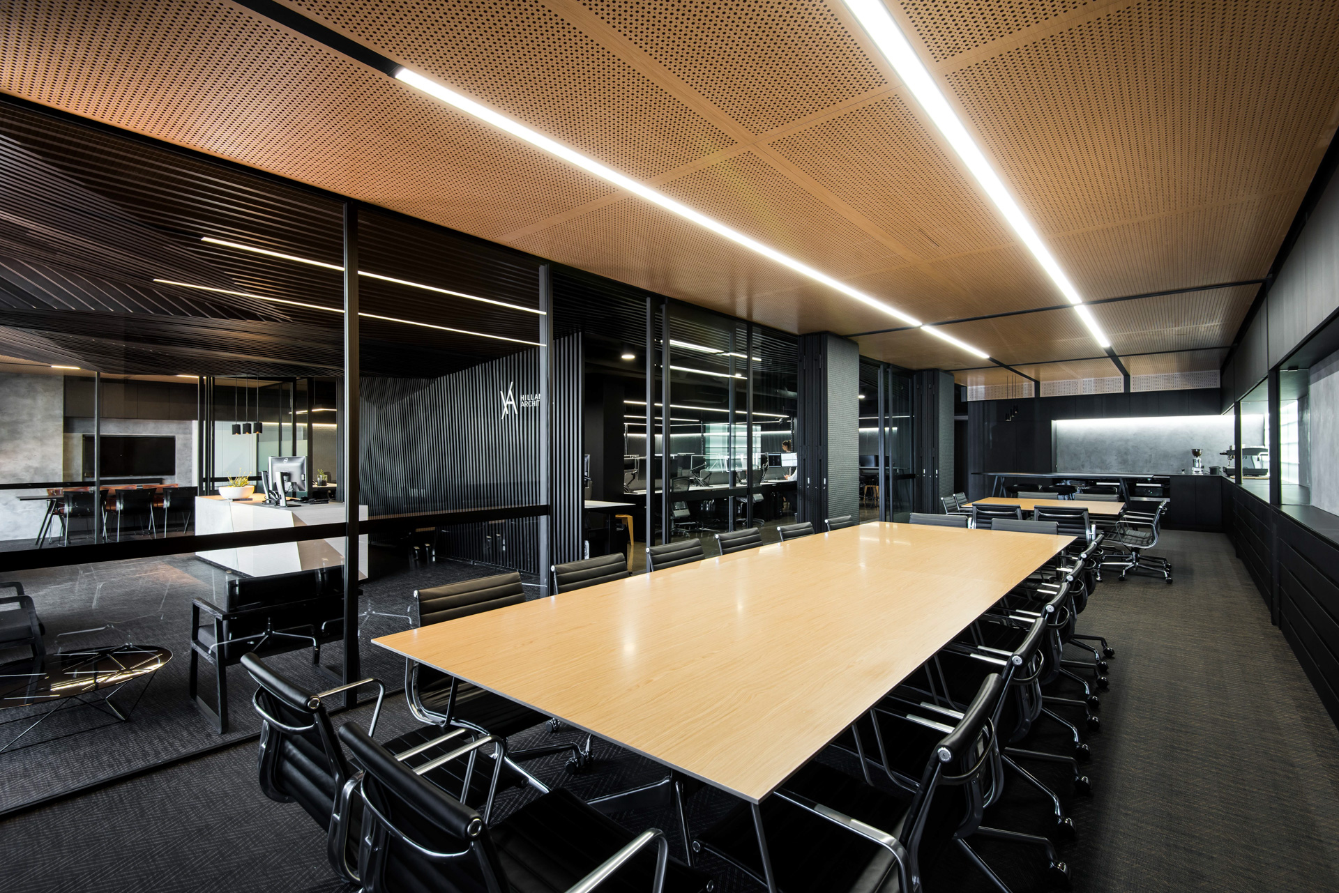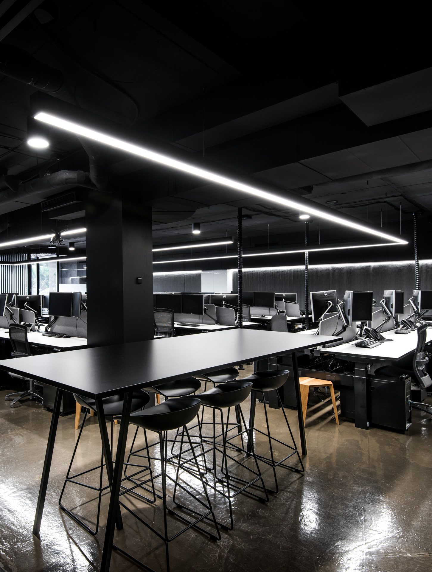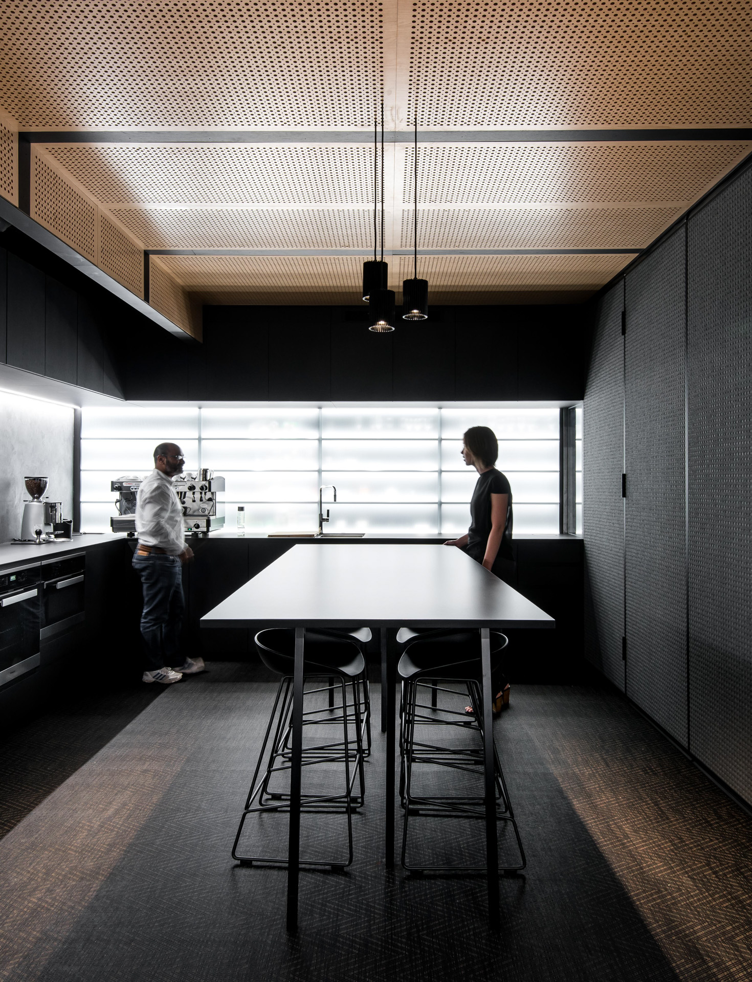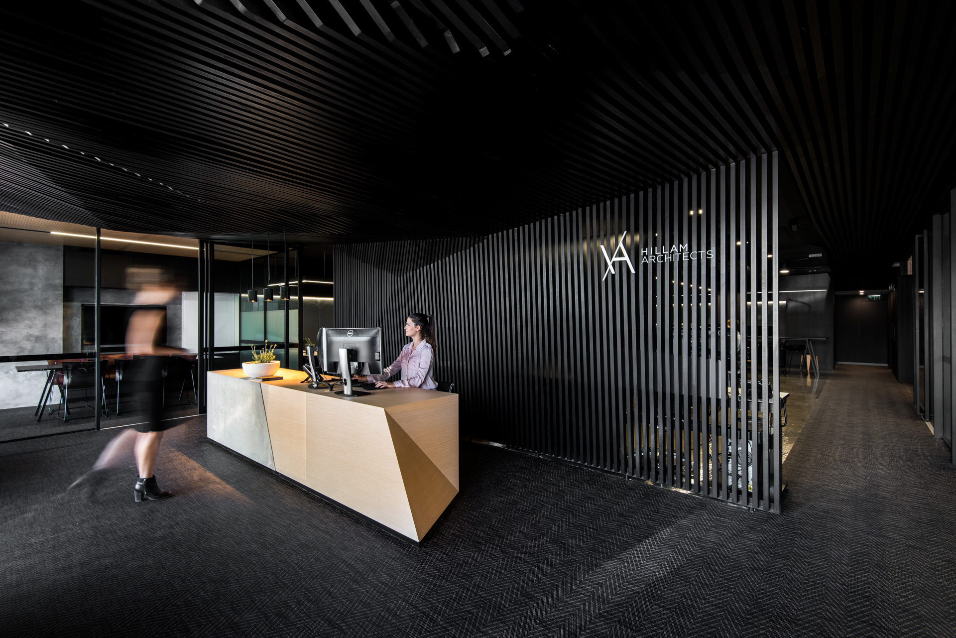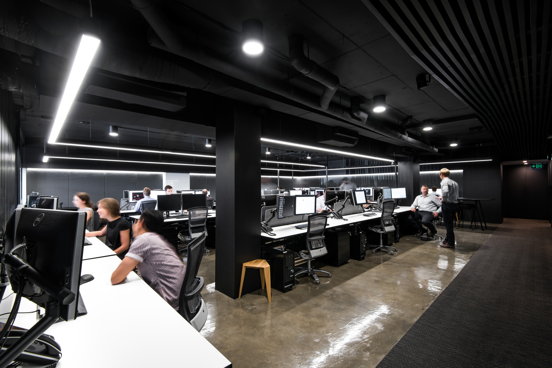 The restrained palette is predominantly timber, concrete and glass. The existing concrete slab, structure and services were left exposed and painted out, then paired with a directional lighting concept resulting in an interior that speaks of a dynamic, yet modern industrialist vibe.