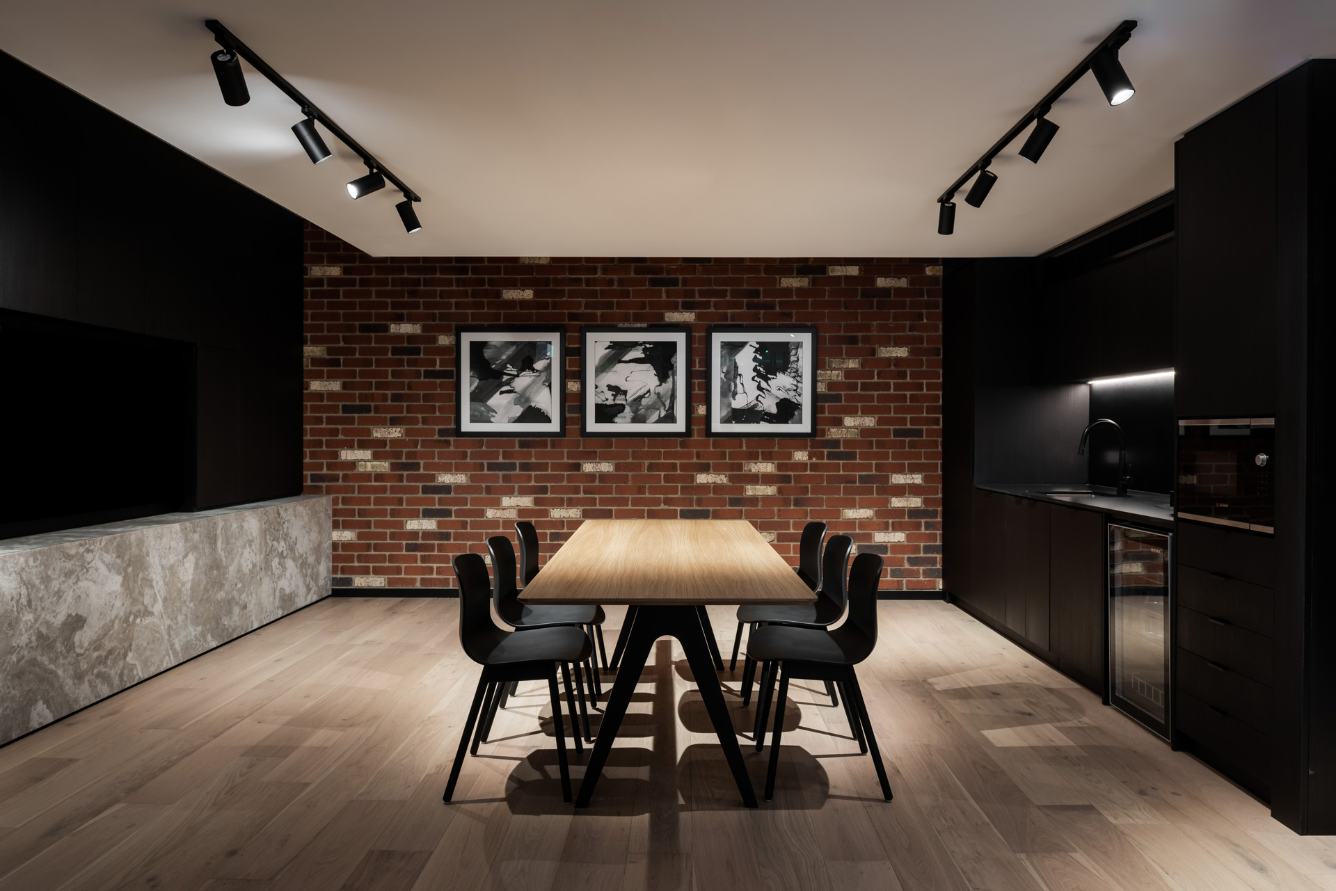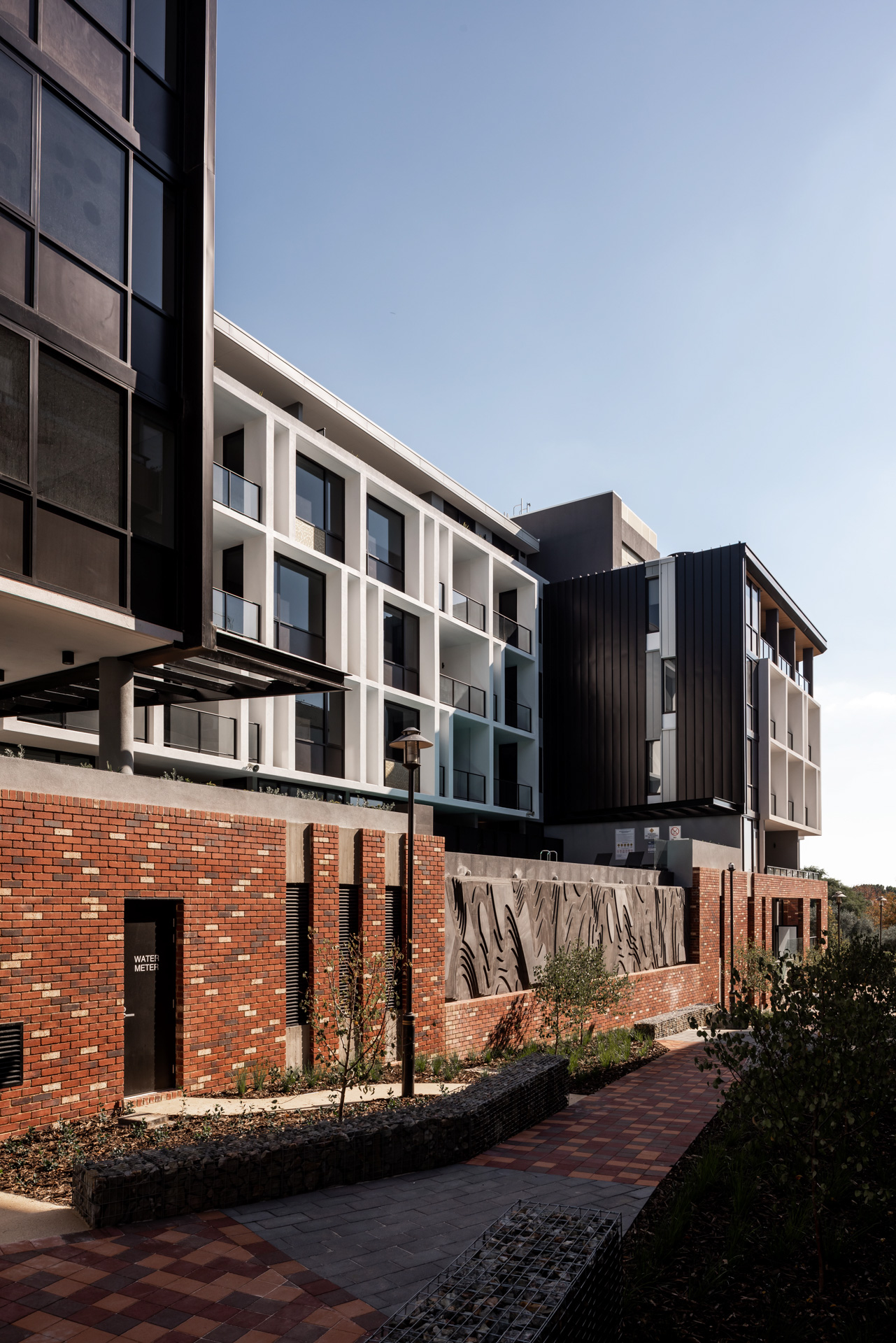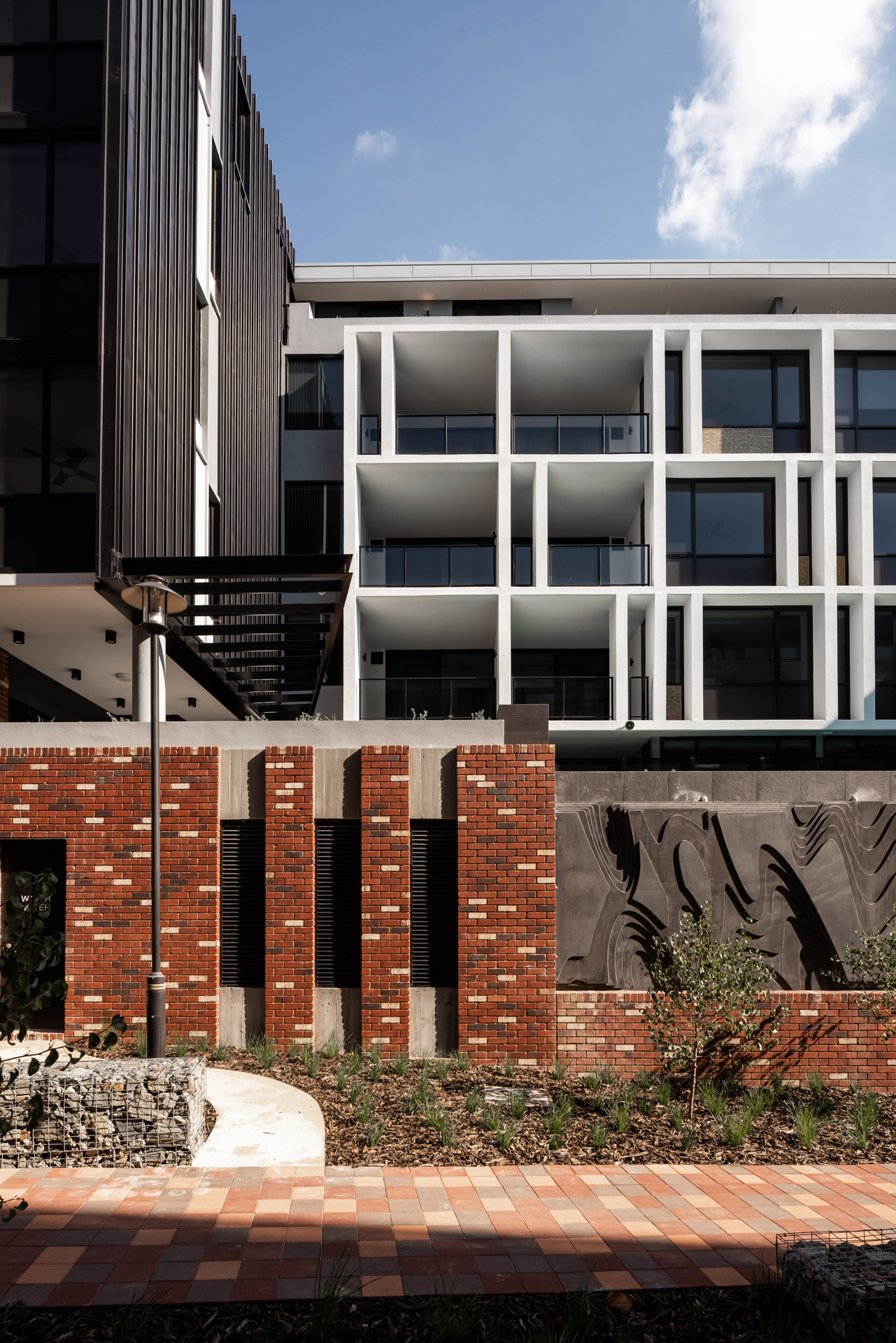 Recycled red face brick is used to treat the podium-style base, which is revealed as the site slopes away from the street. In conjunction with this, off-form board marked in-situ concrete panels are used to provide warmth and texture at human scale. Off-form concrete soffits are also used selectively at prominent balcony locations. Standing seam metal cladding in black Colorbond wraps and folds over the building, starting from Price Street. With a high degree of articulation, simple white rendered framing elements and blade walls on the upper levels are an expression of both horizontal and vertical, inspired by the method of stacking pottery in the kiln which creates a grid-like arrangement.