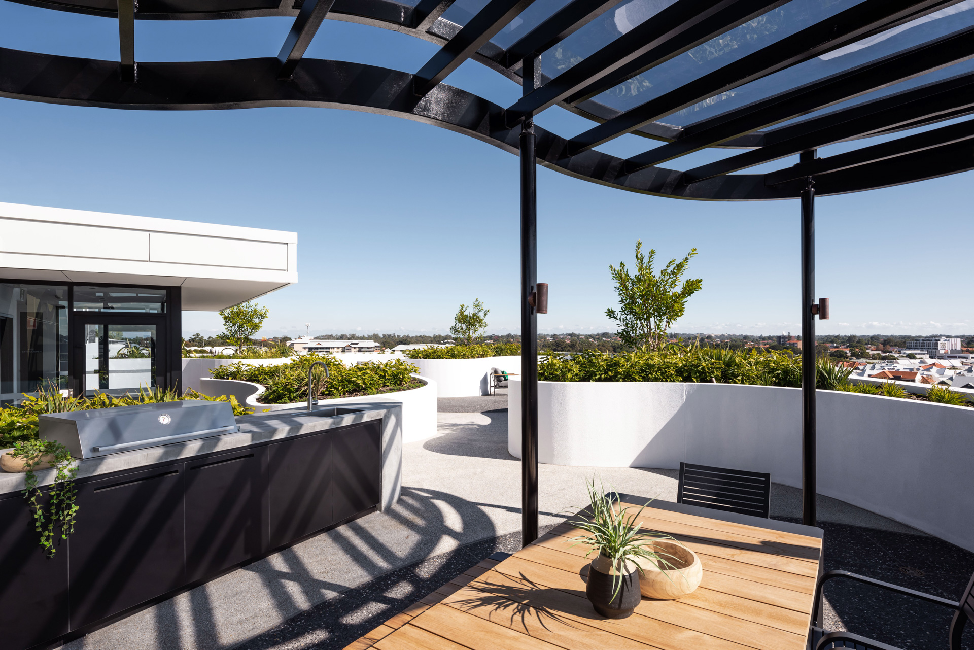 Residents have access to common area facilities such as Gym, Lounge, Media Centre and Pool Deck with BBQ cabana on Ground Floor. A rooftop garden with seating and entertaining area takes advantage of the impressive views to the north and west over the Subiaco Common parkland. The development is bounded on all sides by the public realm, and adjacent the major north-south landscaped pedestrian thoroughfare or “green spine” within the precinct. Given its landmark corner location and the heritage significance of the site, the architectural response is a contemporary industrial aesthetic with simple but bold forms.