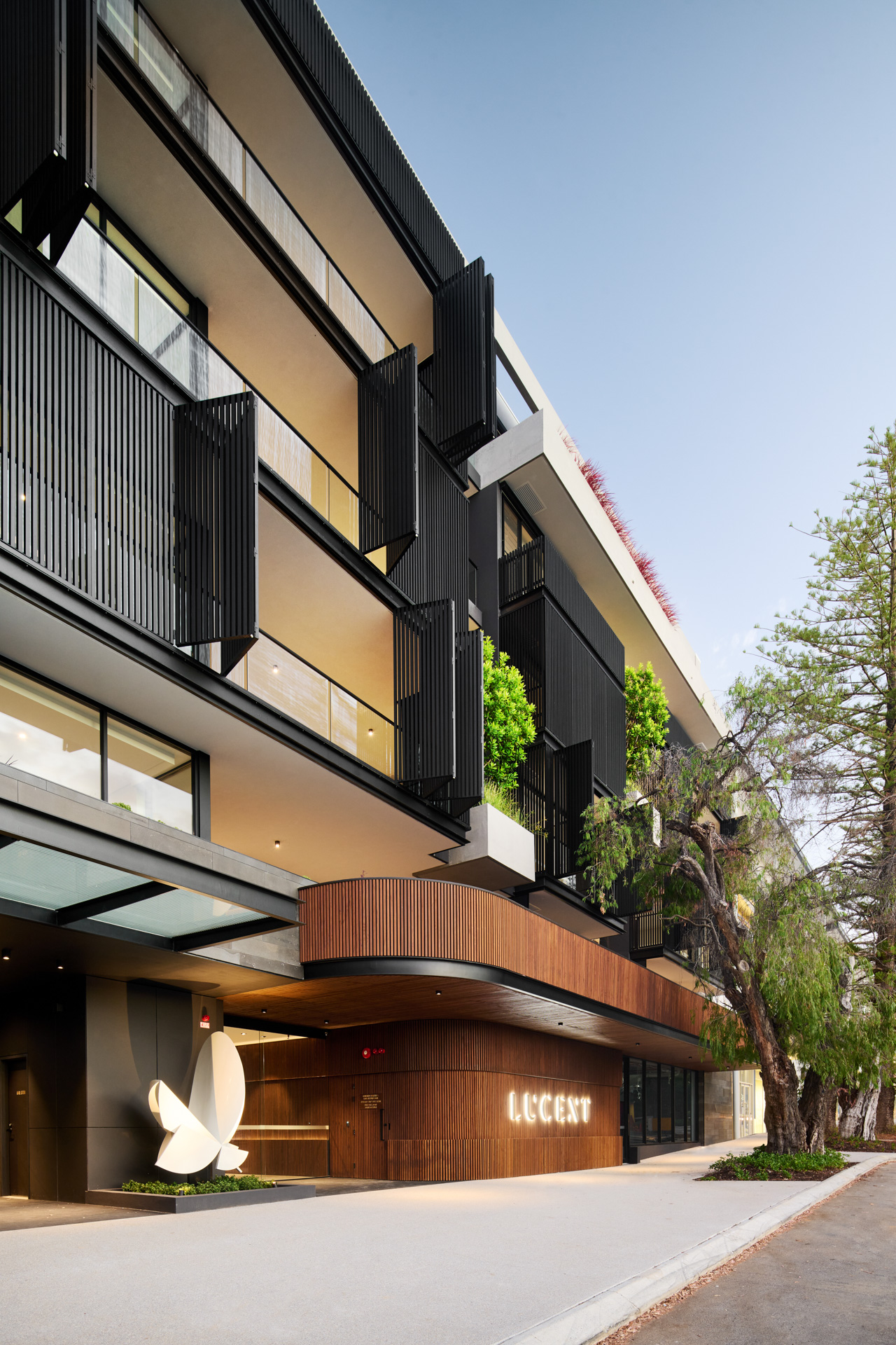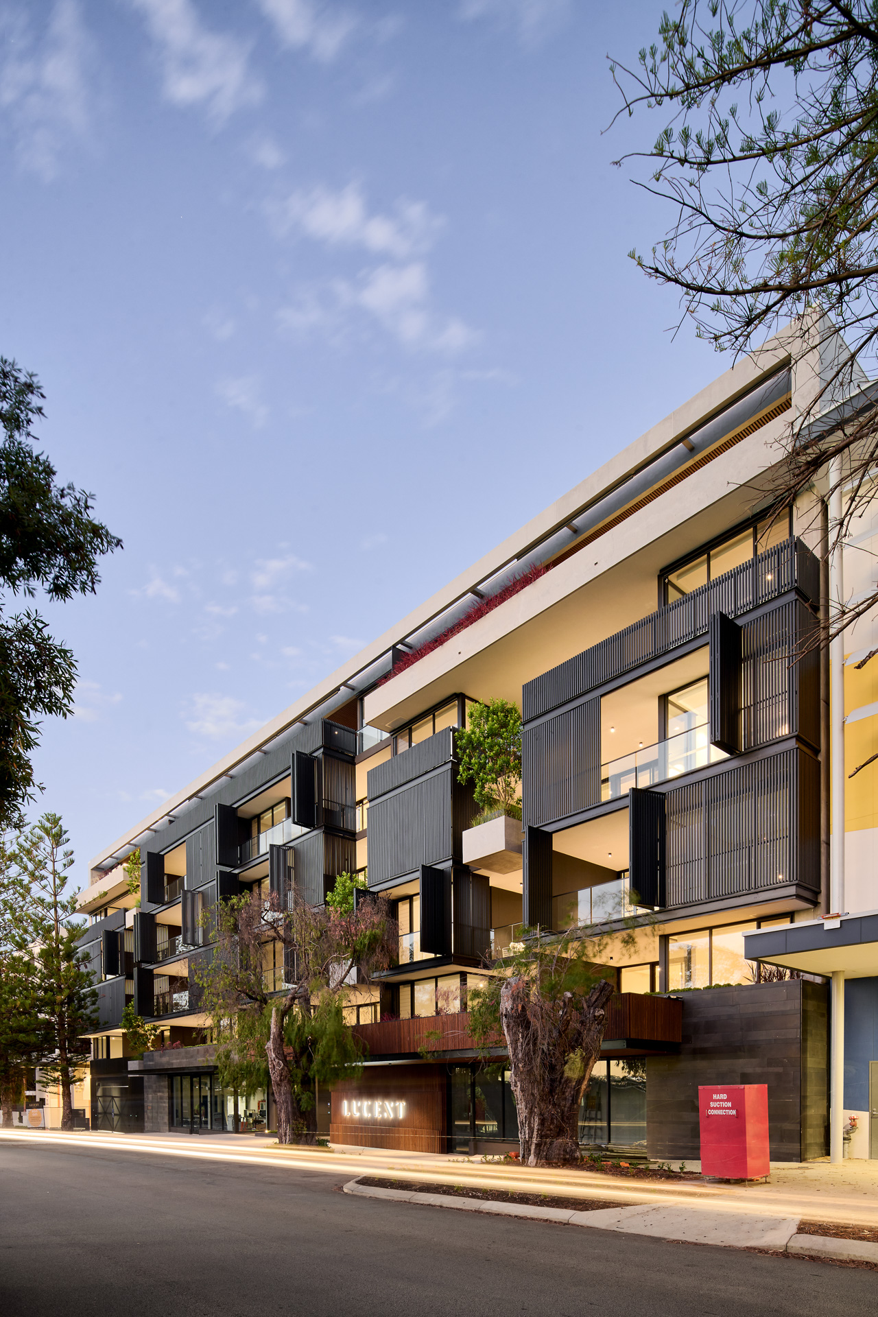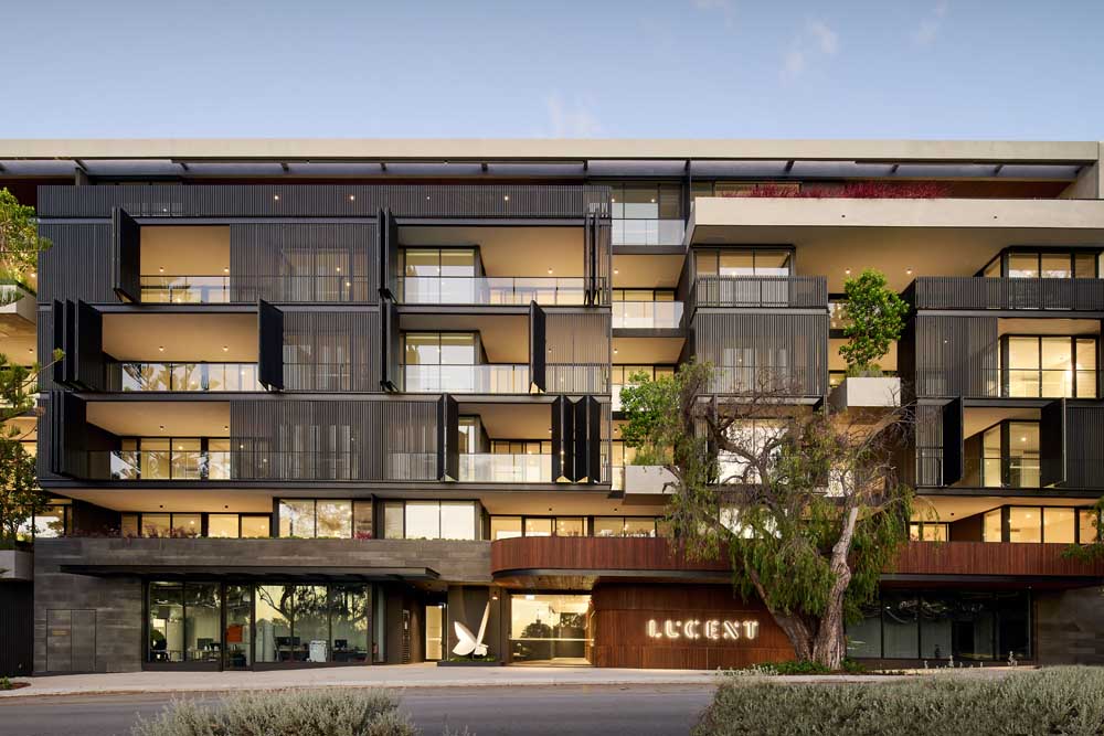 The articulation of the Lucent’s building form combines a number of important themes within Claremont’s North East Precinct and wider urban context. 39 apartments are configured over 5 levels around a central courtyard that provides shelter from the prevailing winds but allows extensive natural light and ventilation to the common corridors and circulation.