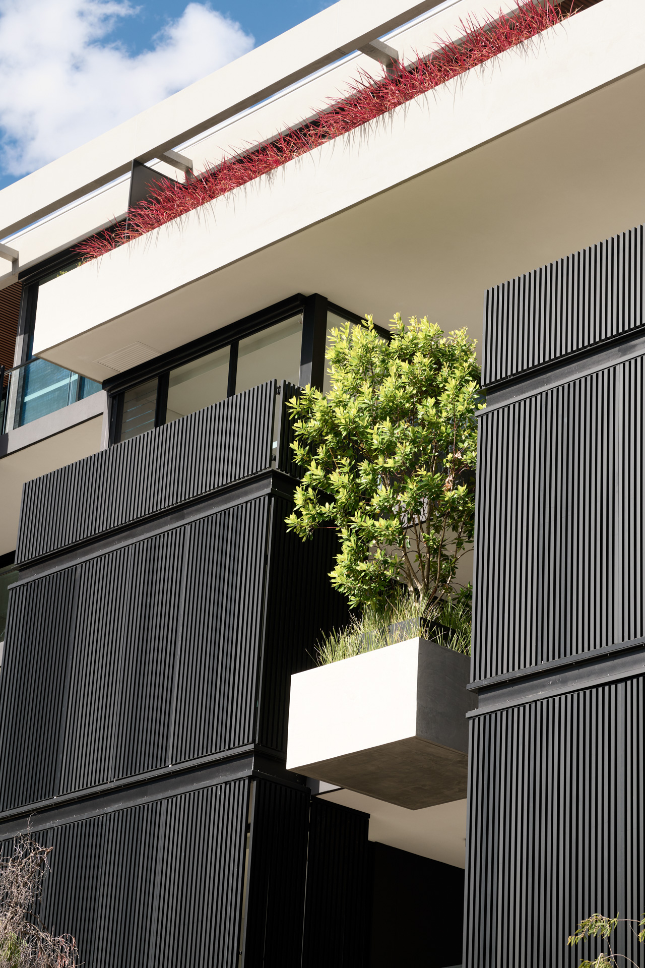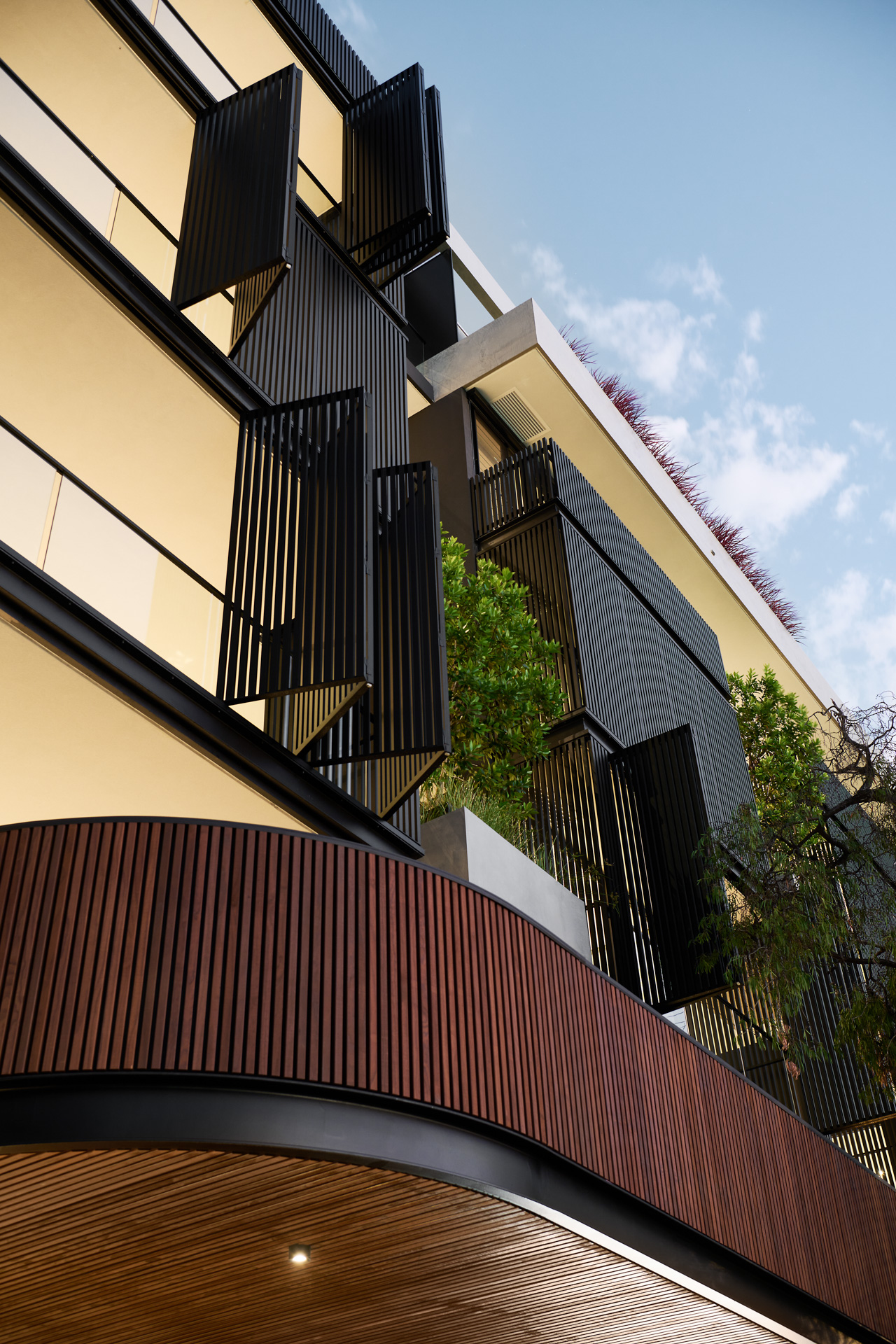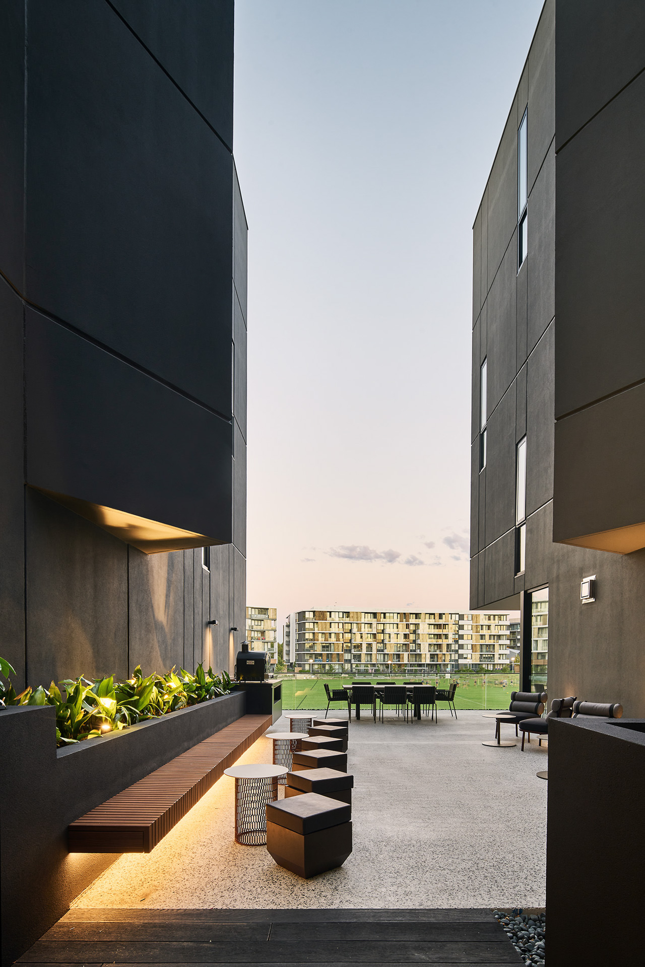 The facades are articulated with extensive planter boxes and voids for feature trees that bring life and vibrancy to a fairly sterile corner of the precinct. Natural timber and stone throughout the project exude sophistication and warmth aiming to attract the discerning downsizer market.