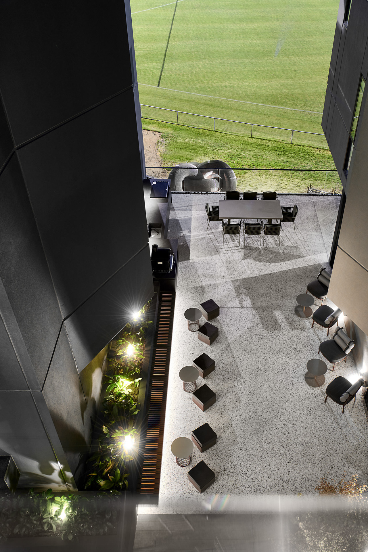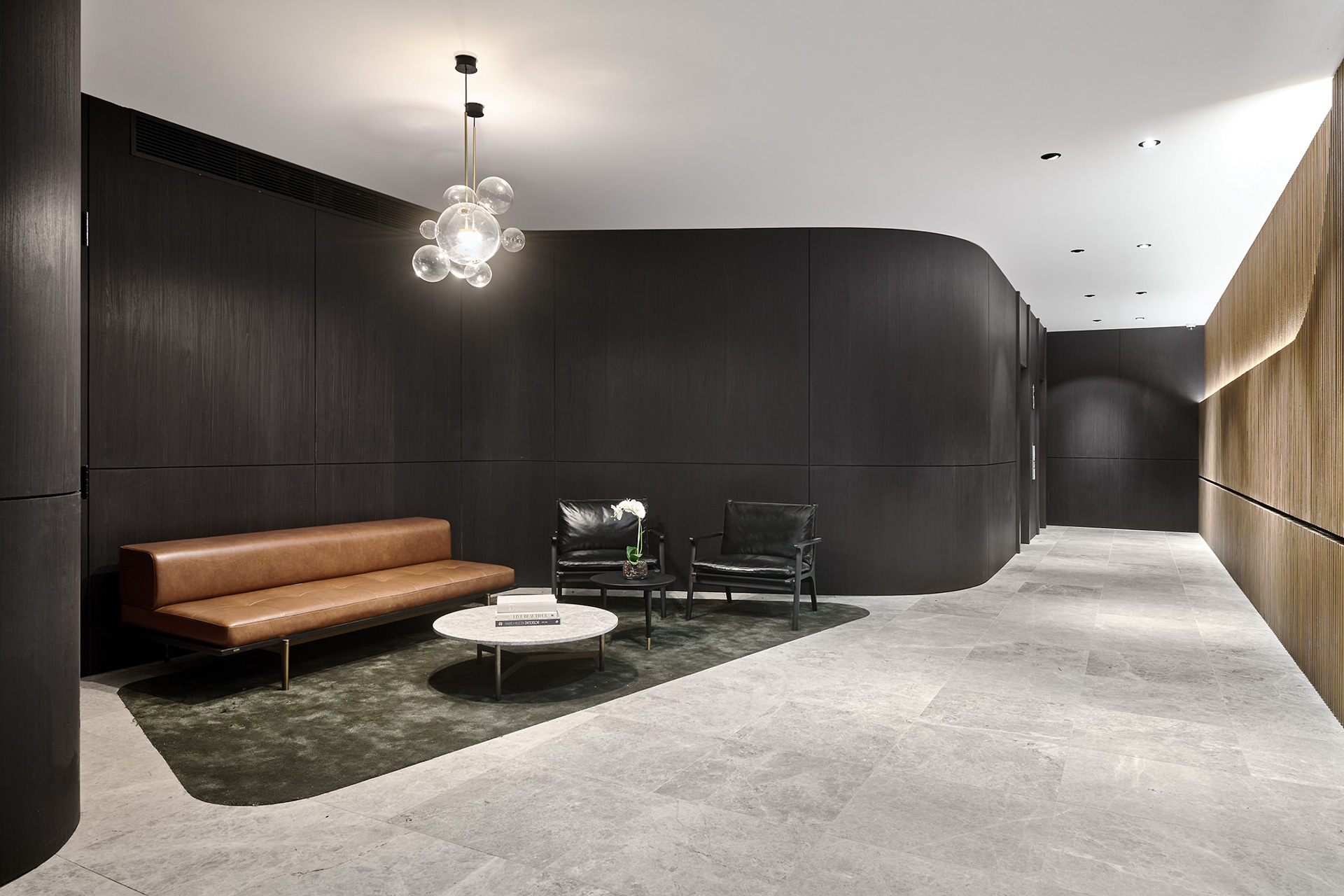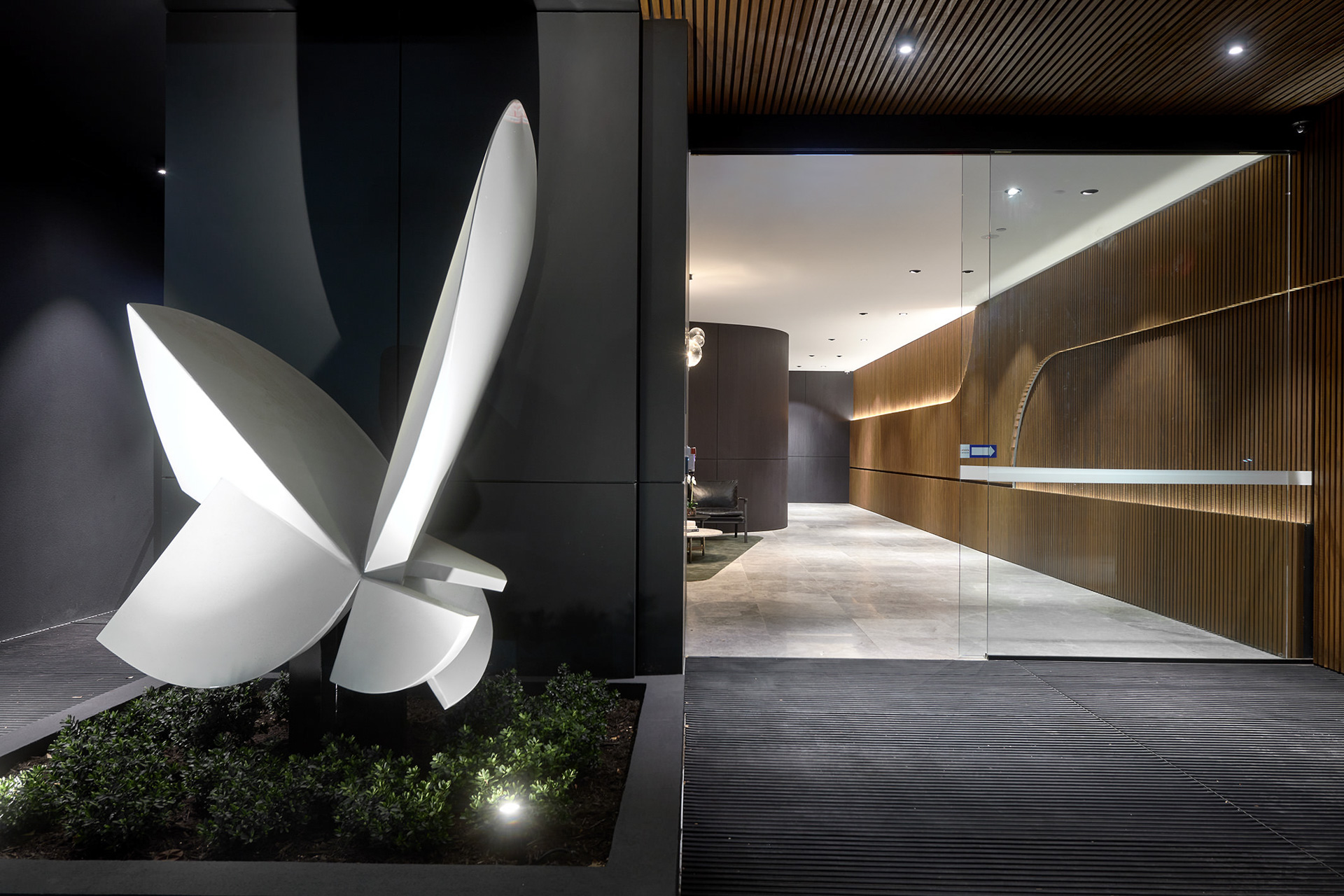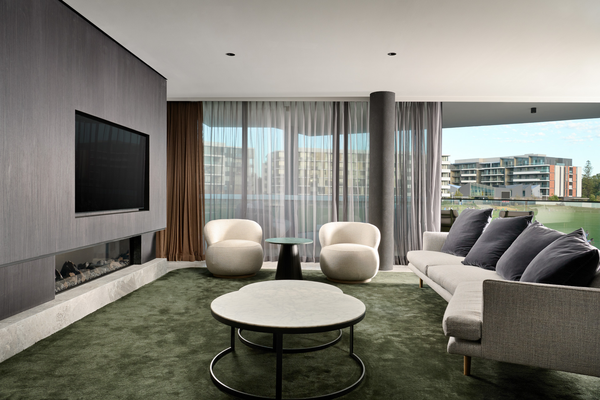 The facades are articulated with extensive planter boxes and voids for feature trees that bring life and vibrancy to a fairly sterile corner of the precinct. Natural timber and stone throughout the project exude sophistication and warmth aiming to attract the discerning downsizer market.