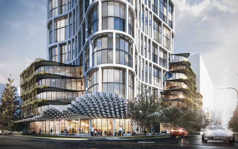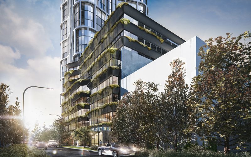 The building envelope is sculpted into a dynamic tower form with soft curves on all corners that helps to maximise potential views from occupants and minimise overshadowing on neighbouring lots. The podium is peeled off from ground to the upper levels, emphasising the effect of the tower hitting the ground.