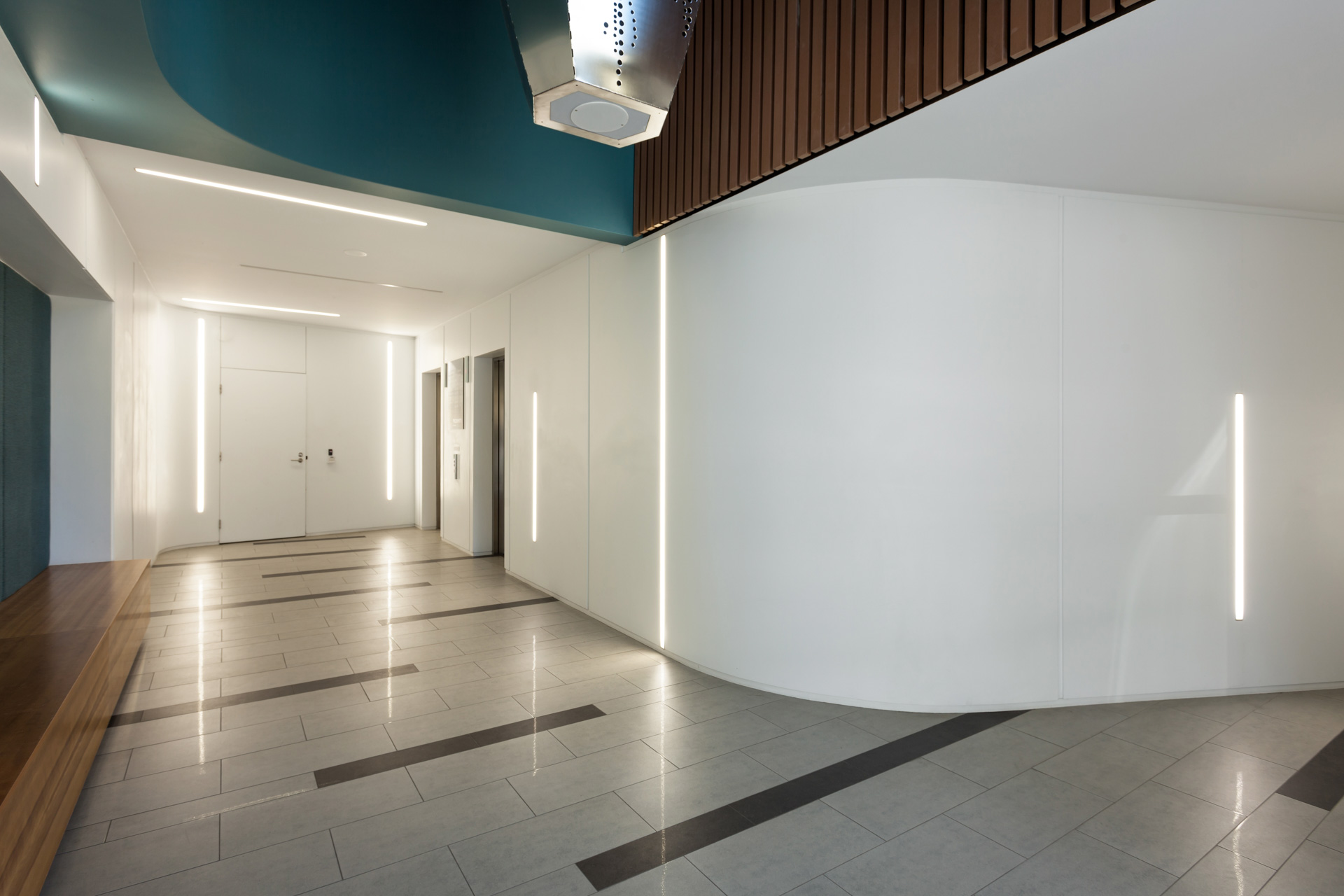 The building is a highly-articulated, contemporary piece of architecture featuring a mix of hard and soft finishes. The sensuous sweep of the timber façade elements softens the building form. Various cantilevered elements create an attractive building façade with artist-designed screens and soft landscaping activating the pedestrian experience.
