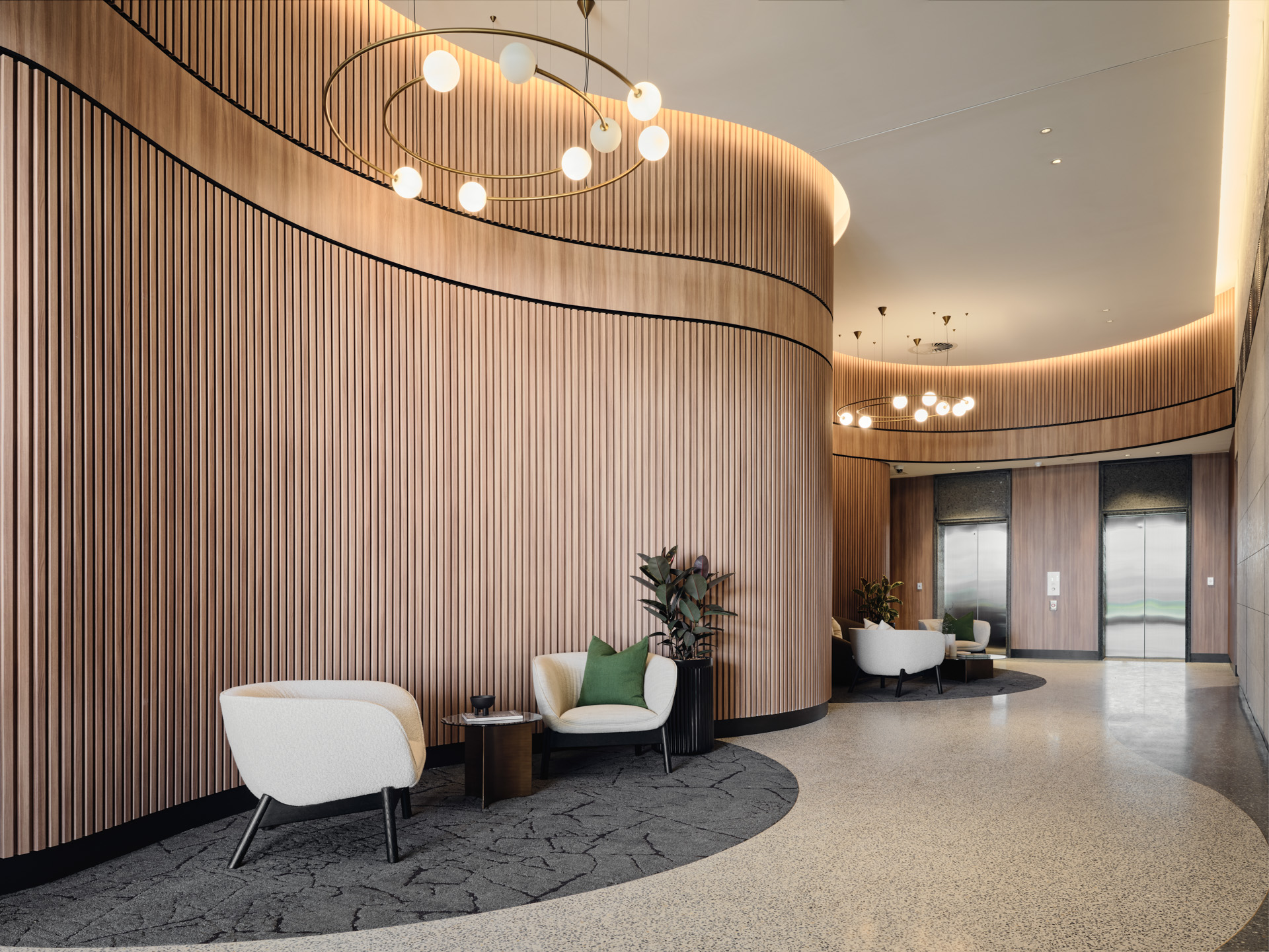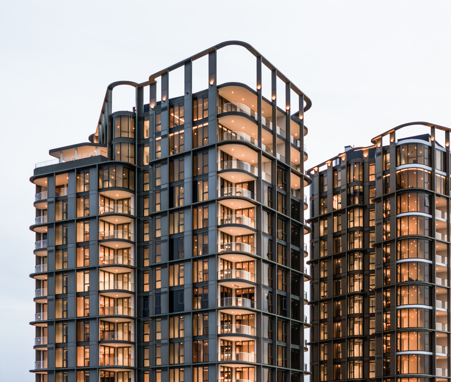 The organically shaped towers have been designed to promote view corridors through the site while reducing the perceived bulk of the towers. This has been achieved by stepping sections of each tower and curving all corners to soften the massing. Delicate horizontal and vertical framing around each tower provides further modulation while also providing privacy for residents and neighbouring properties.