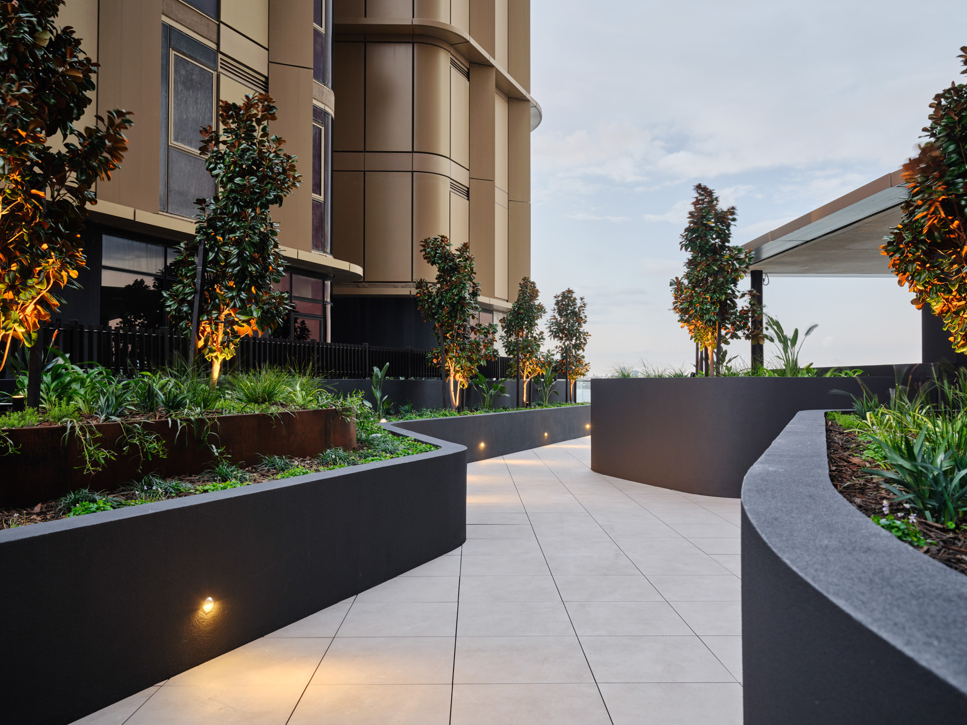 The podium design has been inspired by the local rock formations found along the banks of the Swan and Canning Rivers. This stratified, solid element grounds the building and incorporates generous amounts of planting and vegetation.