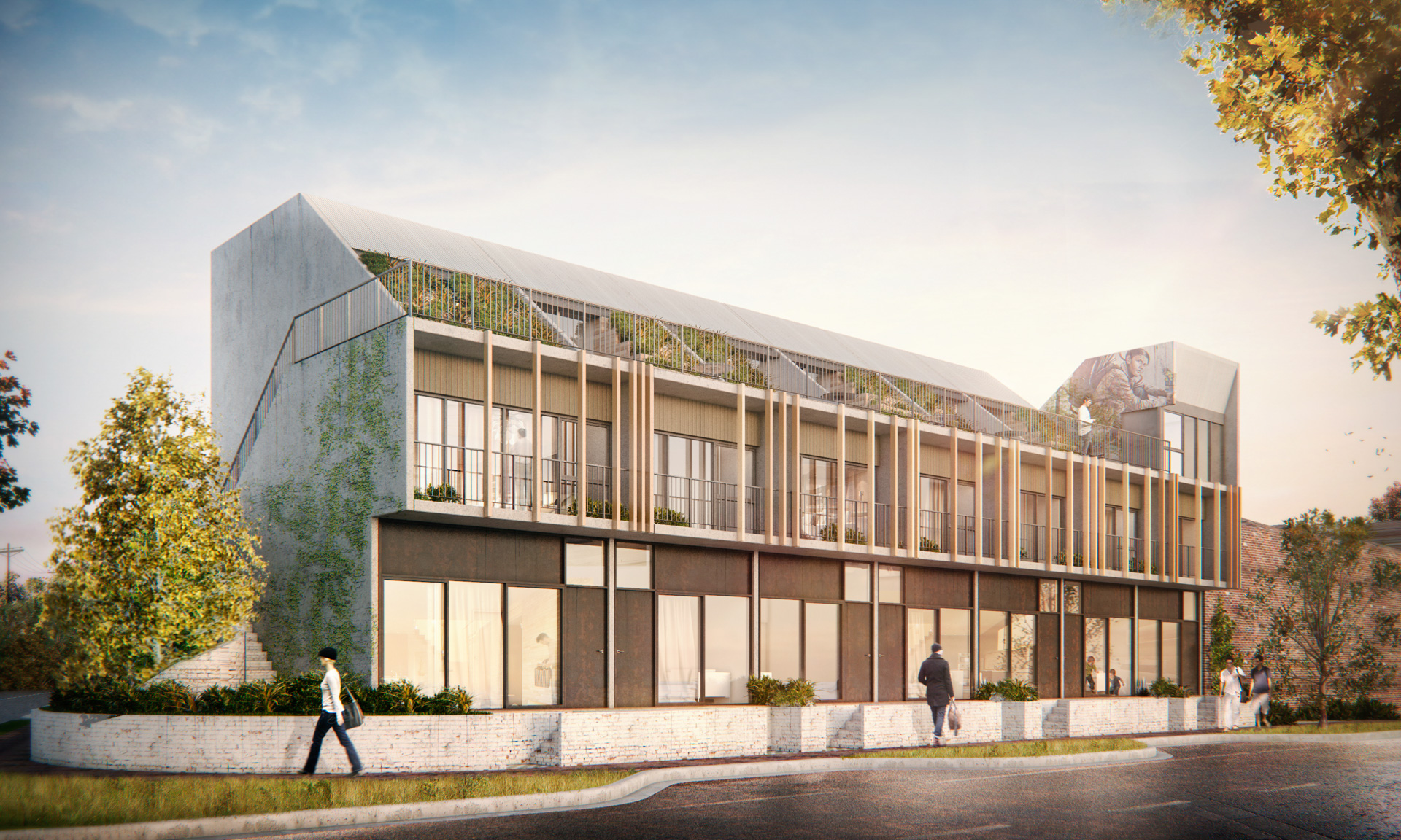 Hillam Architects responded with twelve highly sustainable townhouses, aiming to create a sense of community and shared ownership while maintaining privacy and comfort, through features such as a common roof terrace on each wing of the project, partially divided by the sloping tilt-up concrete panels.