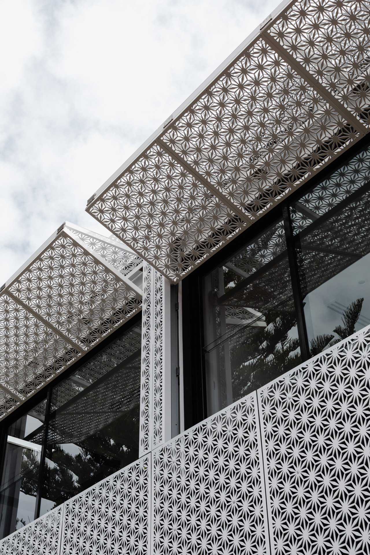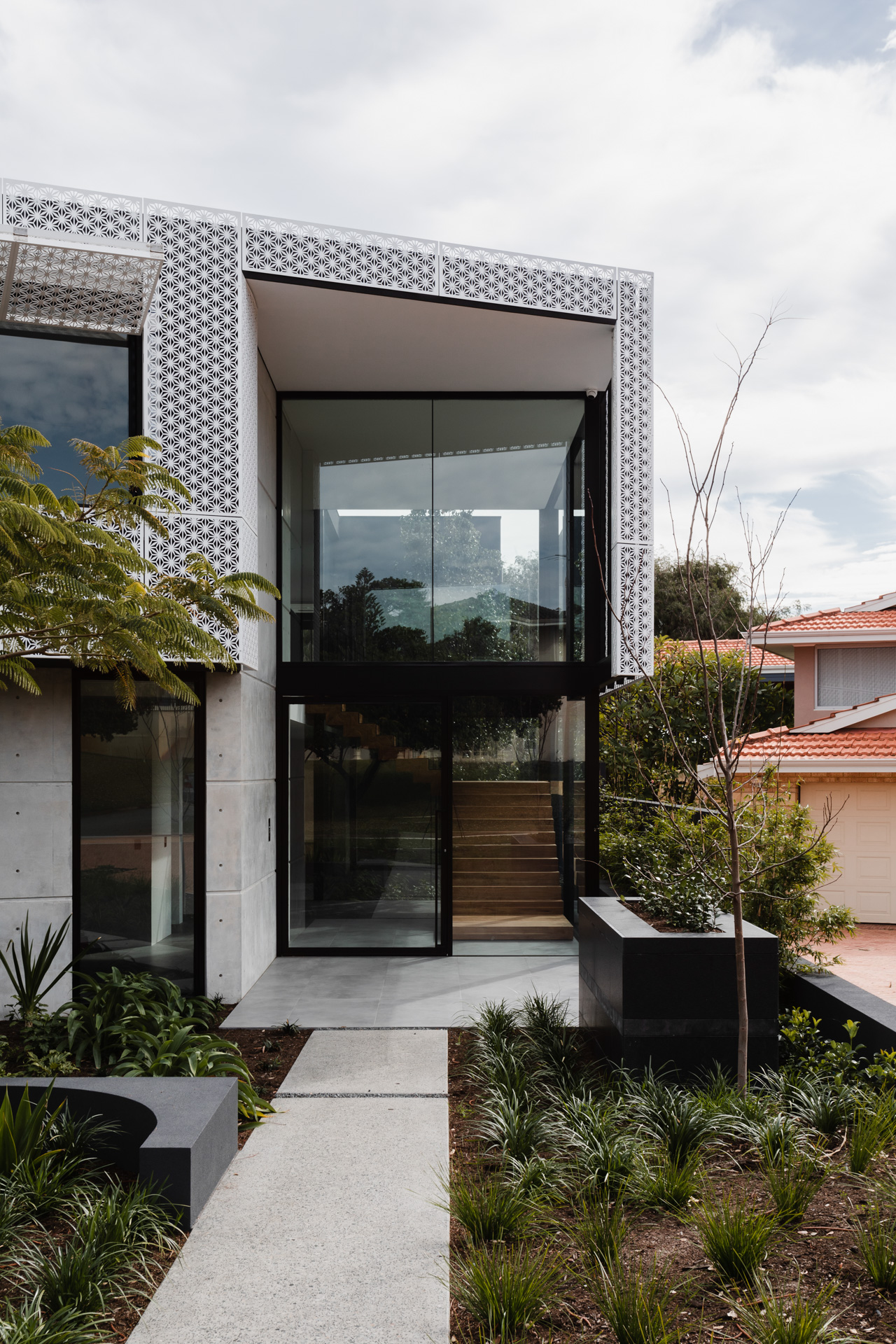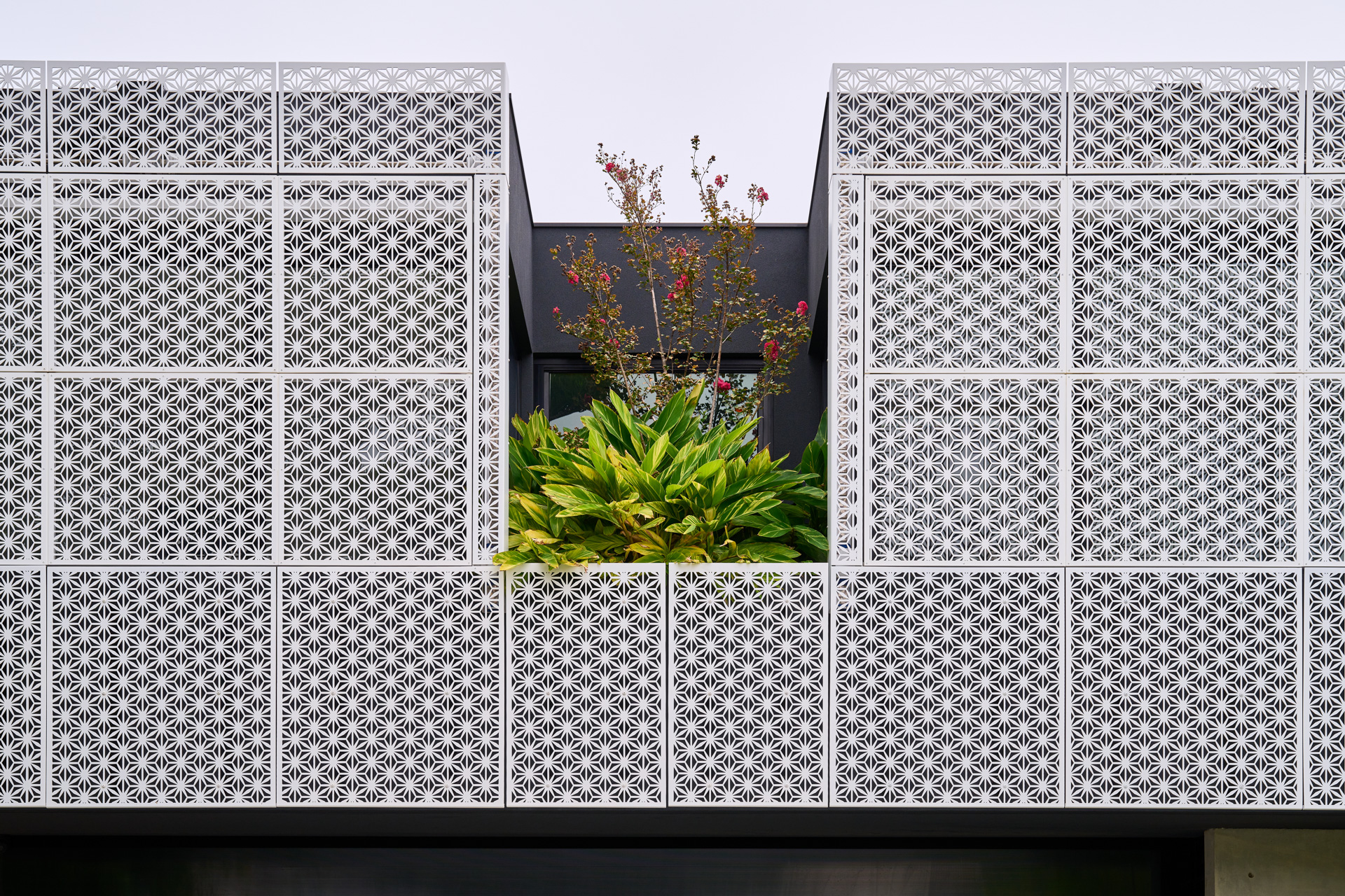 Conceptually, the home blends Japanese & modernist-era in nuances with a restrained palette to create an uncompromising yet versatile family home. Featuring white perforated-metal cladding, the front façade has a series of automated folding screens control privacy and light to the street front. At night, the perforations allow light to penetrate through, transforming the residence into a warm, glowing lantern. A short winding walk through lush vegetation leads to the dramatic double height canopy that frames the entry.