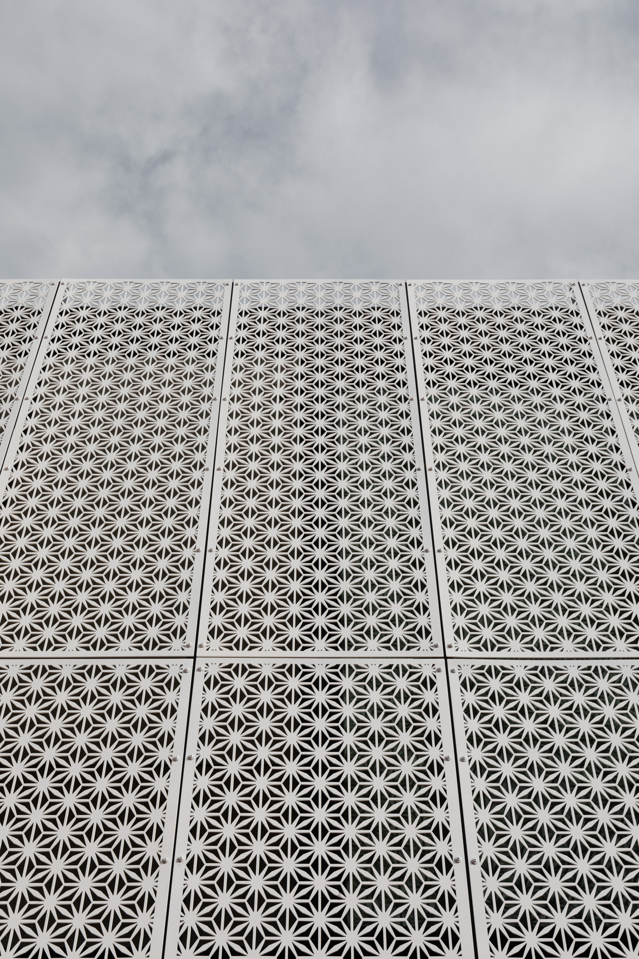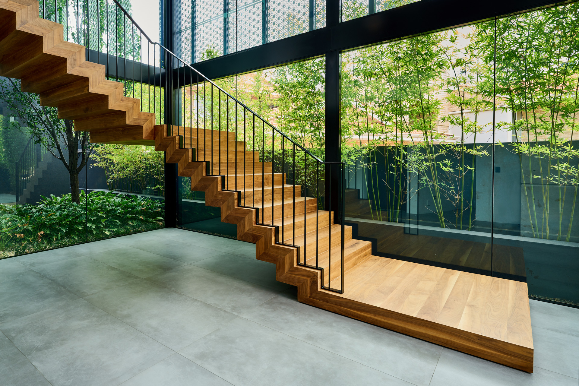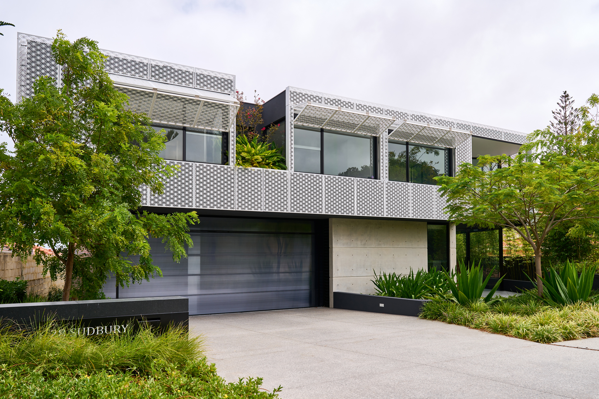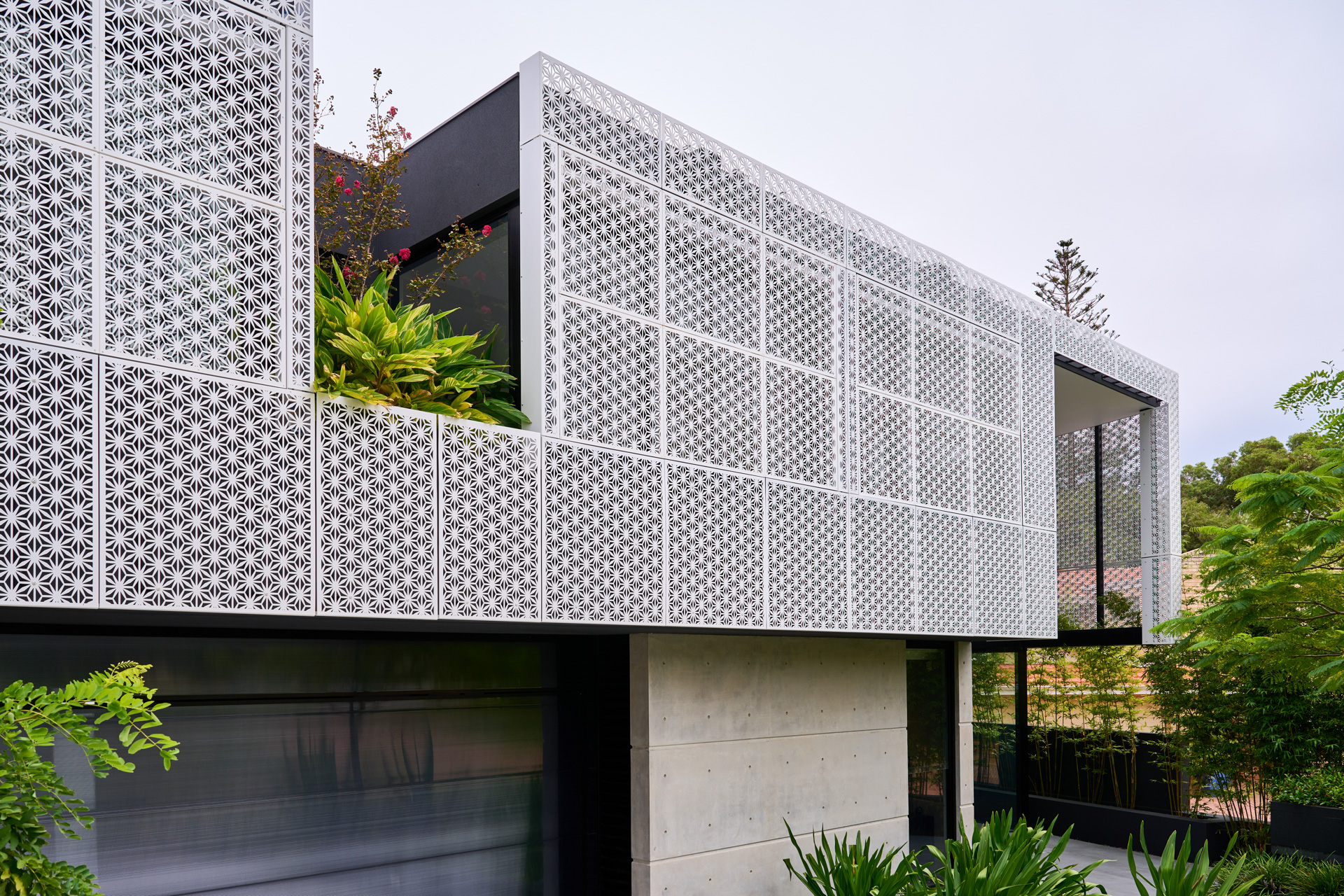 Conceptually, the home blends Japanese & modernist-era in nuances with a restrained palette to create an uncompromising yet versatile family home. Featuring white perforated-metal cladding, the front façade has a series of automated folding screens control privacy and light to the street front. At night, the perforations allow light to penetrate through, transforming the residence into a warm, glowing lantern. A short winding walk through lush vegetation leads to the dramatic double height canopy that frames the entry.
