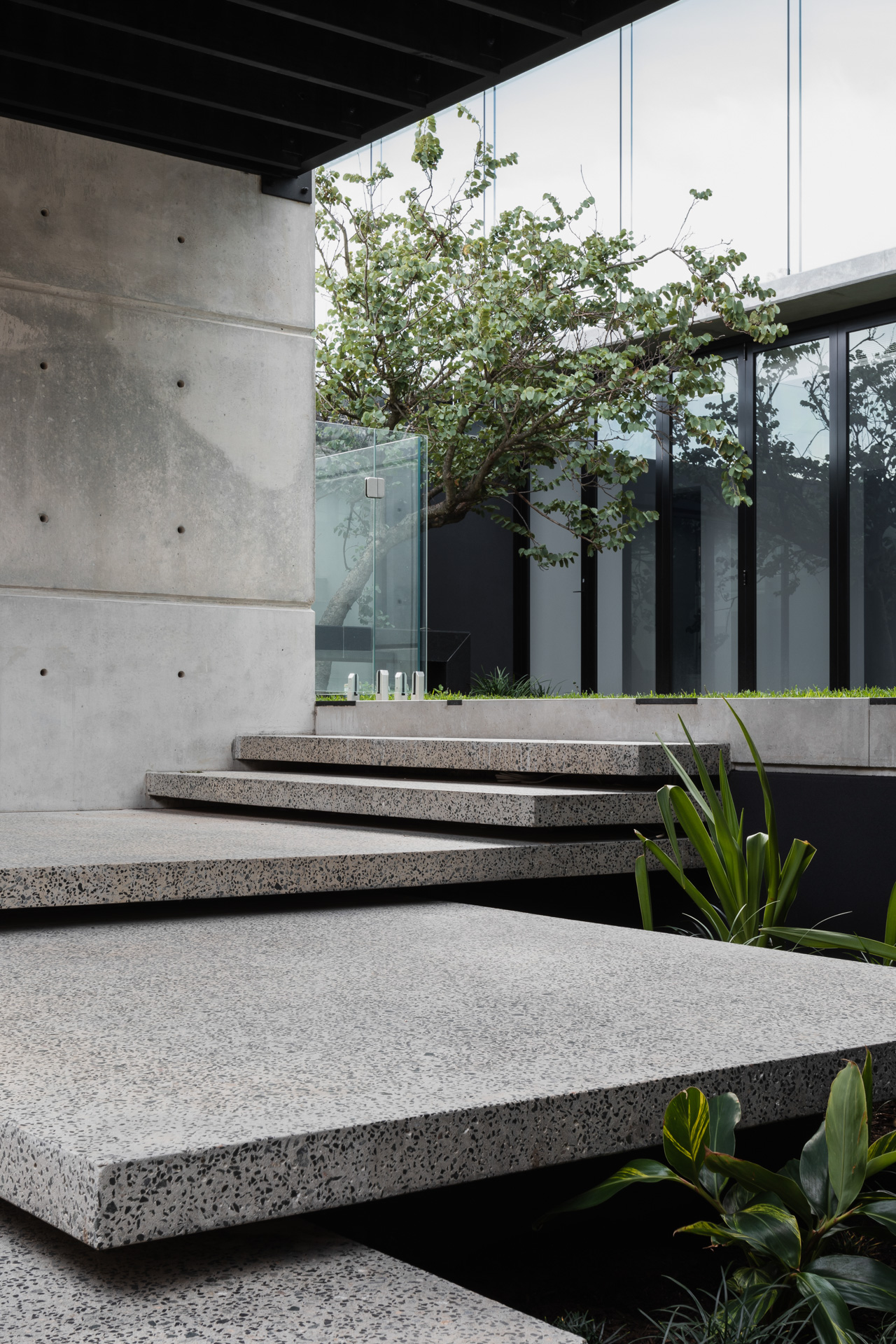 Landscape and planting has been chosen to contrast against some of the austere architecture, softening the elevations and entry experience while providing natural screens against the neighbouring properties. A restrained interior palette is also softened by warmer tones of timber against the natural stone floors and benchtops.