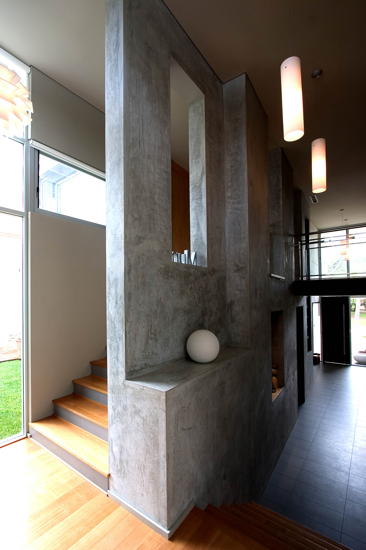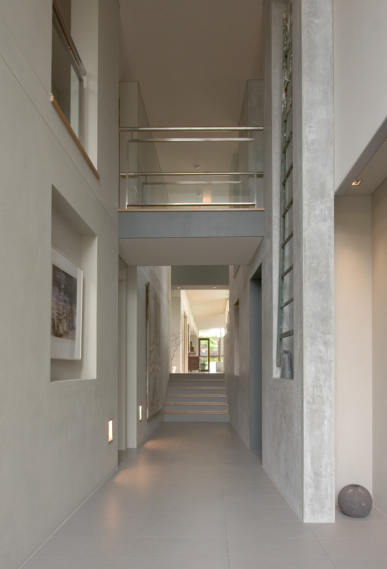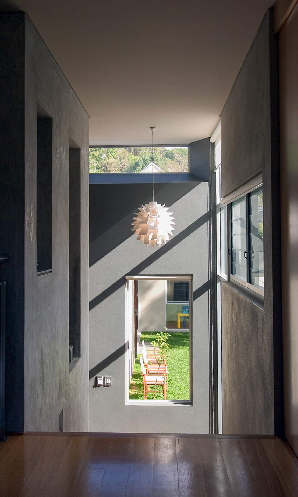 Nonetheless, our design proudly fronts the street in order to capitalise on the northern views to a park. Access to the house is across a timber bridge and through a wooden door which opens into a dramatic two-storey entry void. The architecture is bold, yet sleek and refined, in keeping with the street front.