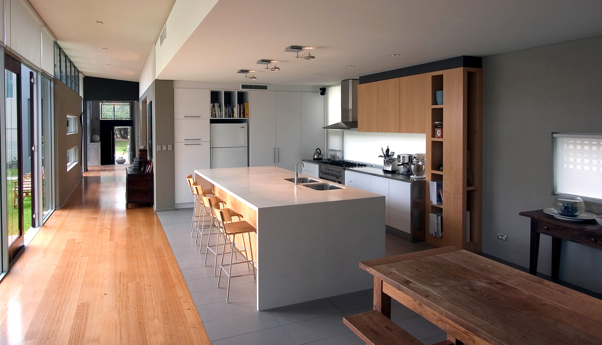 A single-storey living wing forms the hub of the house with the living and dining areas allowed to expand outwards to soften the distinction between indoors and outdoors.