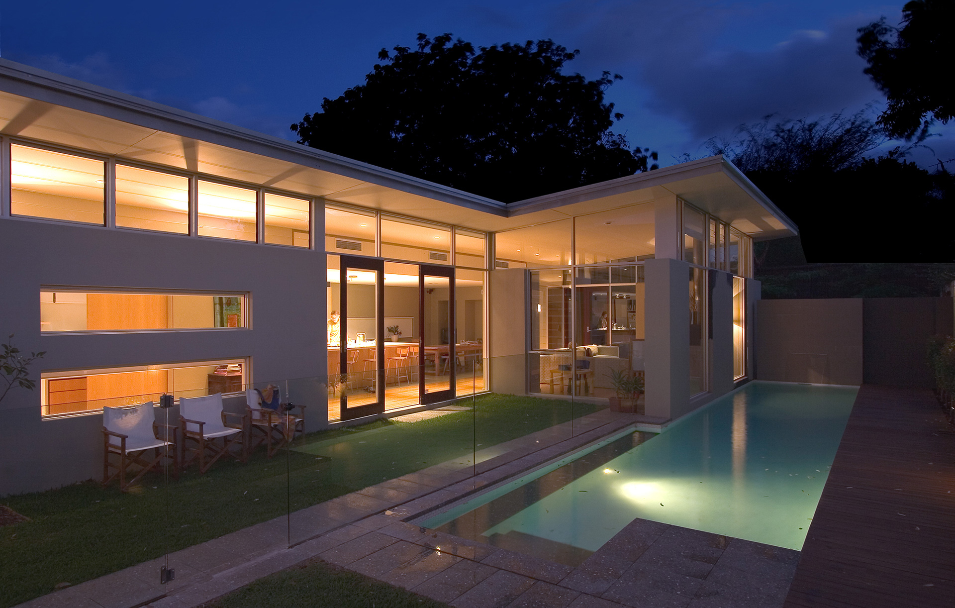 At the rear, the home wraps around a grassed entertainment area and a pool court with extensive glazing to connect these areas with the main living space.