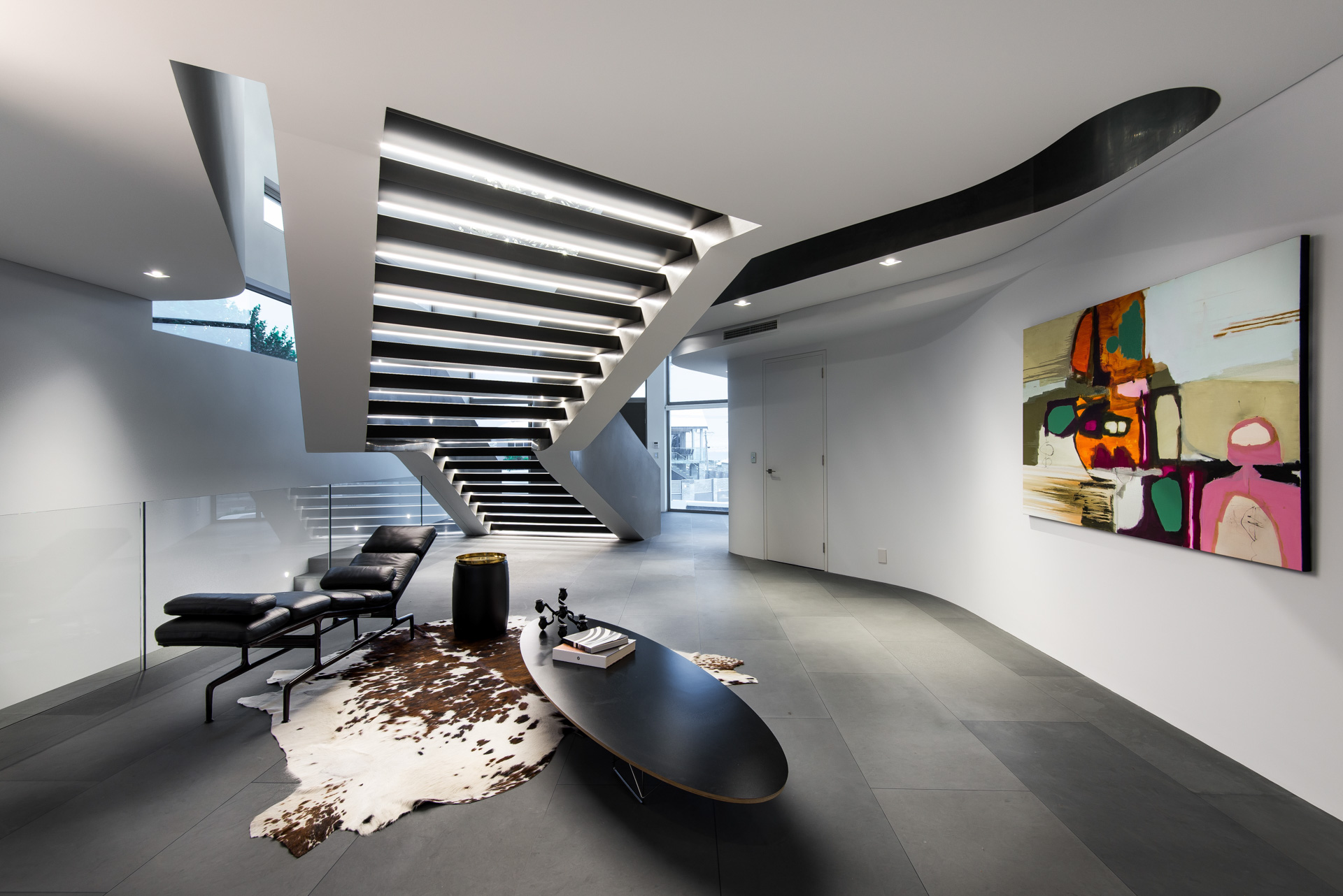 The home’s design contrasts a dramatic multi-level form with refined, high-quality internal detailing to create a sophisticated tranquil sanctuary for its discerning owners.