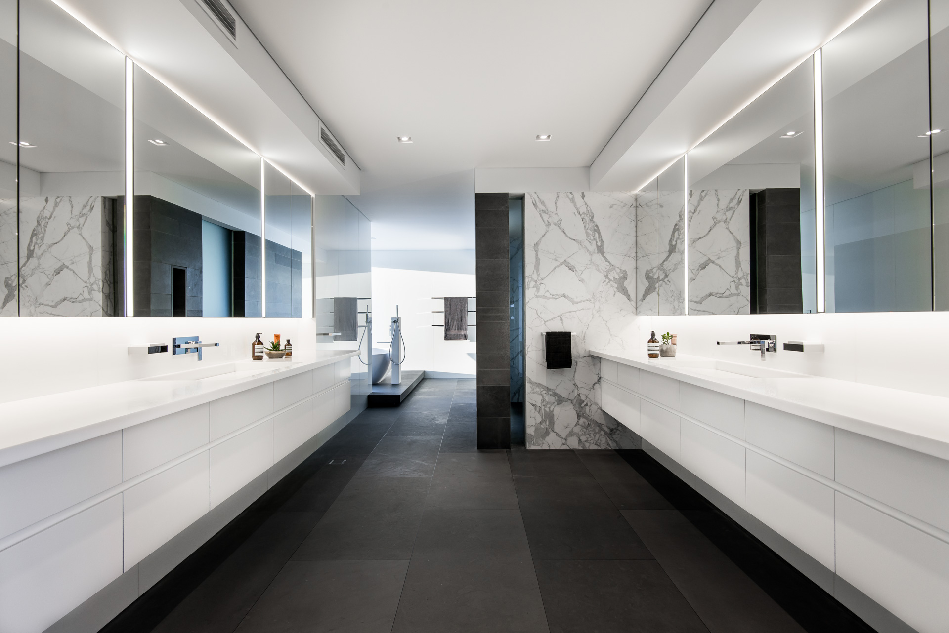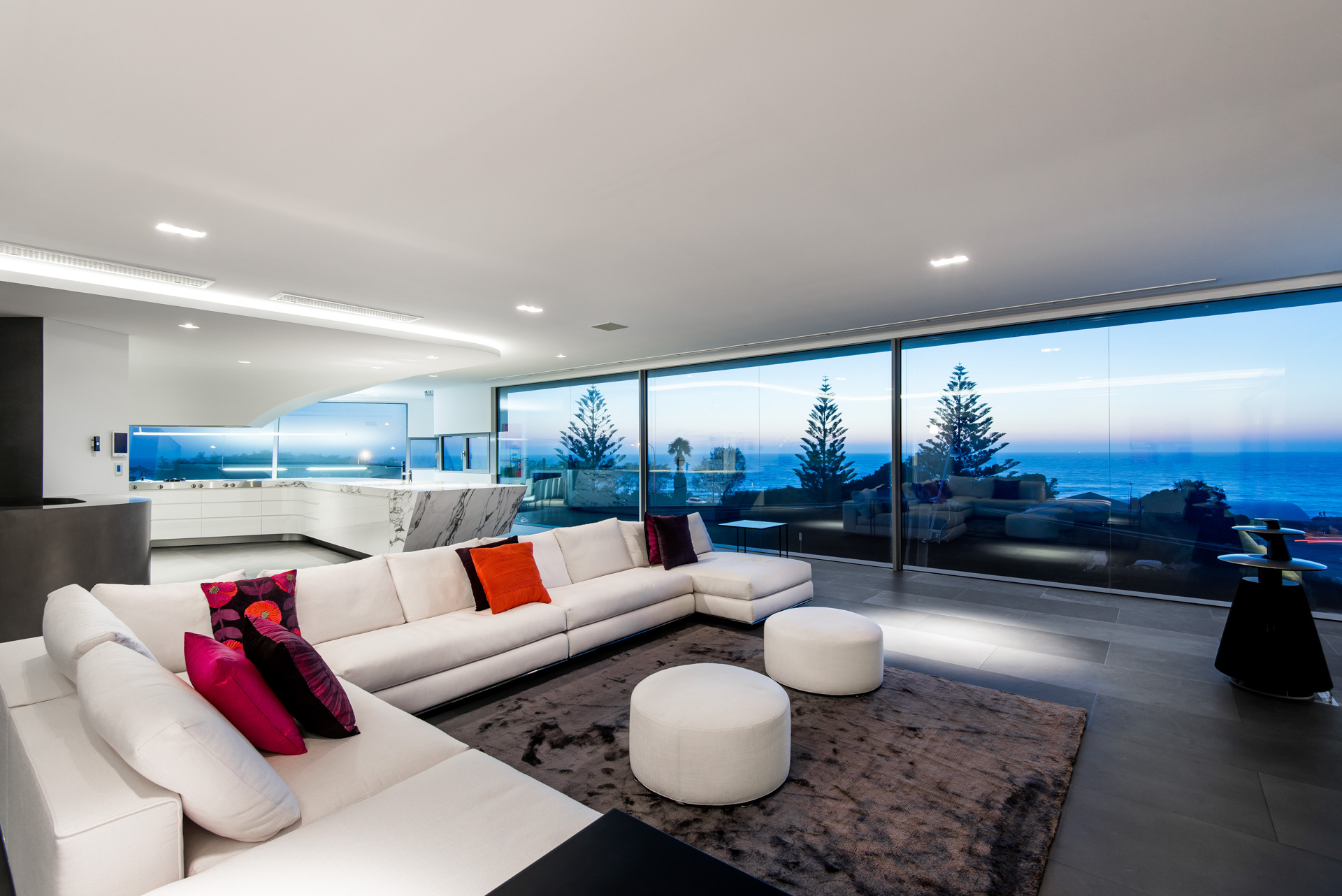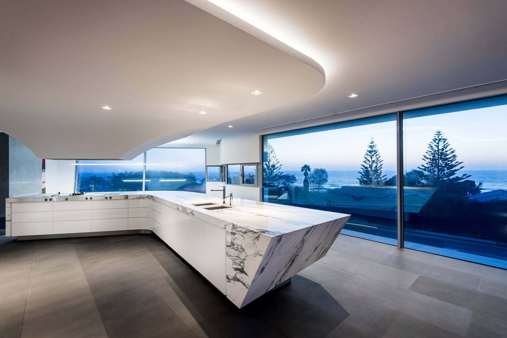 Sensuous sweeping curves flow through the kitchen bulkhead and cabinets, and these are subtly complimented by custom pendant lighting, contemporary modular furniture and black limestone flooring. A constant and deliberately minimal palette gives this home a seamless flow and a very spacious feel, ensuring the view is the home’s most celebrated feature.