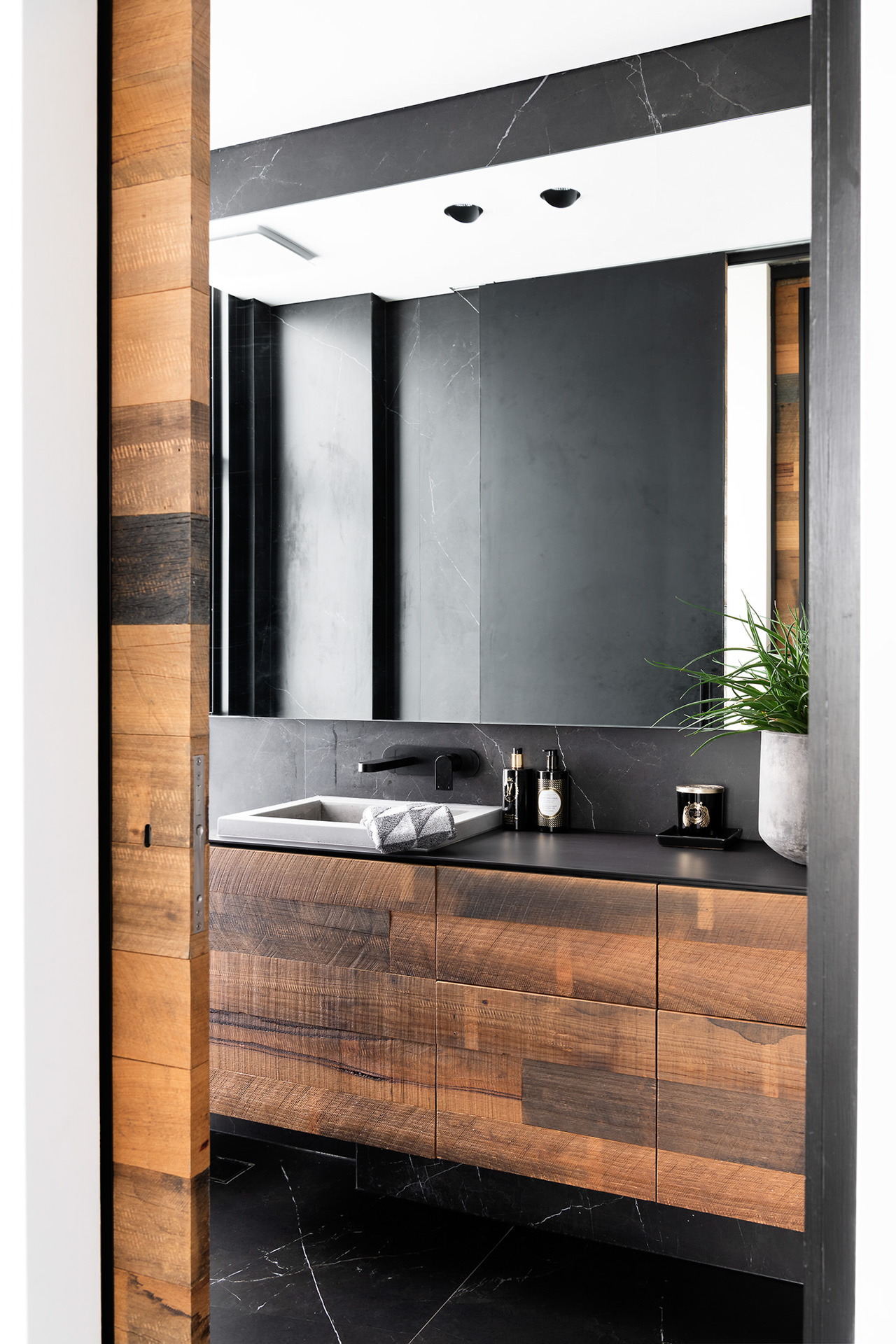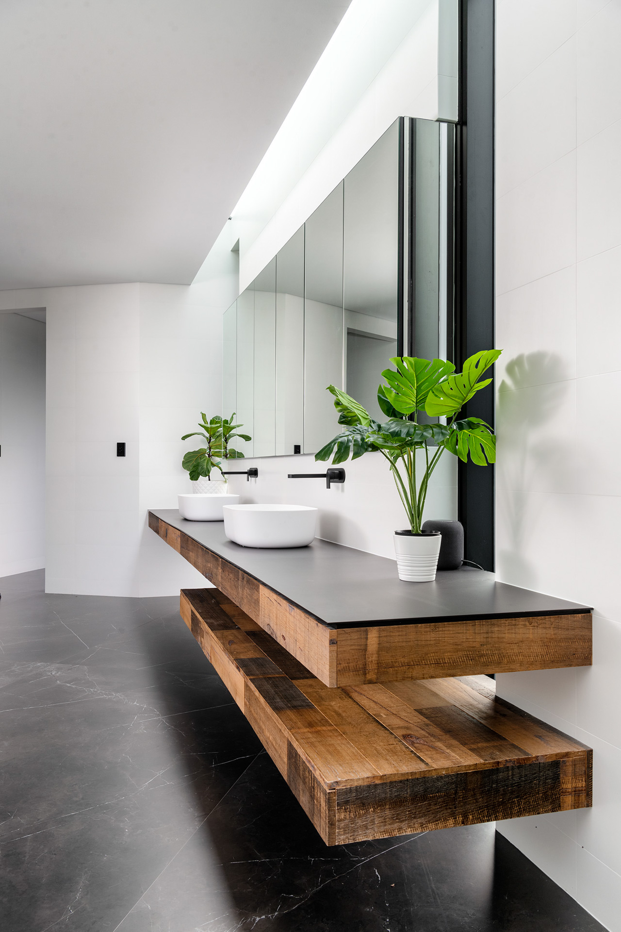 At the front of the house, a tiered, landscape pathway navigates the constraints of a sloping site and leads one up to the entry foyer. Below, the basement podium houses ample car parking and ancillary spaces as per our clients’ request.