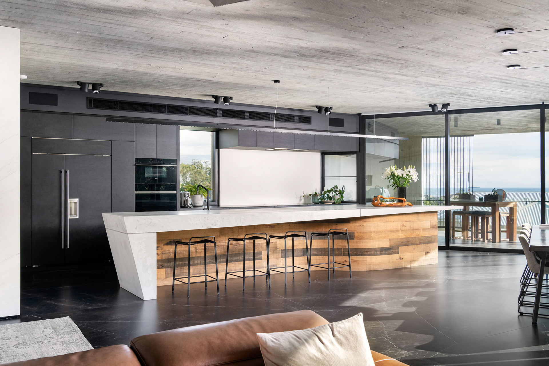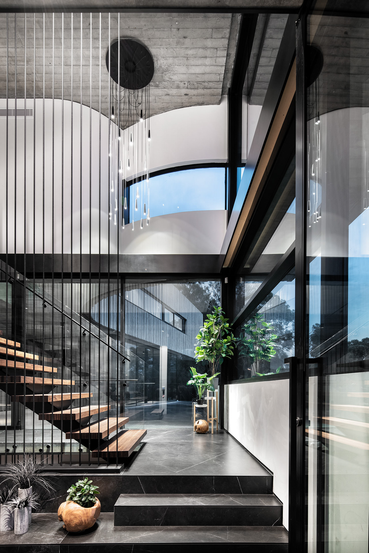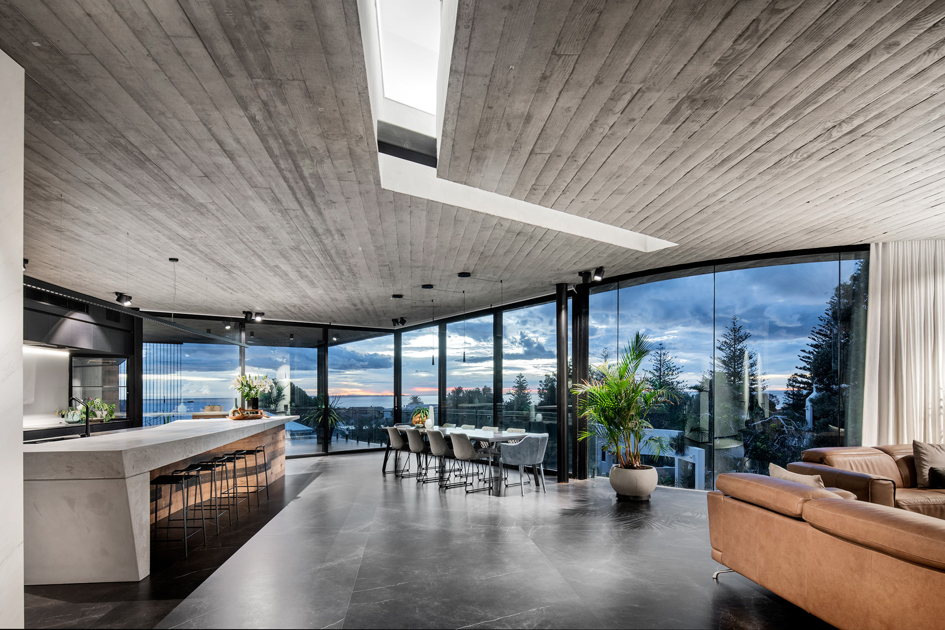 The striking, three-story single residence pushes a stripped palate of materials to its absolute limits. The upper floor expresses itself as a raw concrete shell, meticulously detailed to create a textural form; seemingly floating over an expanse of frameless glazing.