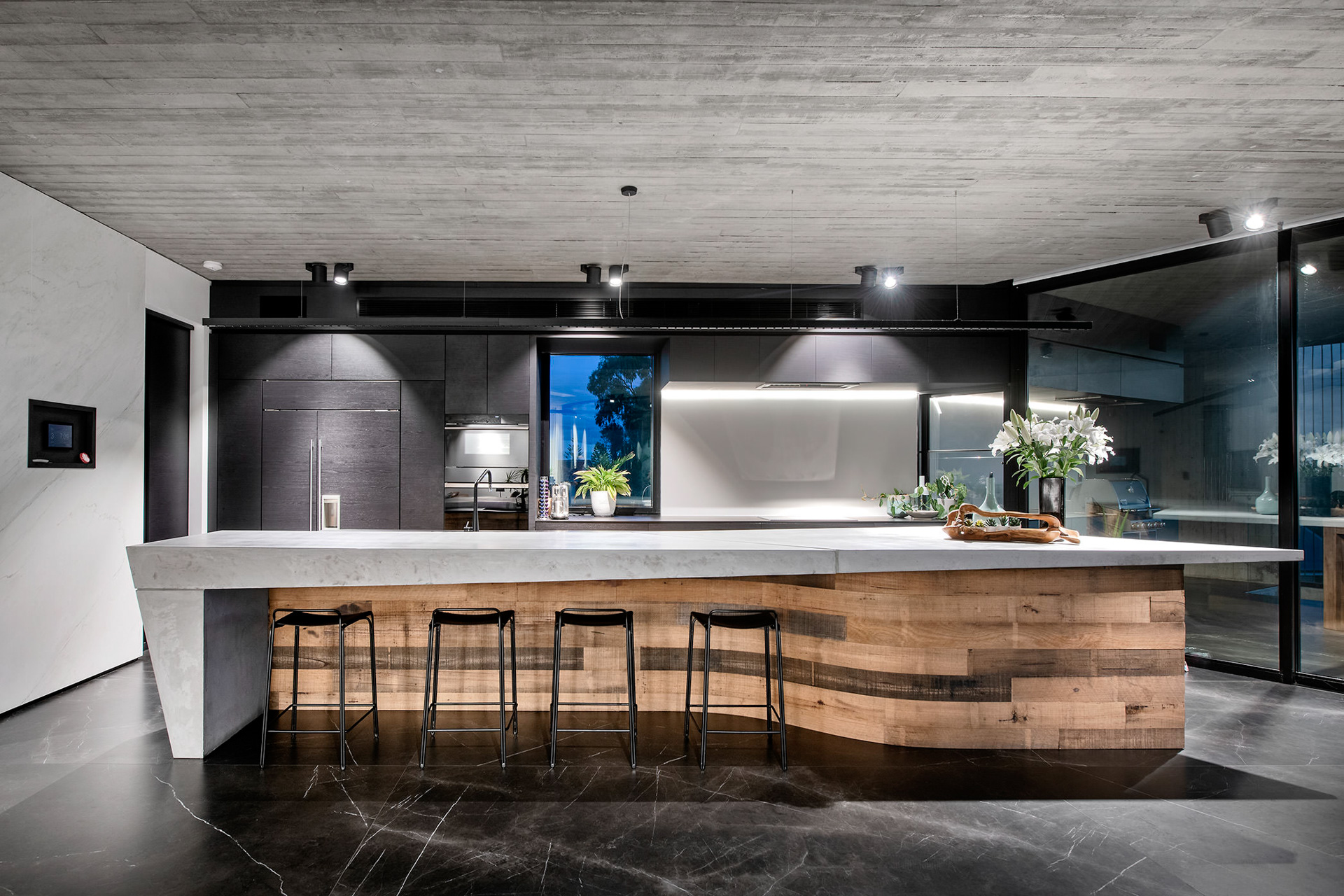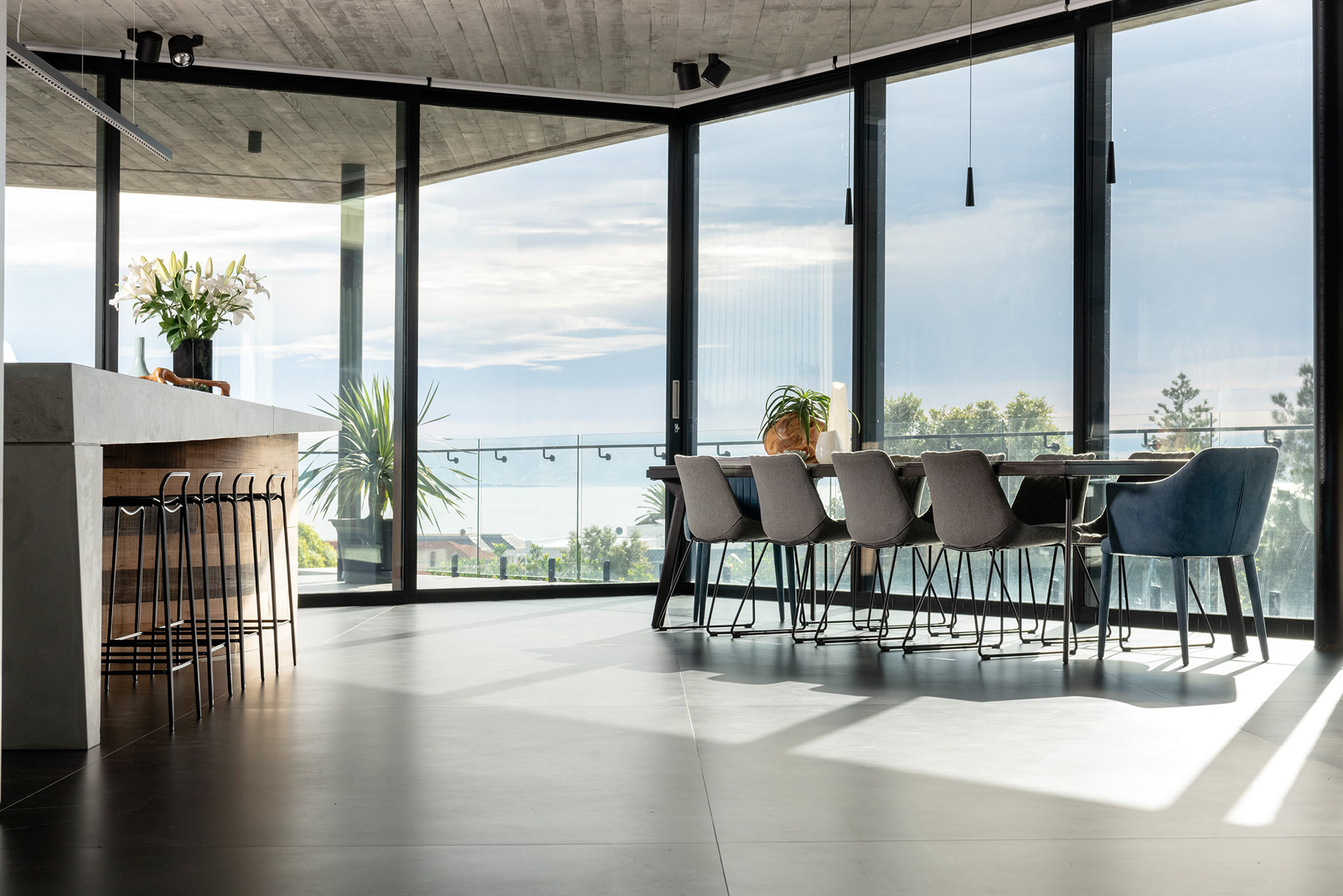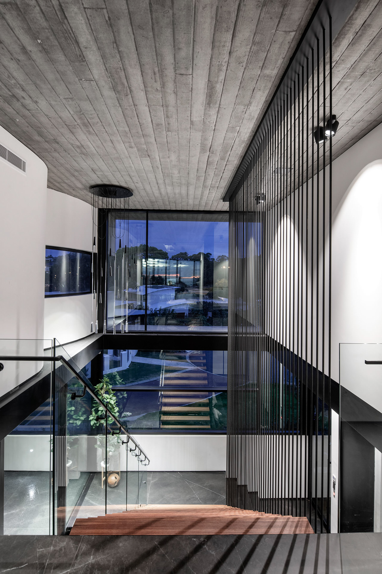The bedroom and gym wings at ground level wrap around the pool area to create privacy and intimate entertaining spaces. The dynamic form of the first floor is orientated to ensure the living spaces enjoy the magnificent view of the Indian Ocean.