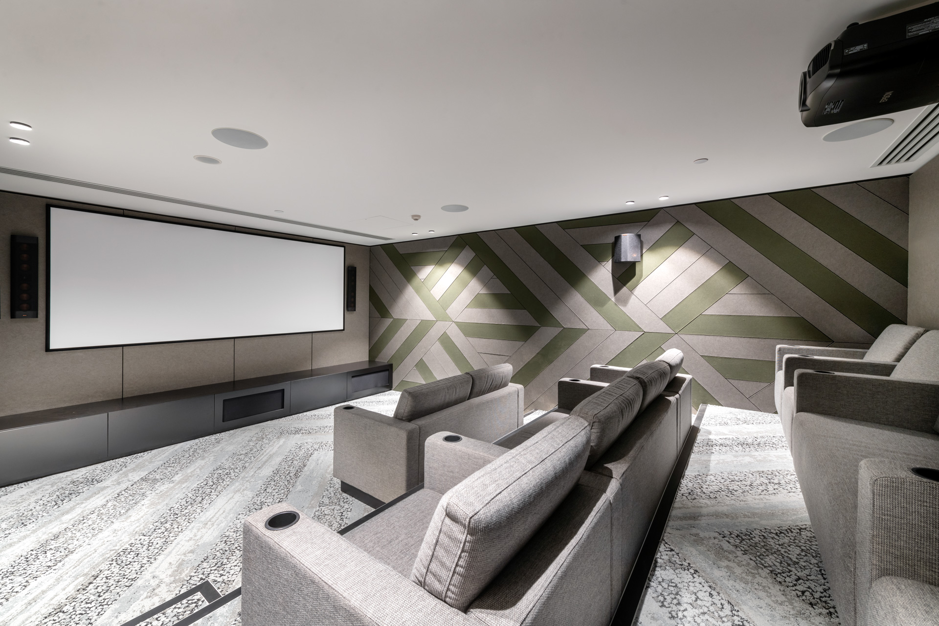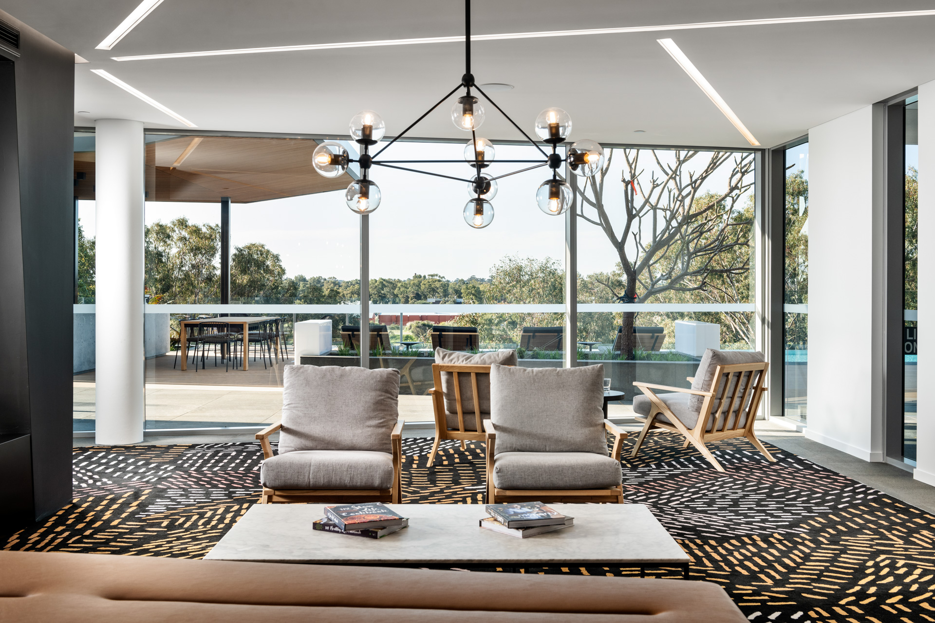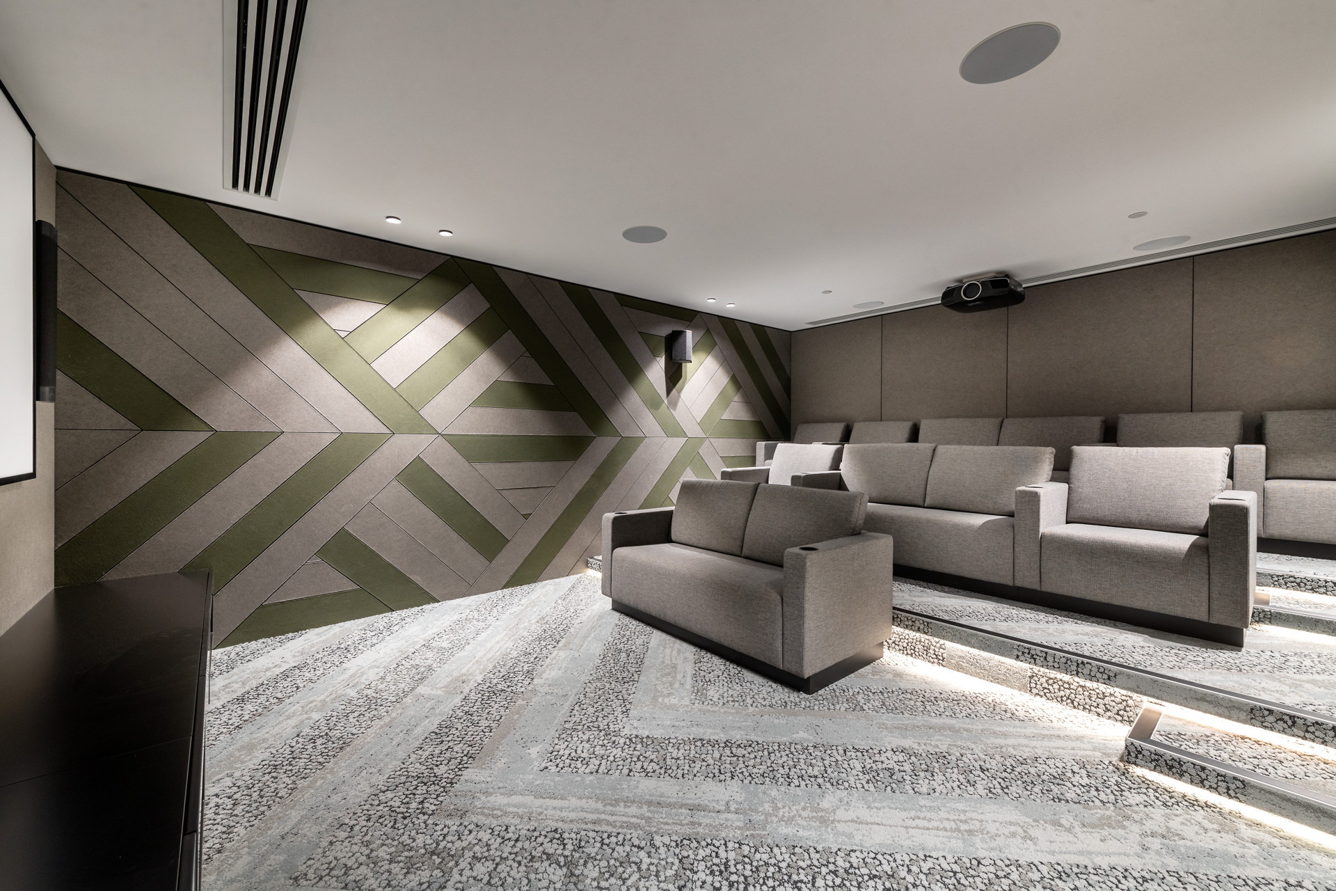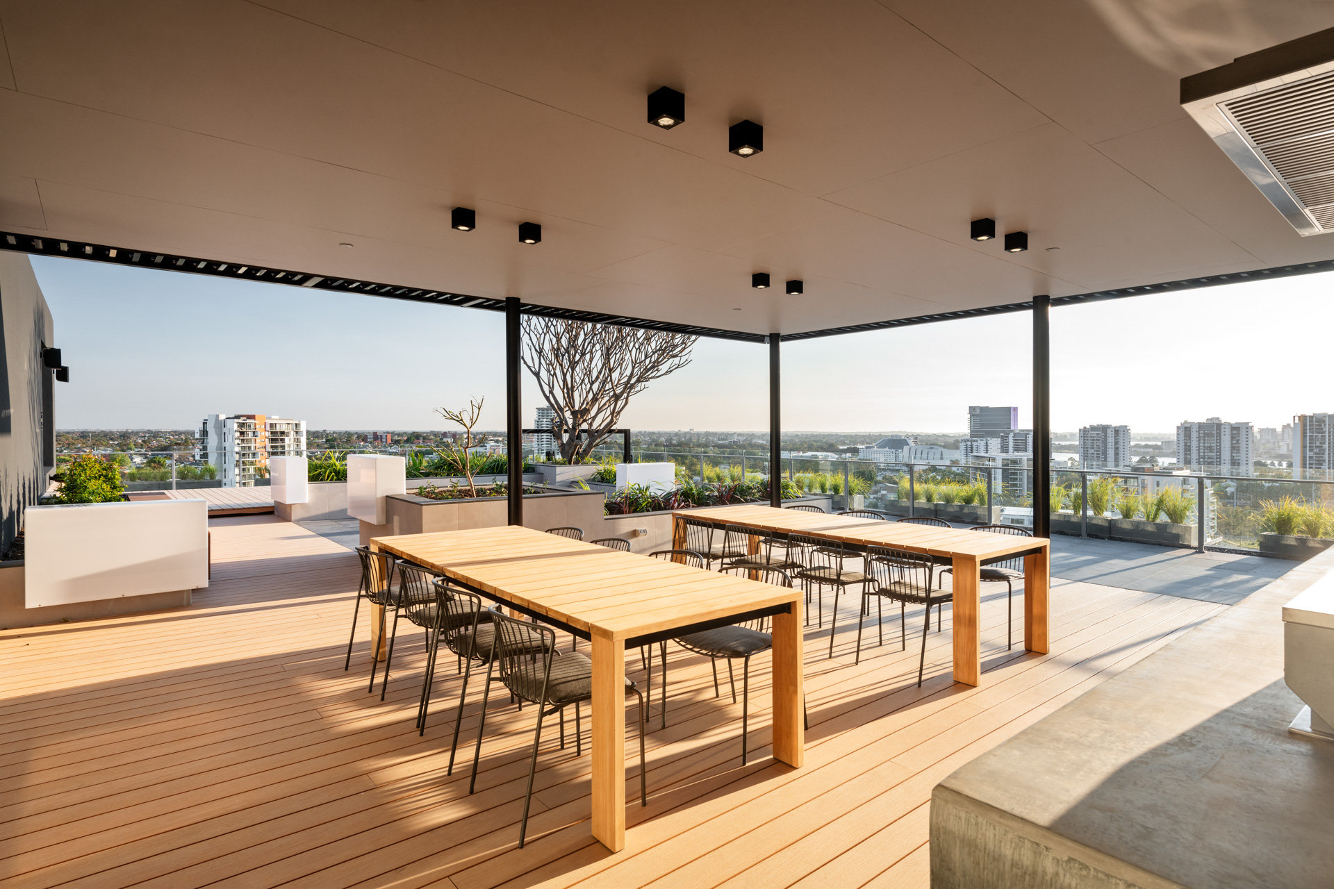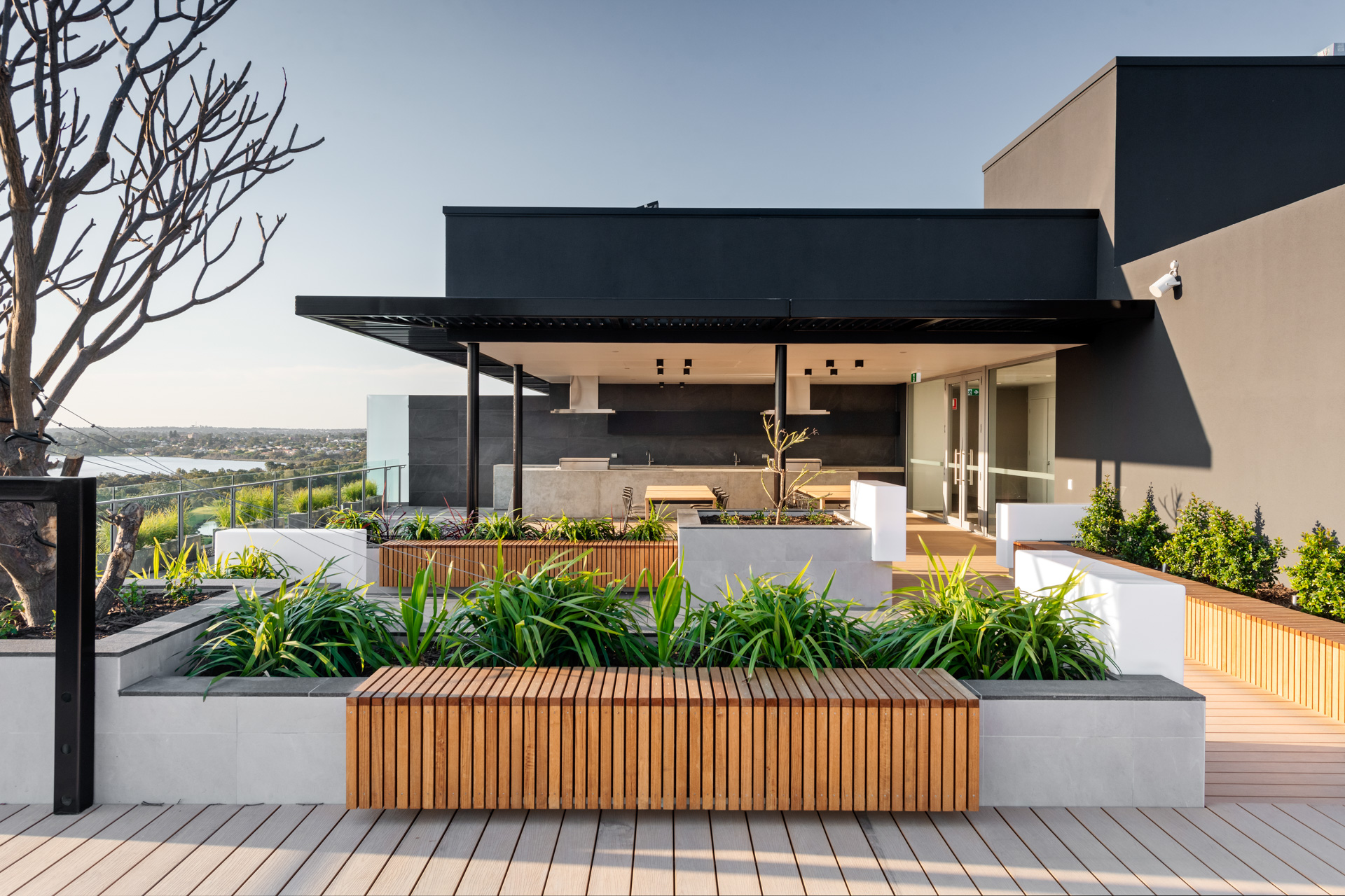 One of the building’s most attractive features is the rooftop terrace with zones for relaxing and entertaining defined by warm timber decking, flexible seating and manicured garden elements. There’s a furnished lounge, a herb garden, a barbecue area and even an outdoor cinema for movies under the stars.
