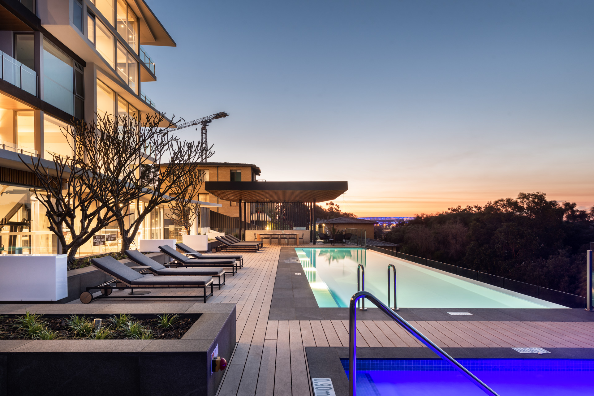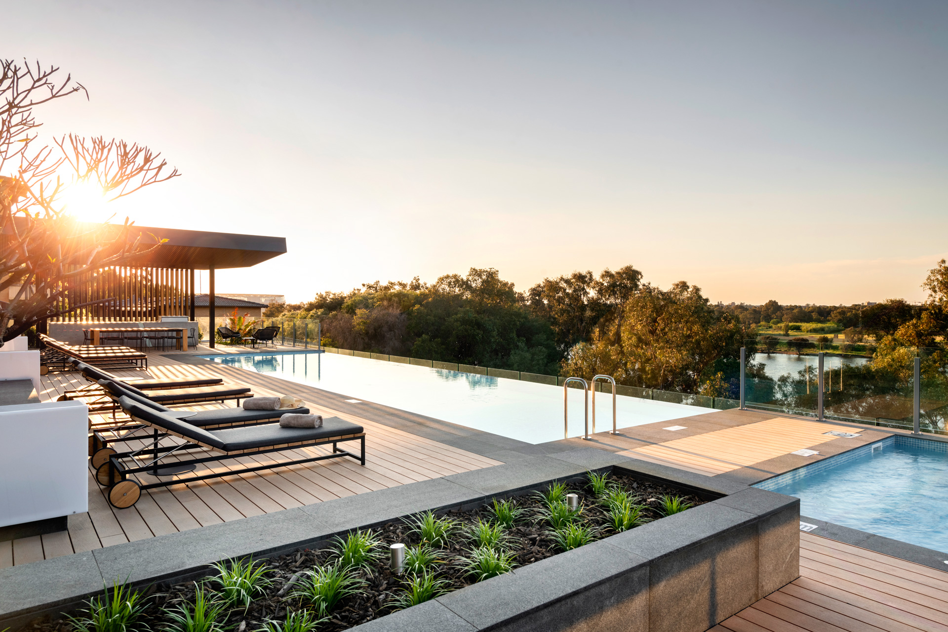 The amenities at Vantage are those of a 5-star hotel. The entrance and lobby are spacious, sophisticated and compliment the exterior’s architecture. There’s a huge resort-style, infinity-edged pool, a gym, sauna and a street level café. Extensive glazing throughout makes the most of the river and city views.