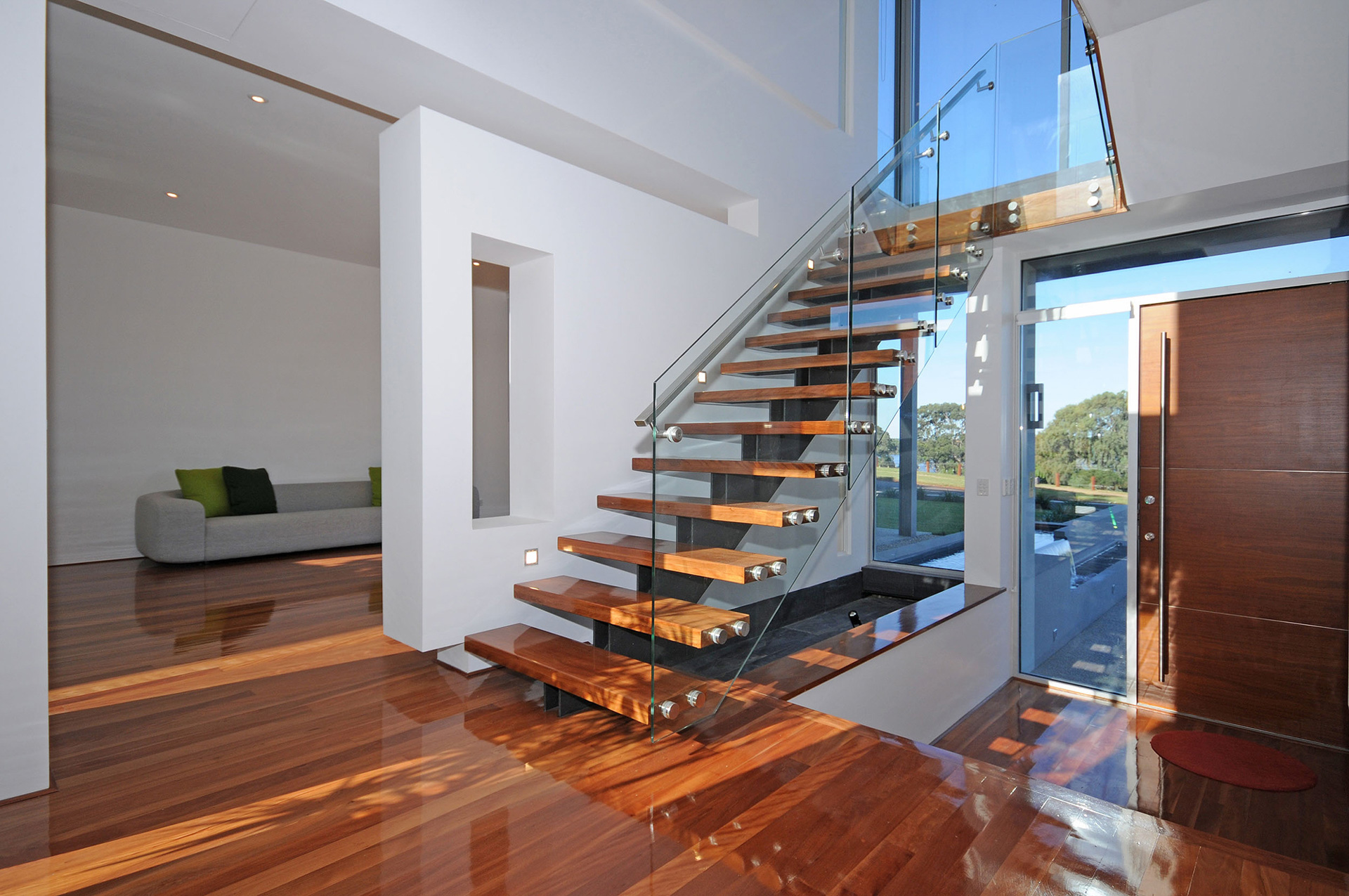 The solution was a largely L-shaped configuration which placed the main outdoor living area on the northern side of the site to most benefit from natural light. The front elevation of the house stands tall to maximise the views from the secondary living-spaces and the terraces. The front door leads to an open staircase which offers excellent views of the surrounding areas as you walk upstairs and around the house.