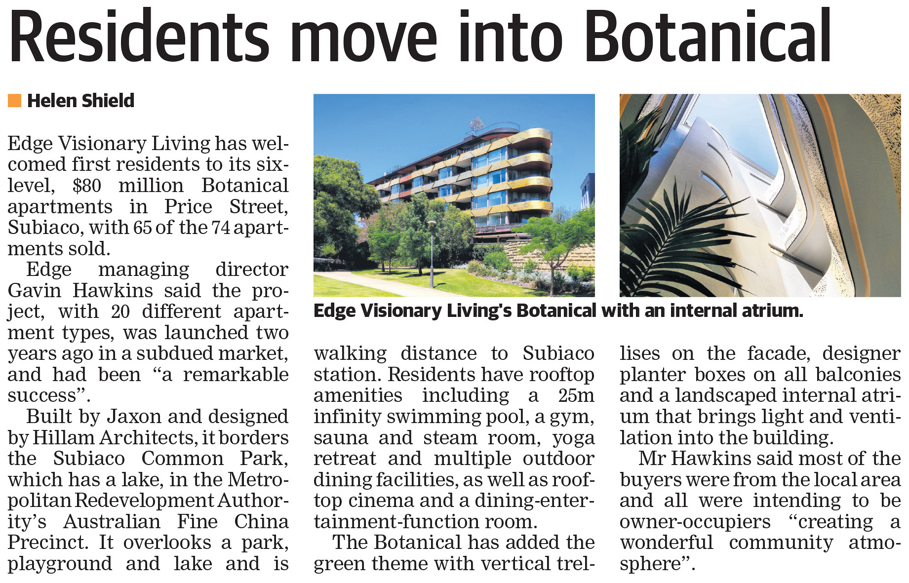 Edge Visionary Living has welcomed first residents to its six-level, $80 million Botanical apartments in Price Street, Subiaco, with 65 of the 74 apartments sold.