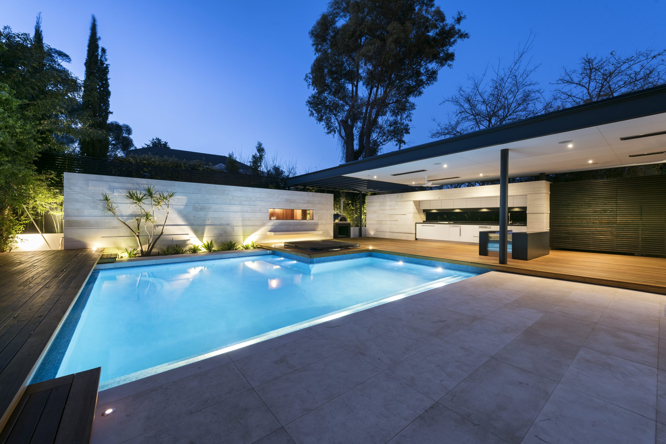“Timber decking, planting and stone feature-walls exude sophistication. Both hard and soft-landscaping were chosen to ensure the outdoor spaces complemented the sleek architecture.”