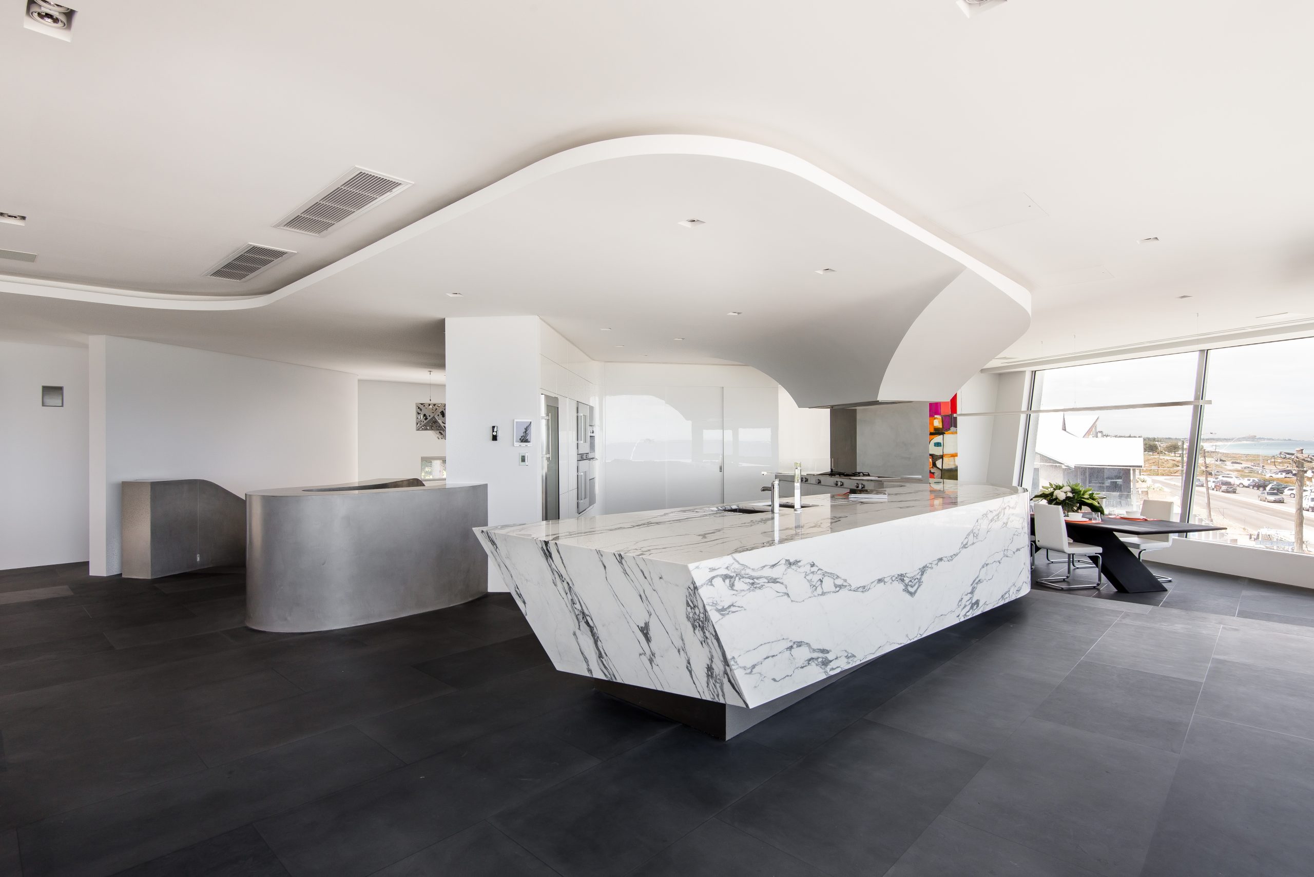A dramatic staircase spirals its way to the second floor, where luxury is heightened by the master suite with an expansive walk-in wardrobe any fashionista would struggle to fill, as well as an ensuite overlooking a park and the Indian Ocean.