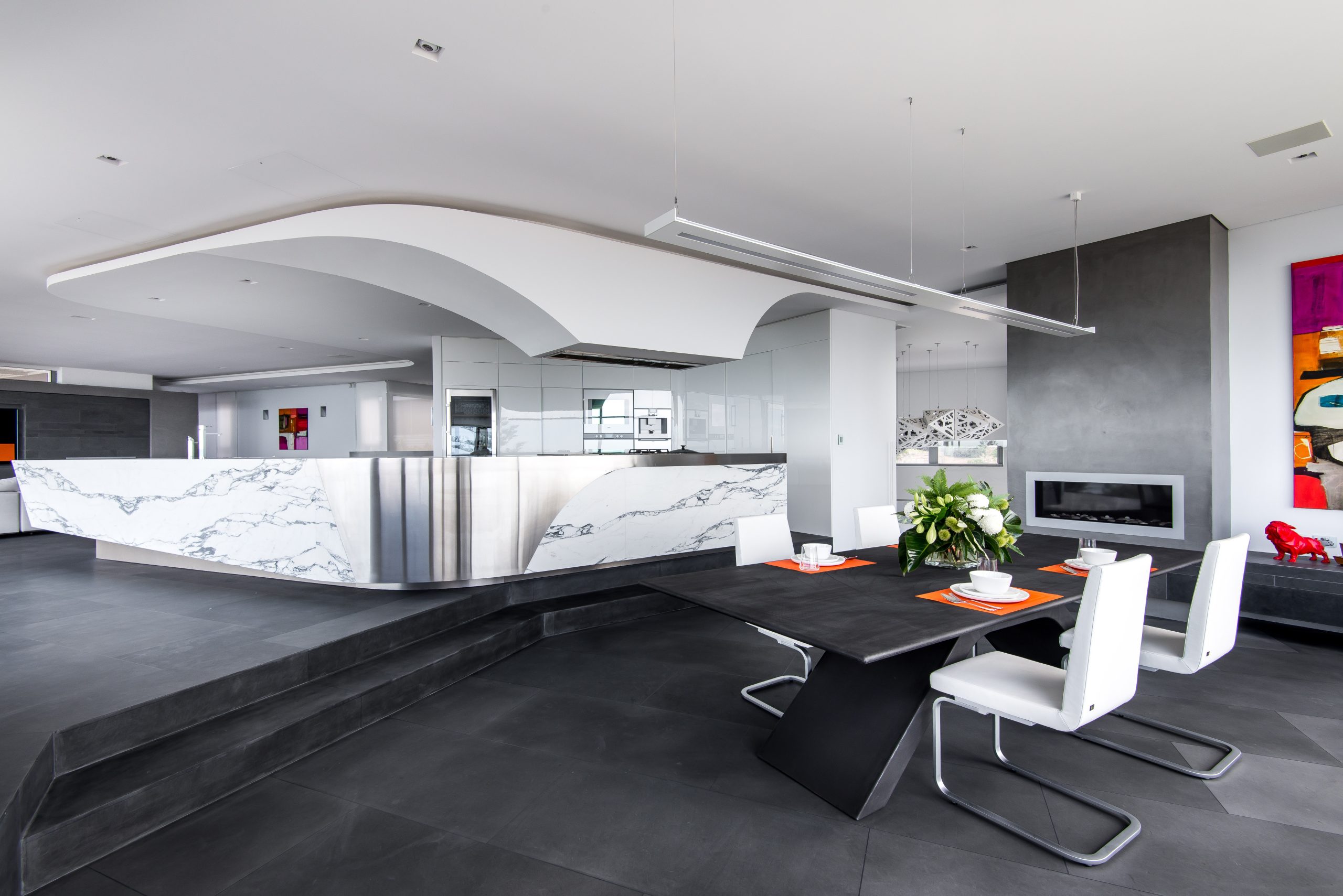 An enormous open-plan kitchen, living and dining area is ideal for casual family time, allowing everyone to come together in style.